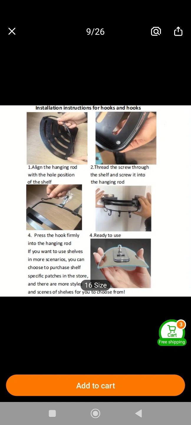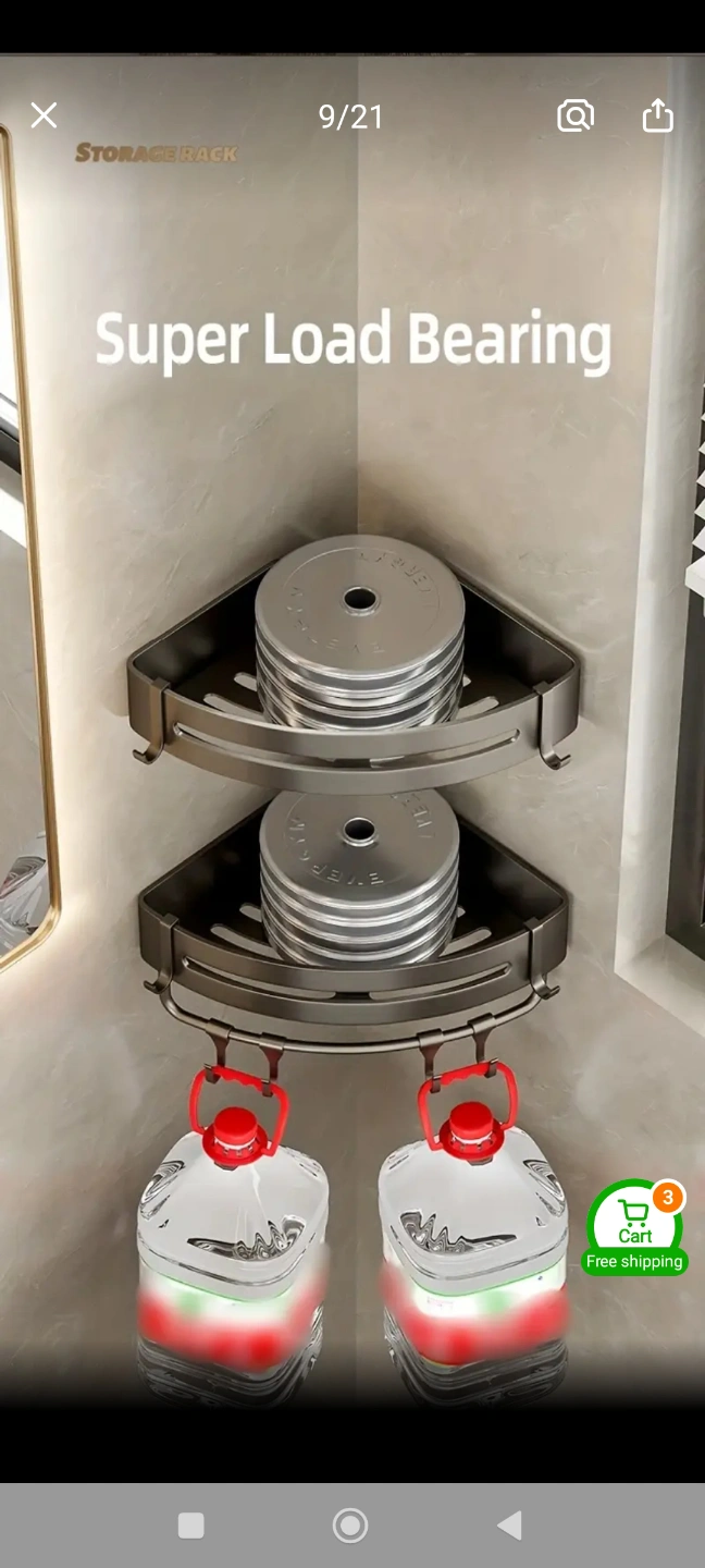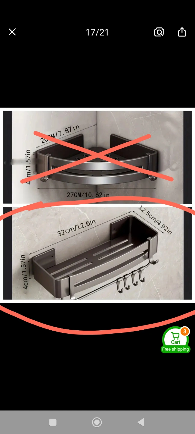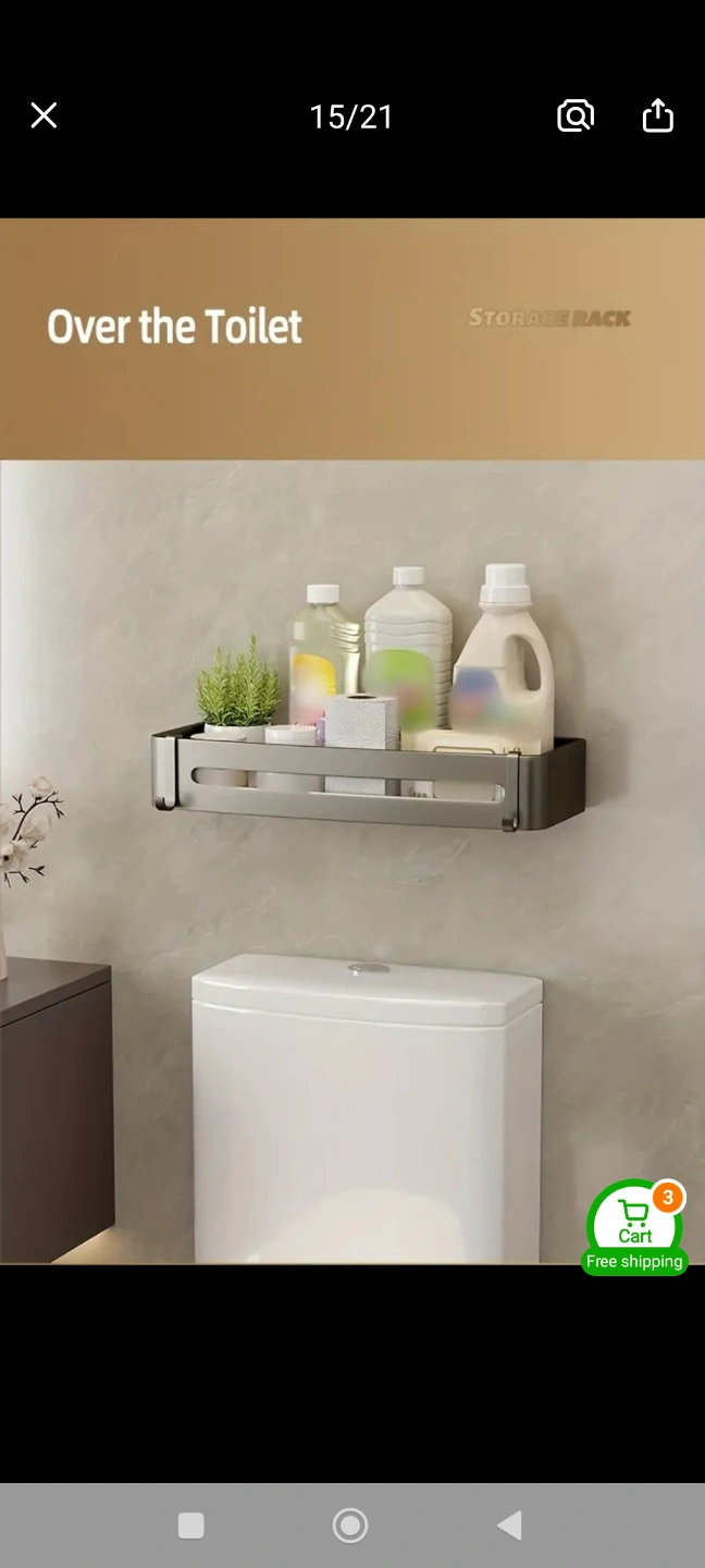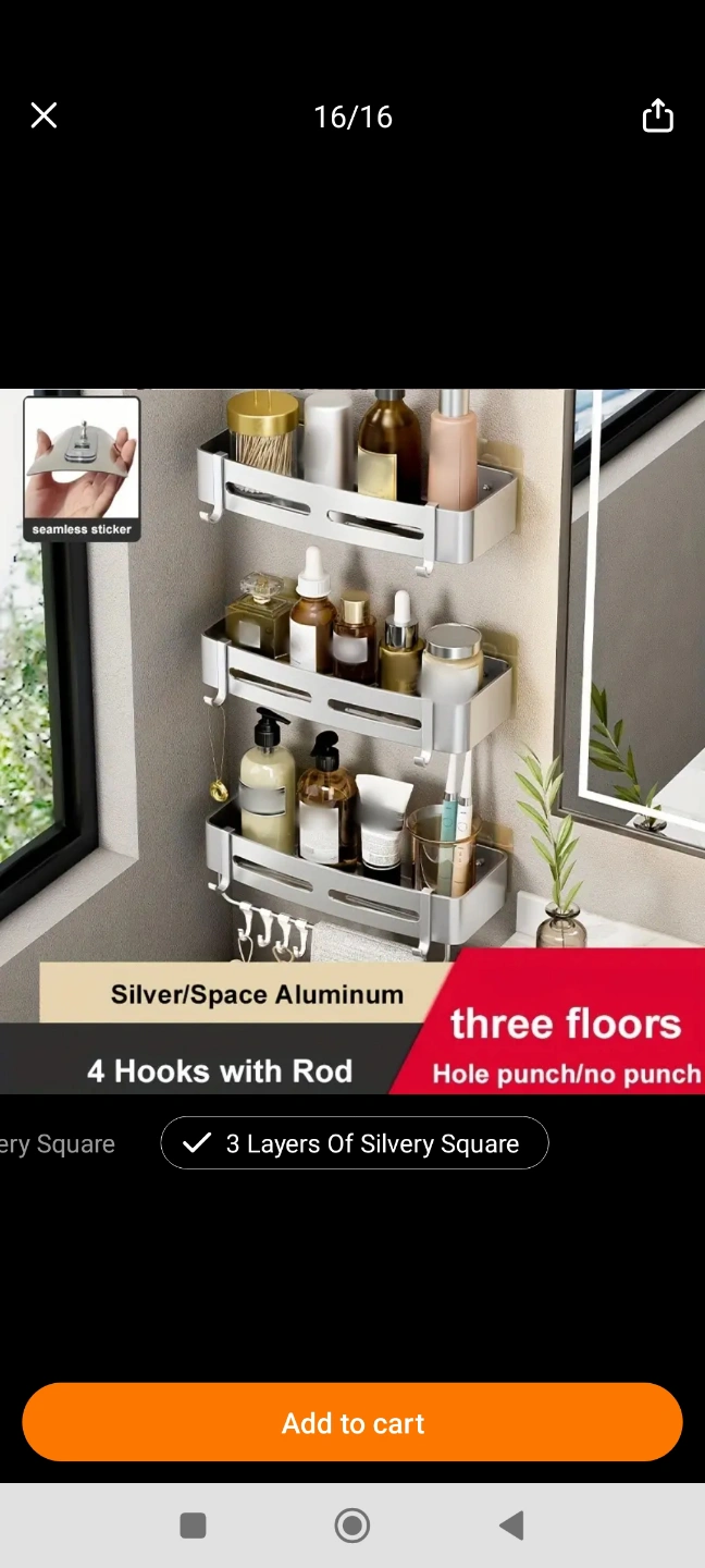 Space-saving bathroom shelf. Aluminum construction. Three shelves and four hooks. Easy installation. Great for shampoo, conditioner, and other toiletries. Brand New