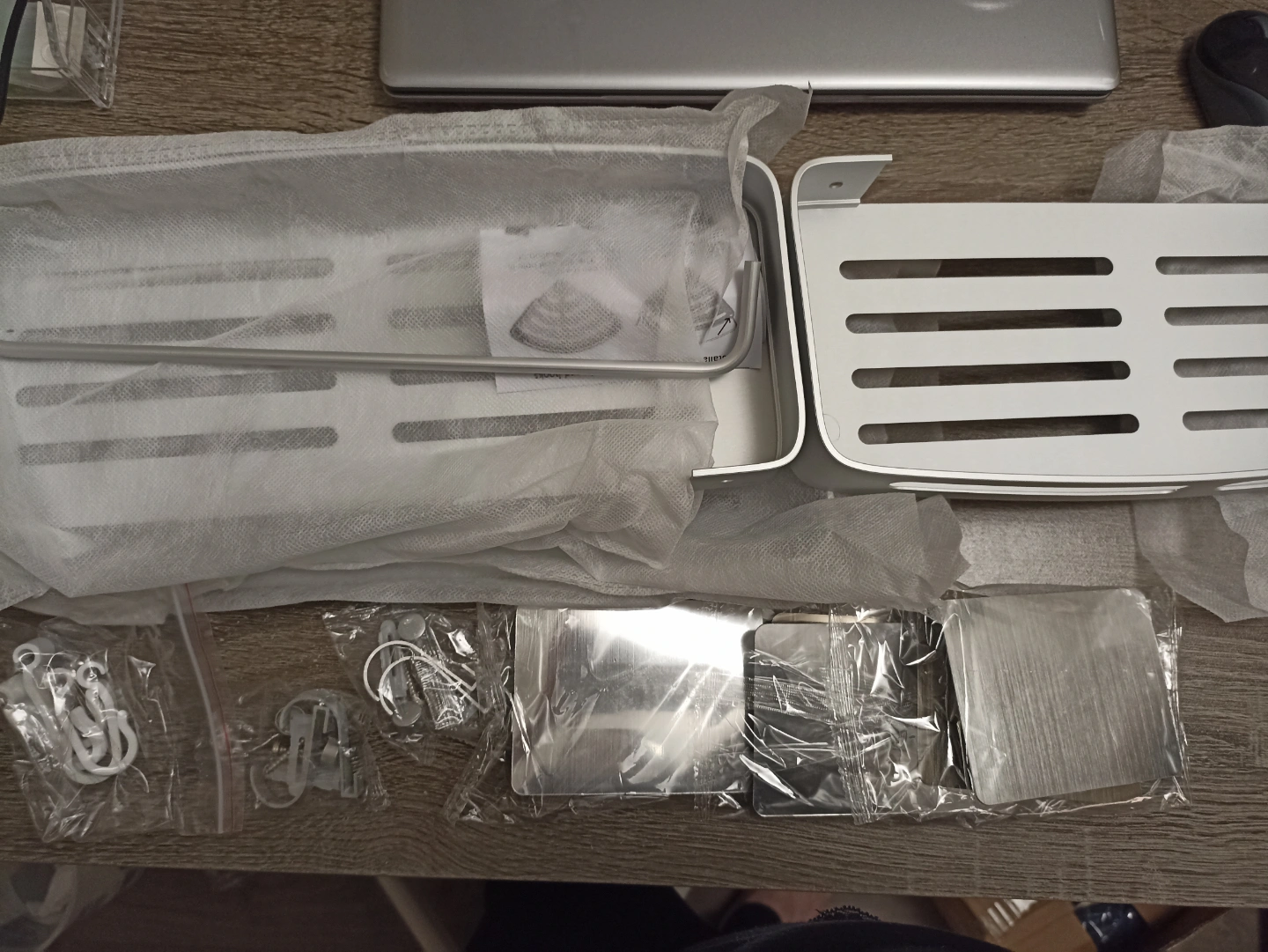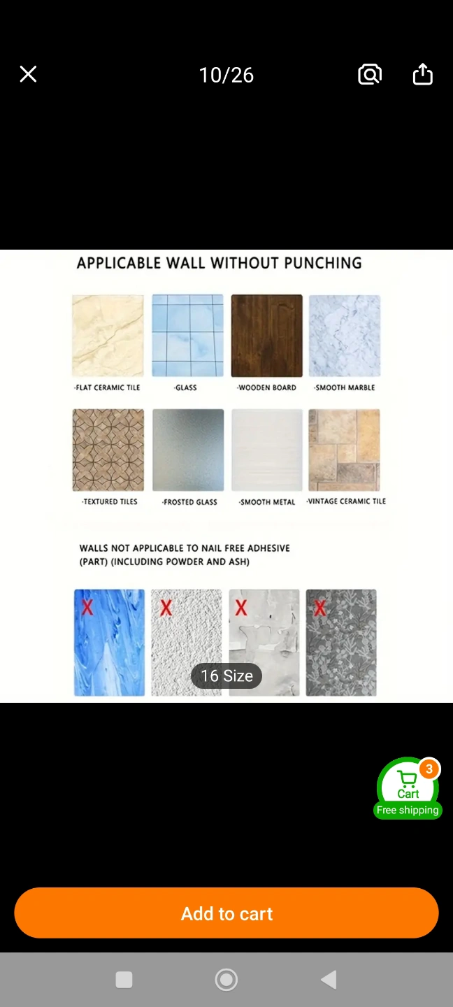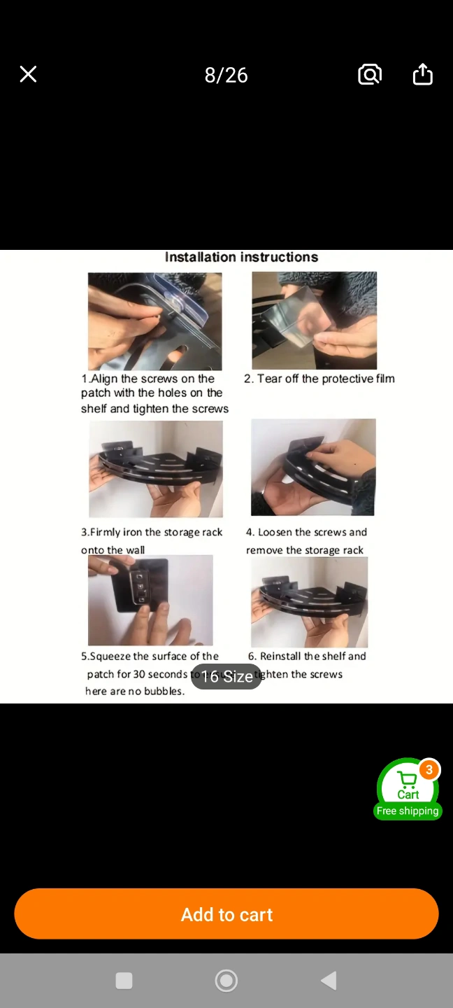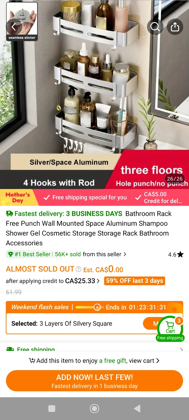 Space-saving bathroom shelf. Aluminum construction. Three shelves and four hooks. Easy installation. Great for shampoo, conditioner, and other toiletries. Brand New