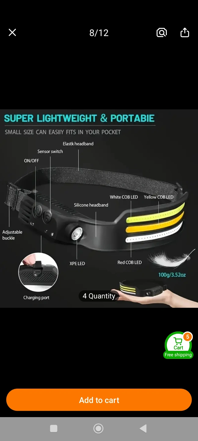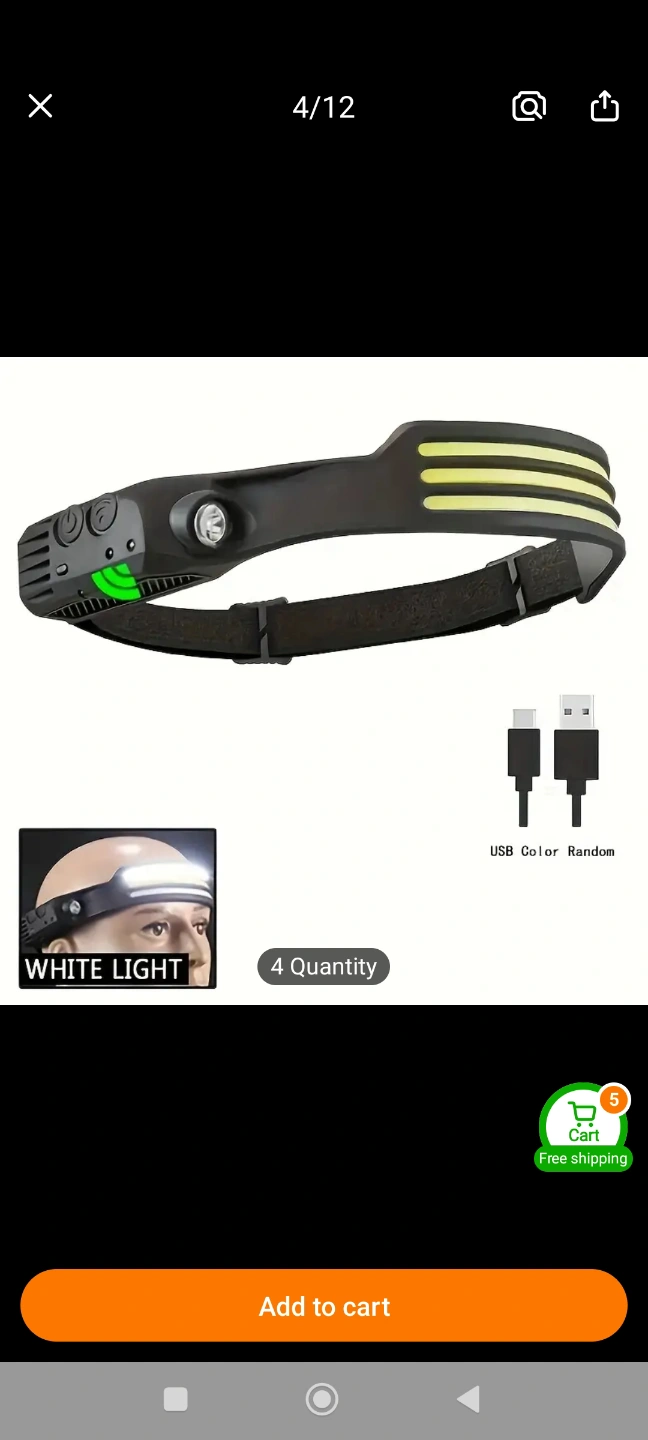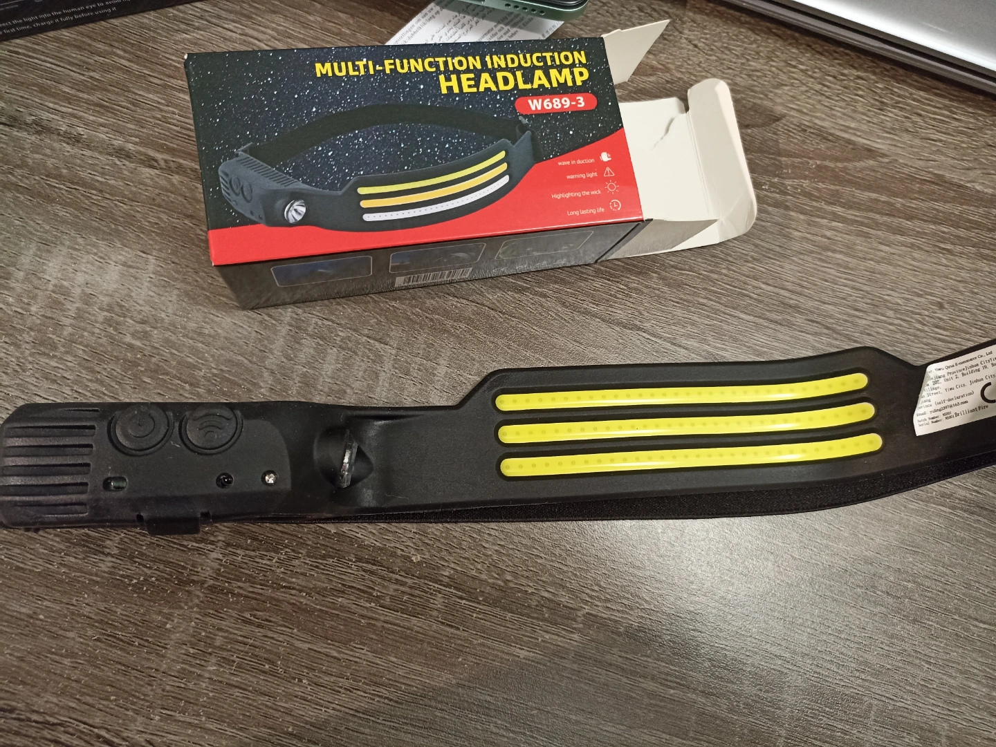 Rechargeable headlamp with USB charging. Features three light strips, inductive switch, and sensor switch. Lightweight and portable.