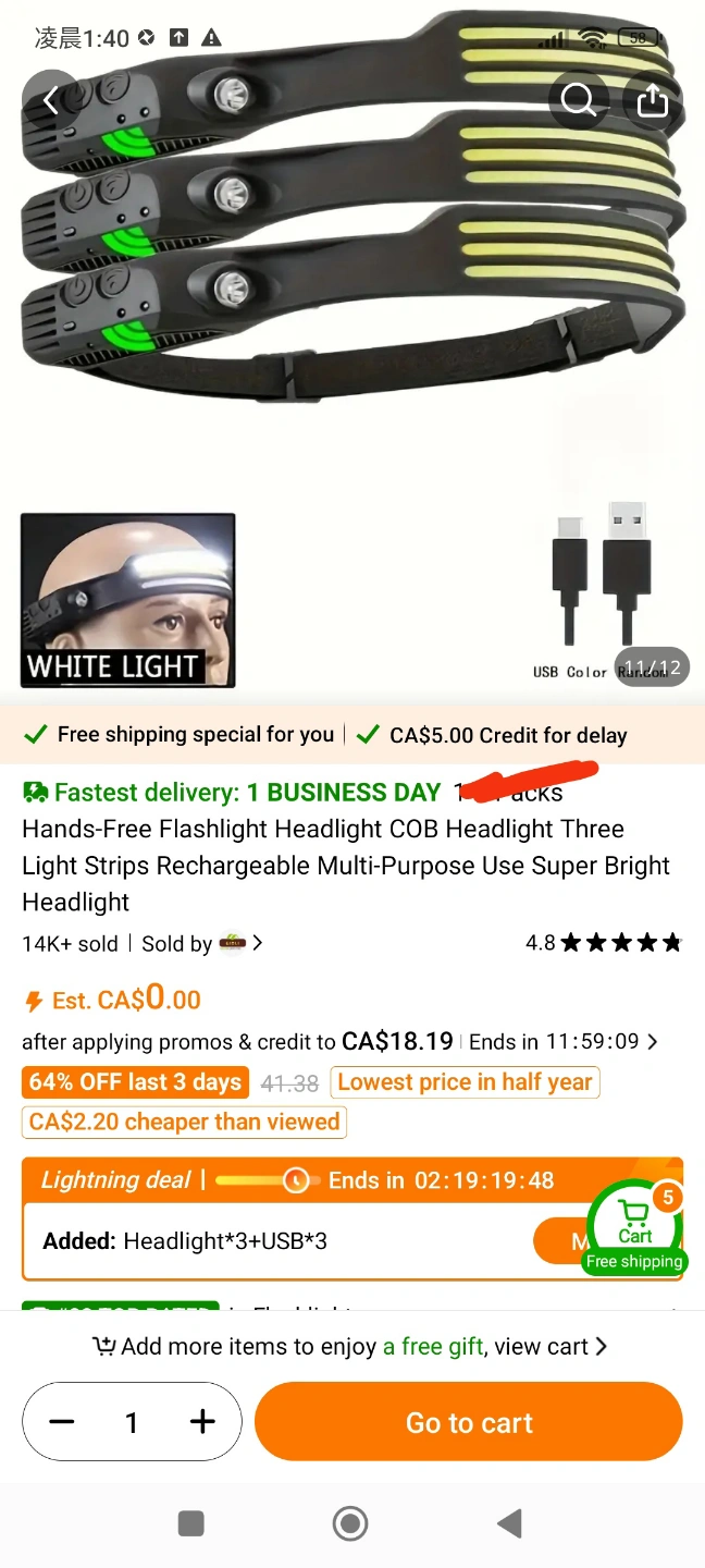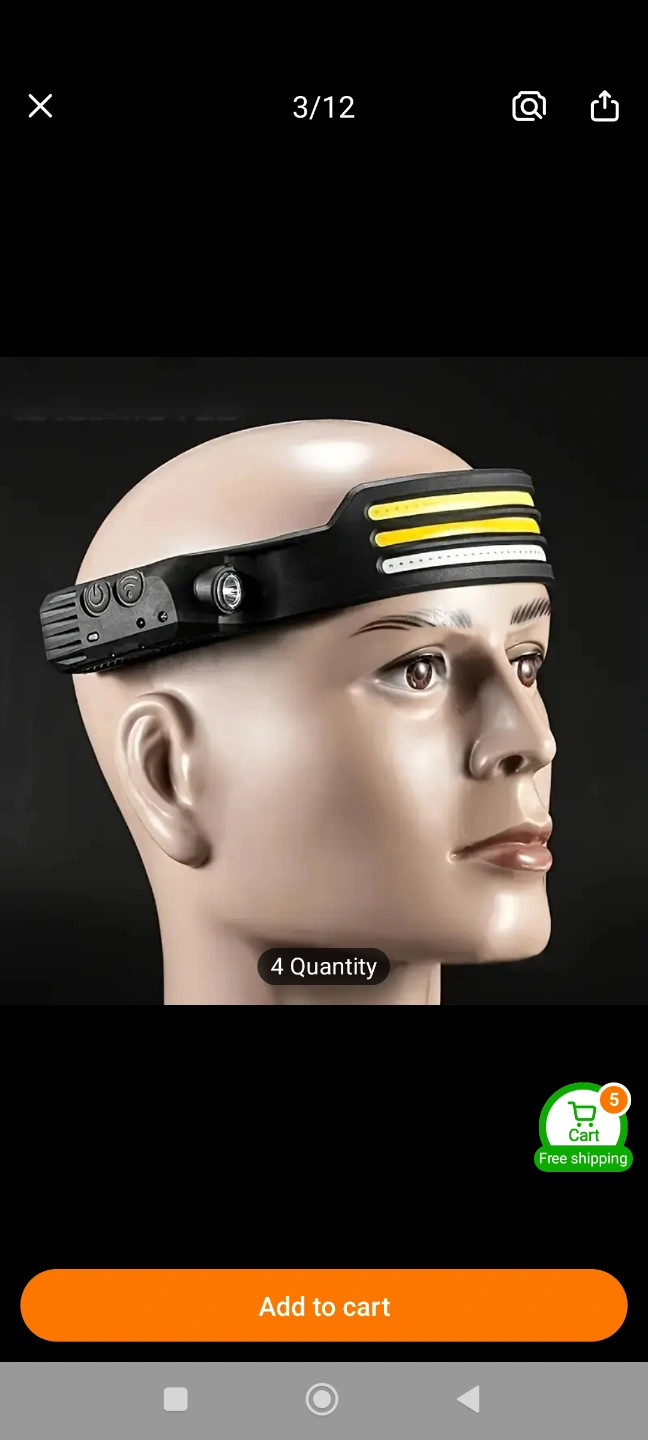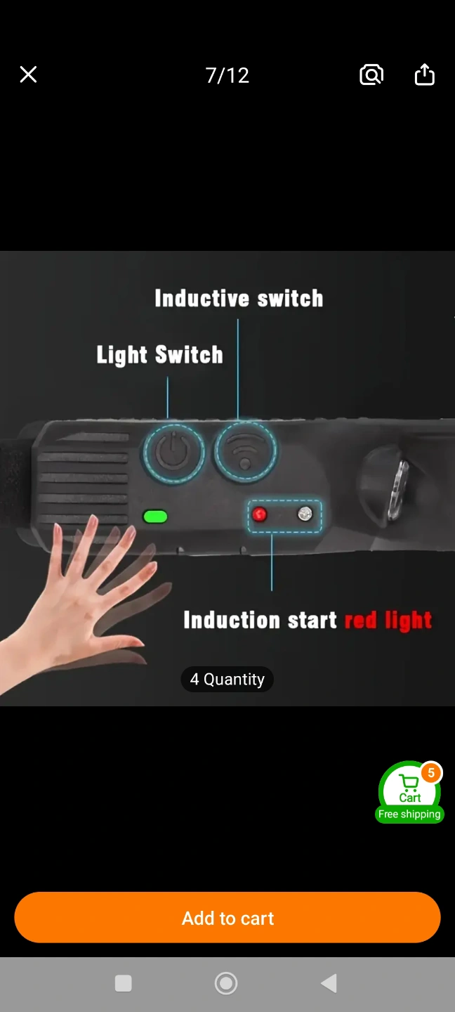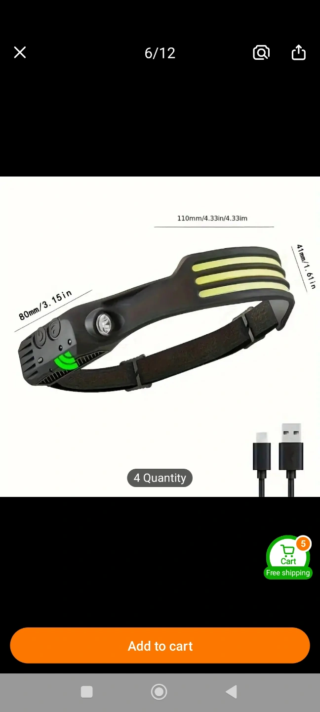 Rechargeable headlamp with USB charging. Features three light strips, inductive switch, and sensor switch. Lightweight and portable.