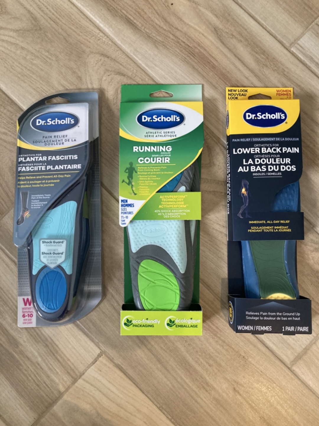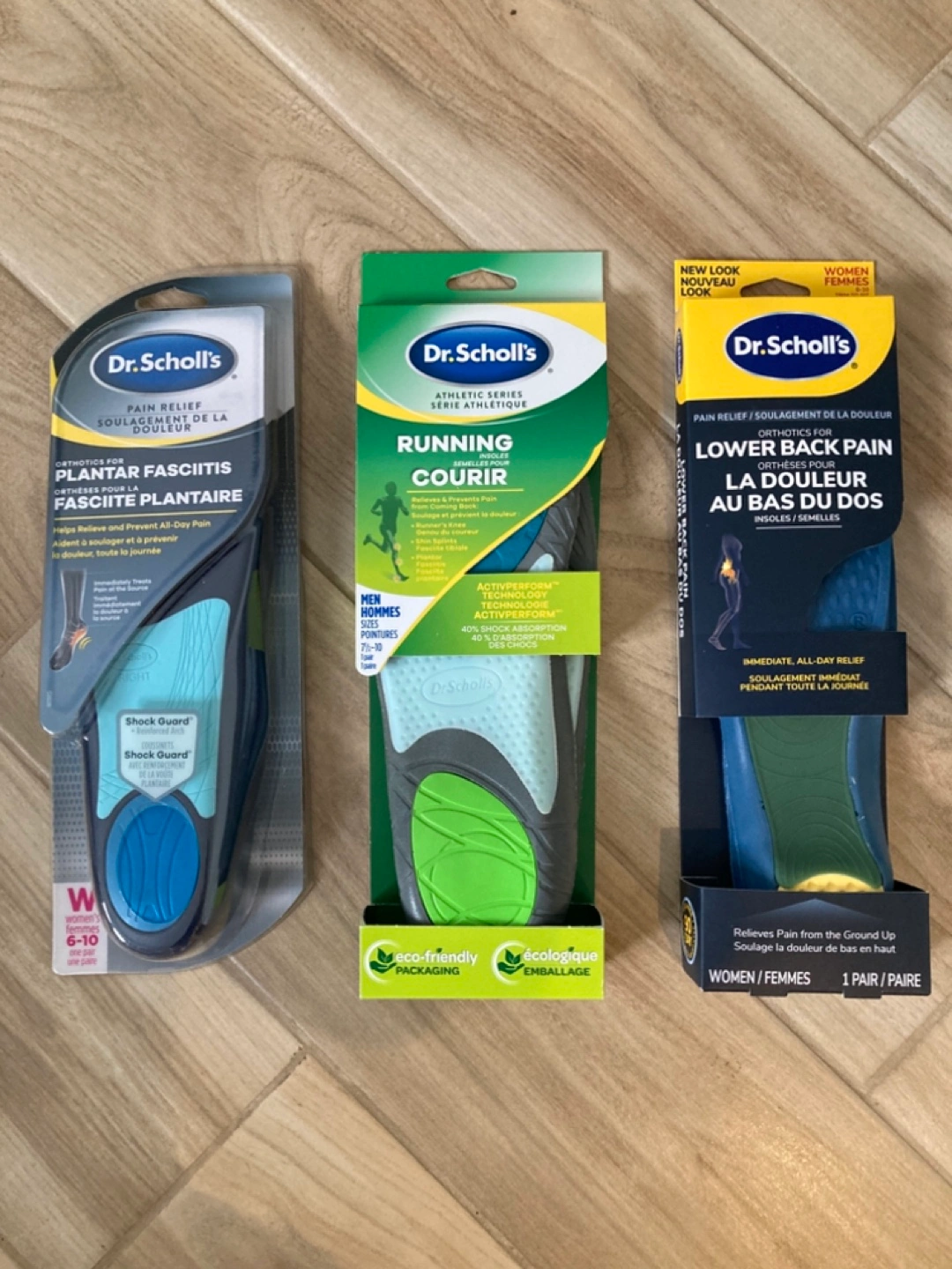 Three pairs of Dr. Scholl's insoles. One pair for plantar fasciitis (women's sizes 6-10), one pair for running (men's sizes 7-10), and one pair for lower back pain (women's). New in packaging.