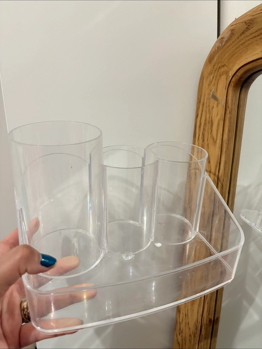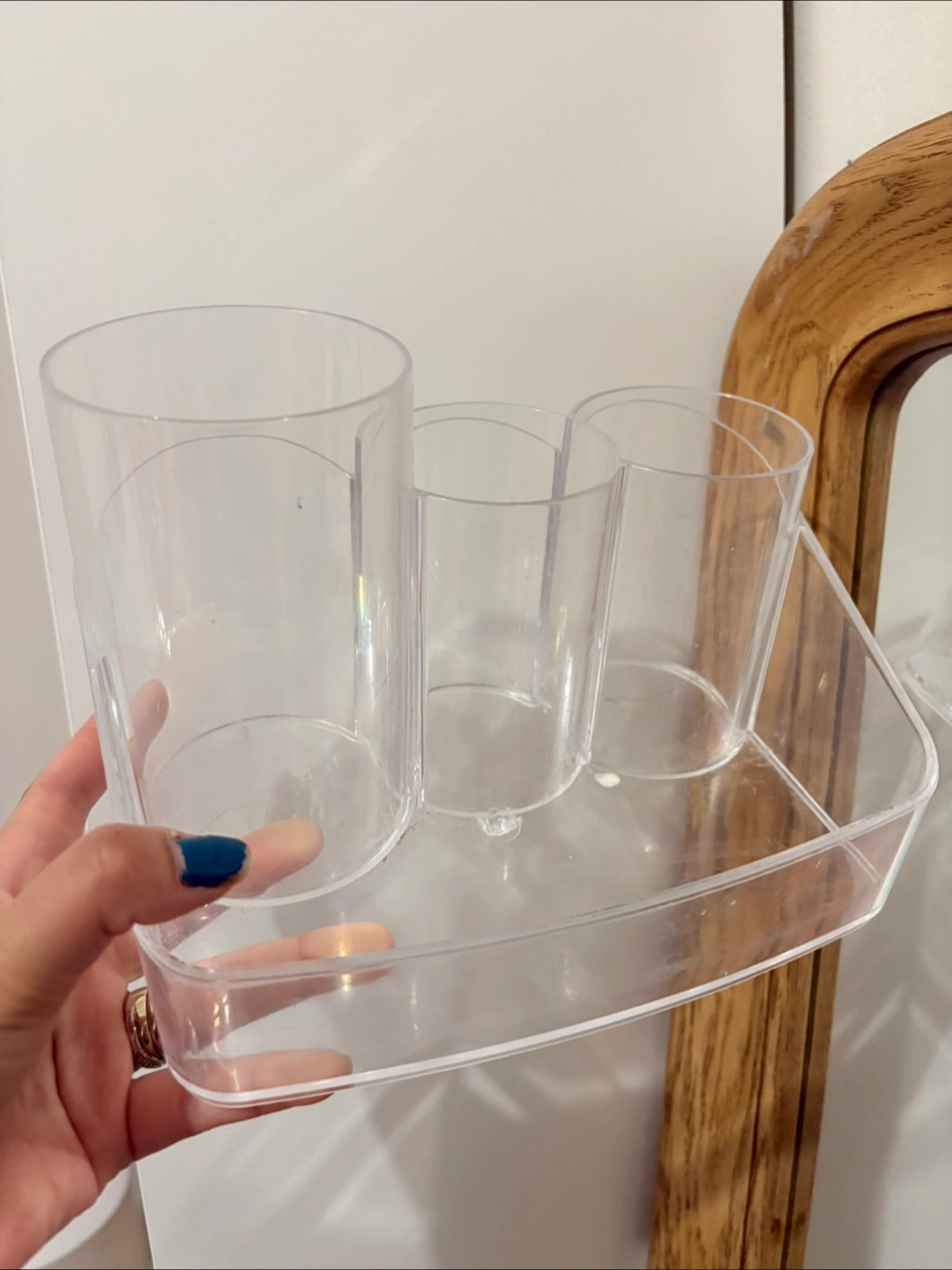 Three-compartment organiser. Perfect for storing makeup brushes, pencils, or other small items. Clear acrylic construction.
