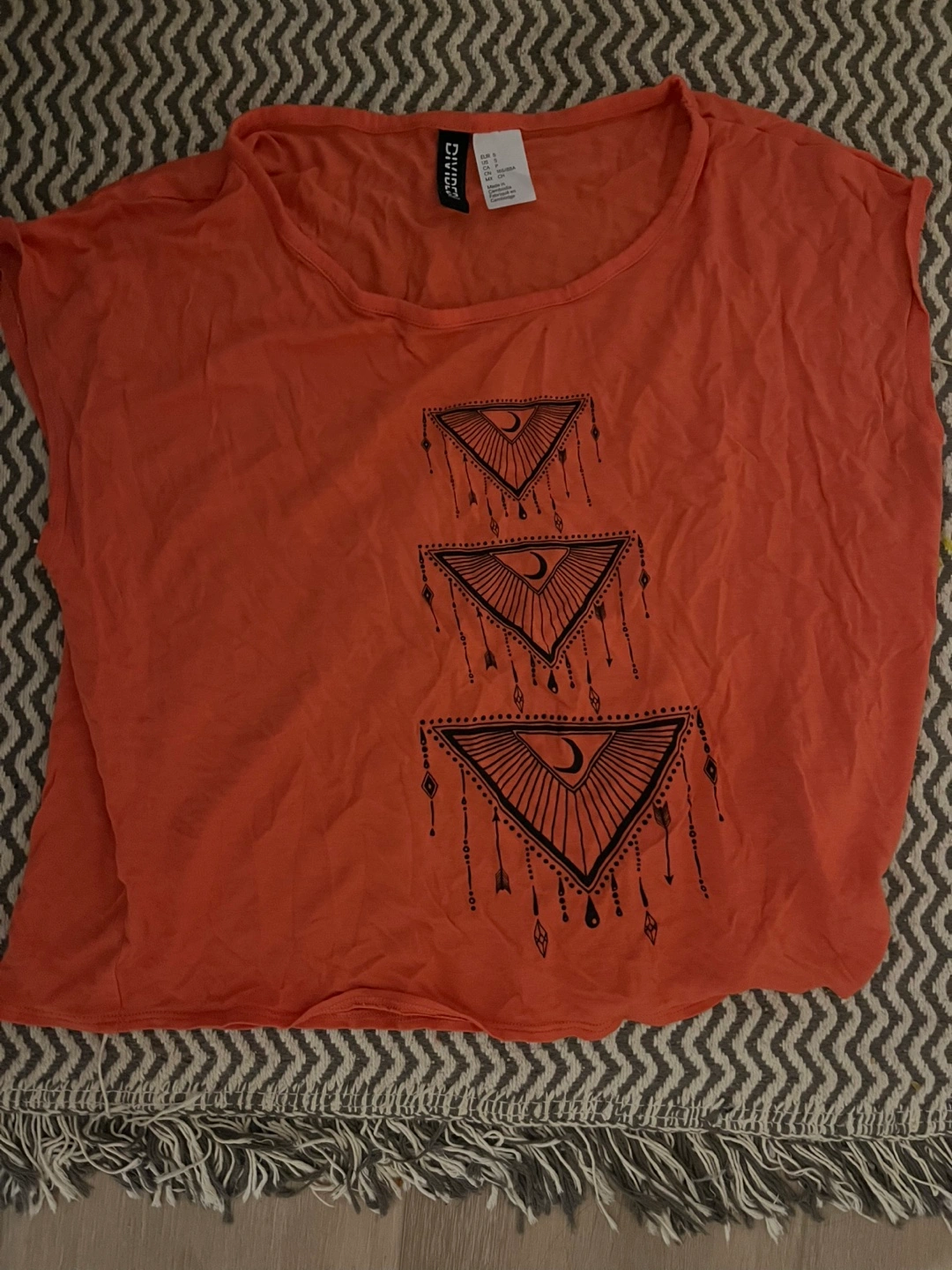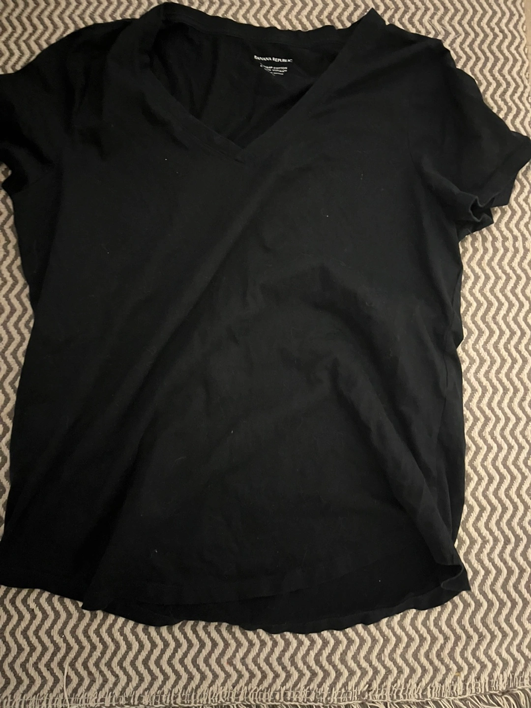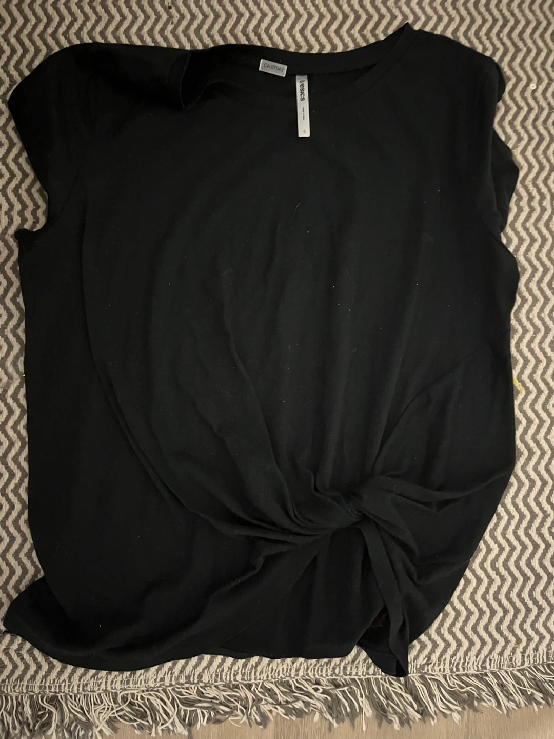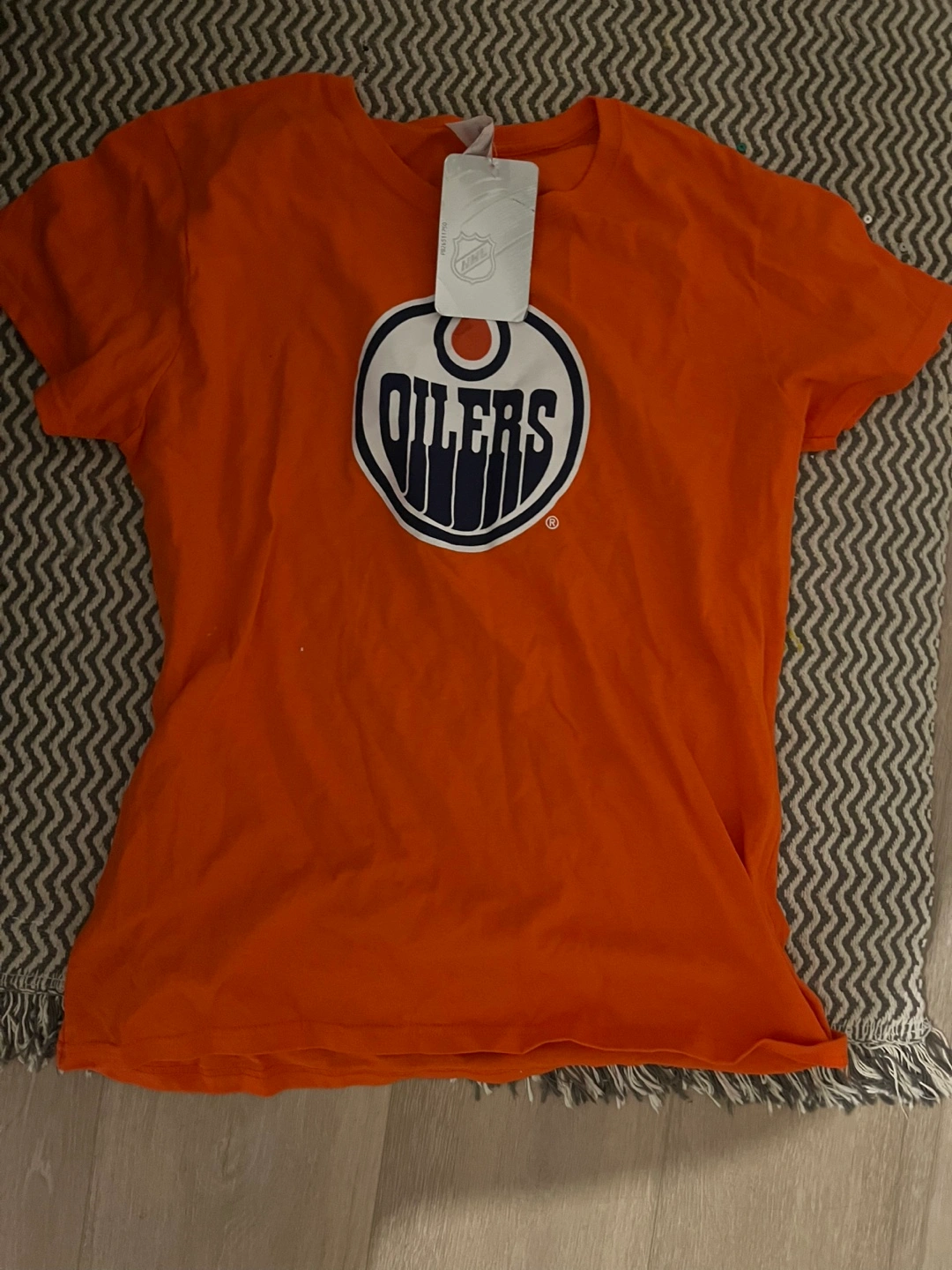 Five tops in various colours and styles. Oilers tshirt small- $7, orange top small- $4, beach tank top- $7, black banana republic tshirt- $7, knotted tshirt- $5, white tank top small- $4, dynamite black crop top- $10, white turtle neck- $5, black tank top- $4, rec fitness shirt- $2
