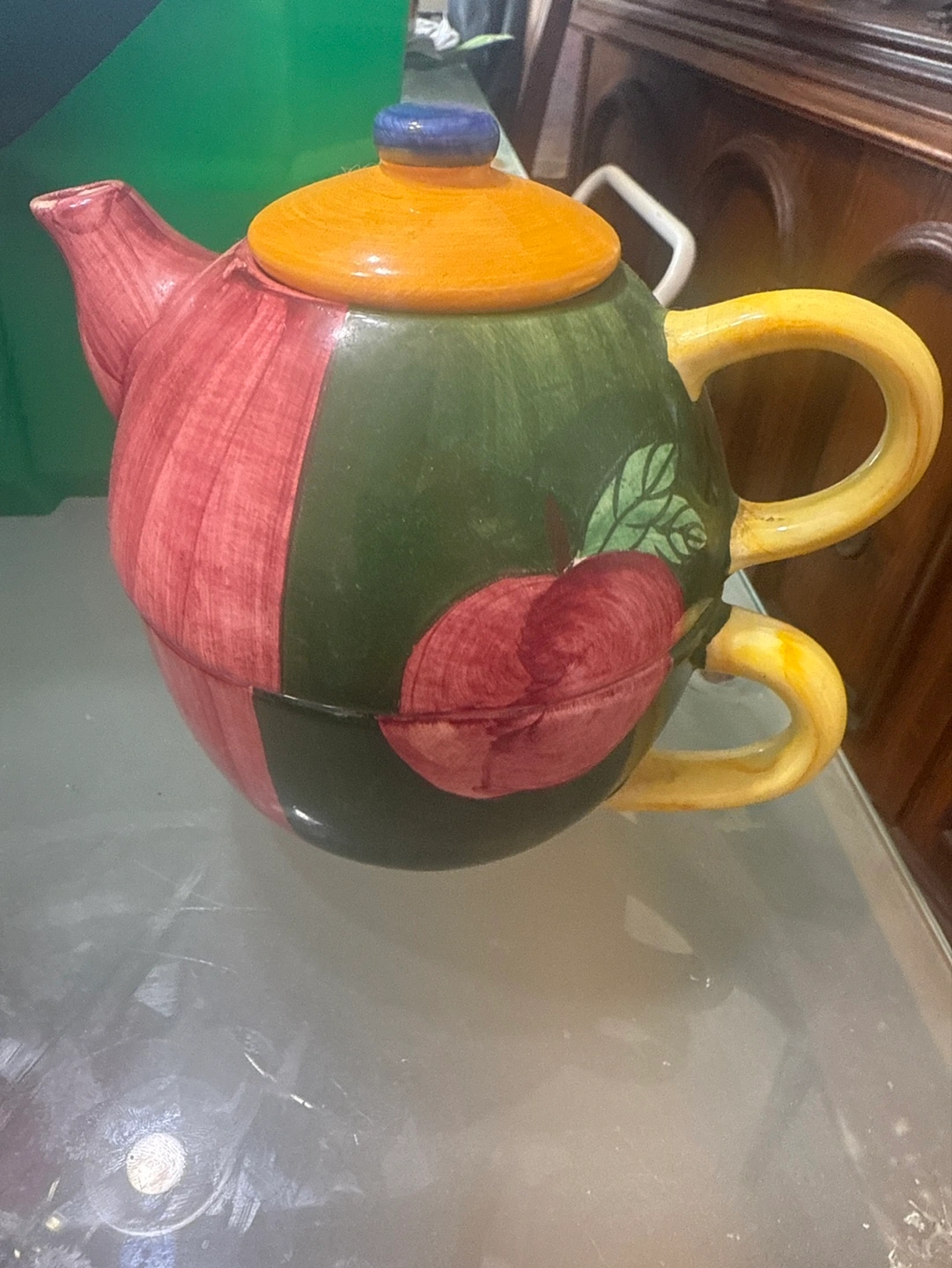 32Charming vintage teapot. Features a colourful hand-painted design. Two handles. Lid included.