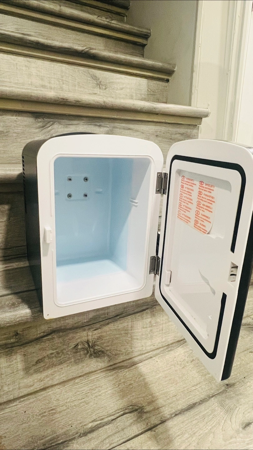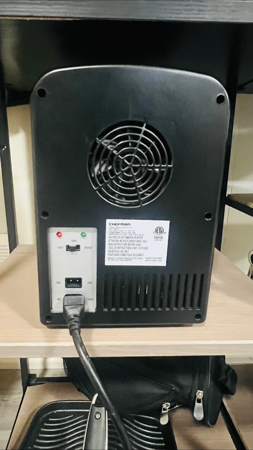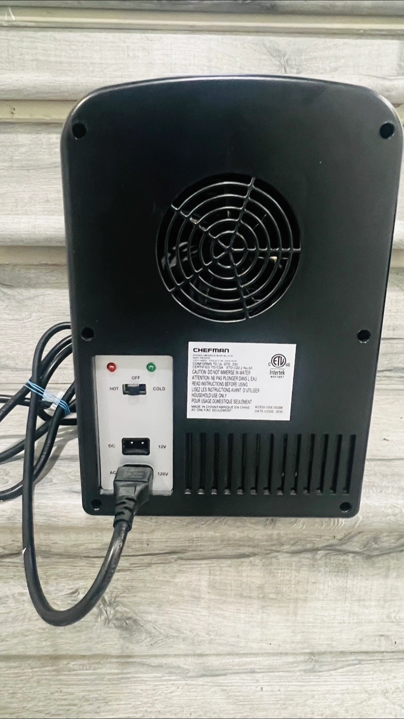 Small, portable fridge. Perfect for dorm rooms or offices. Cools or warms beverages. Includes power cord. AC and DC power options. Used only once.