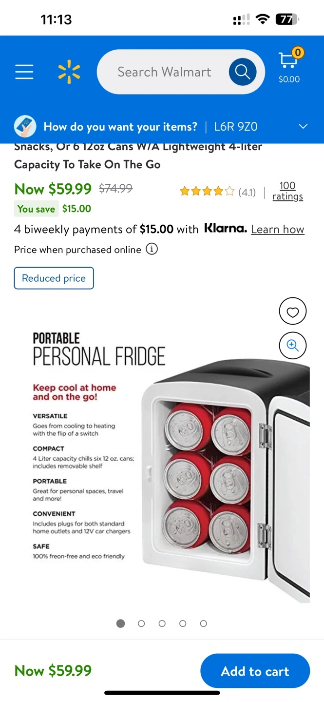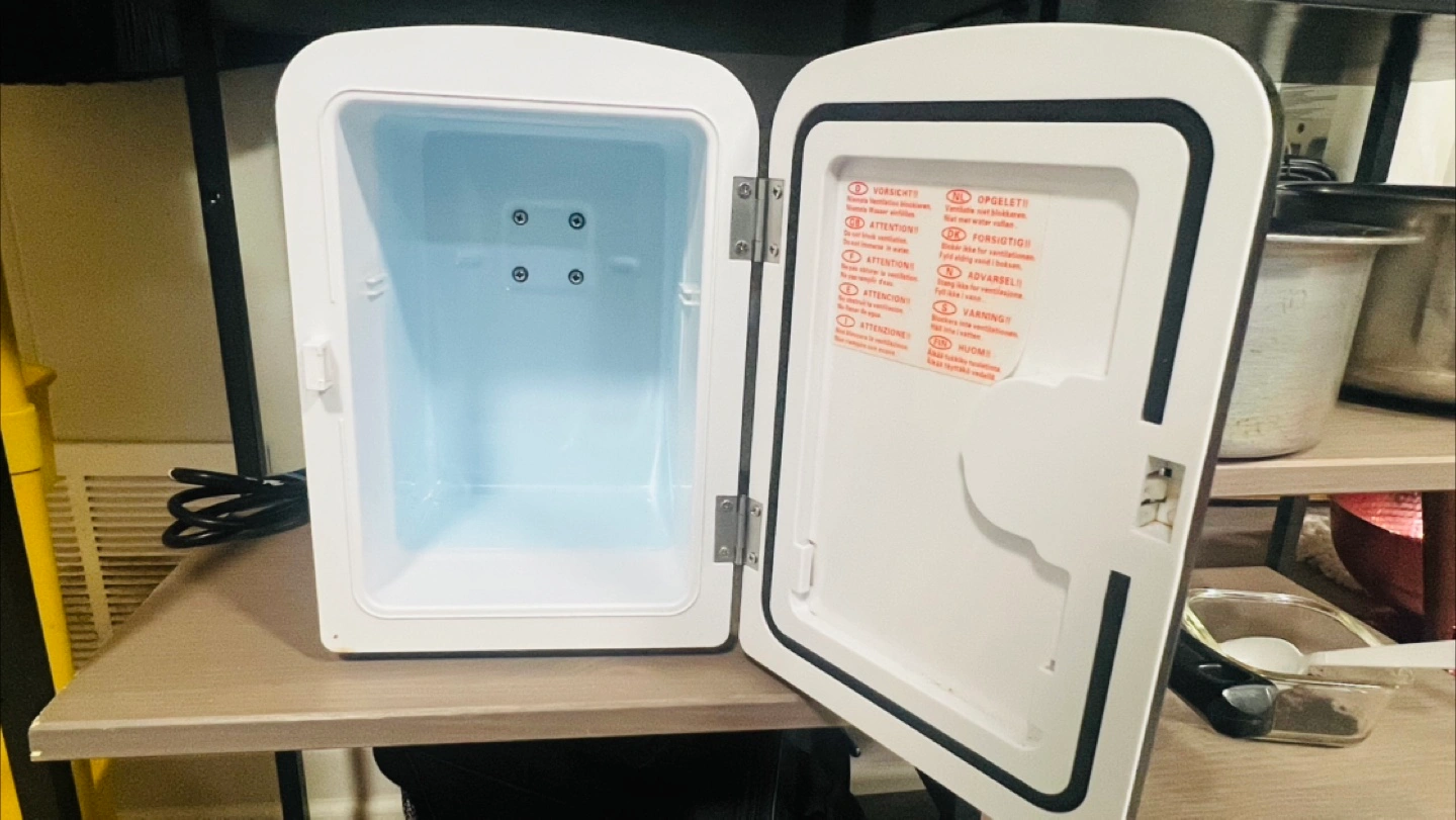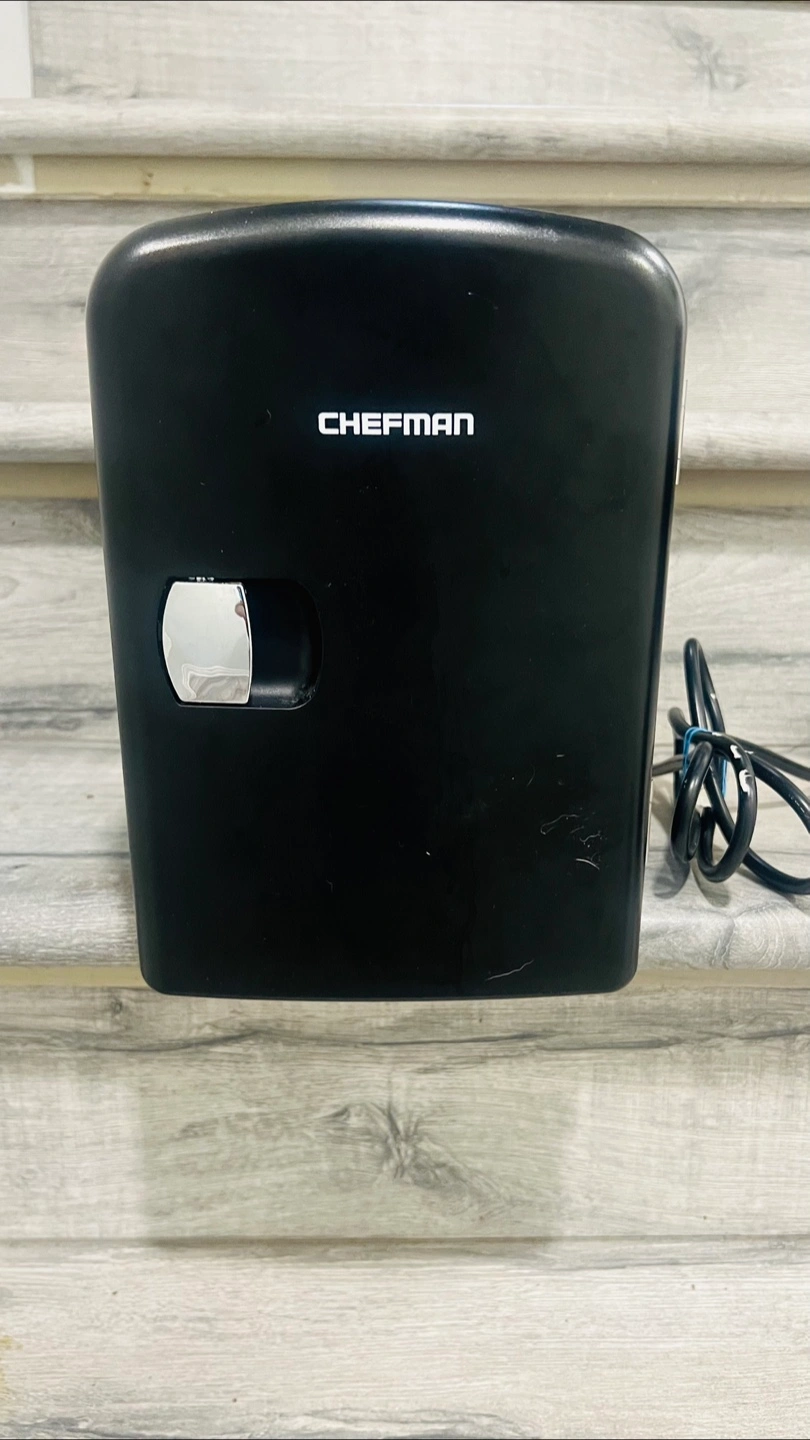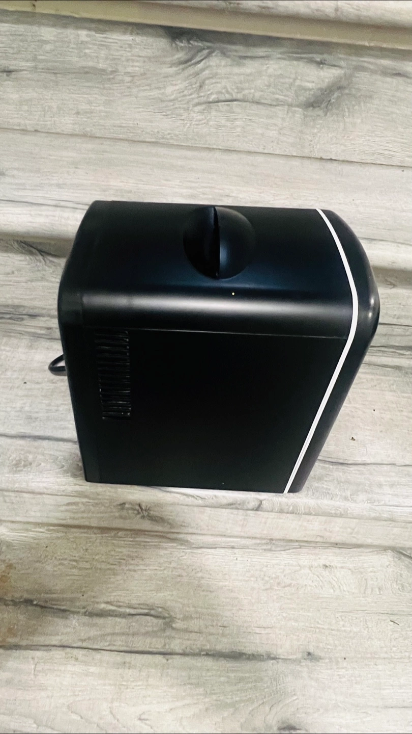 Small, portable fridge. Perfect for dorm rooms or offices. Cools or warms beverages. Includes power cord. AC and DC power options. Used only once.