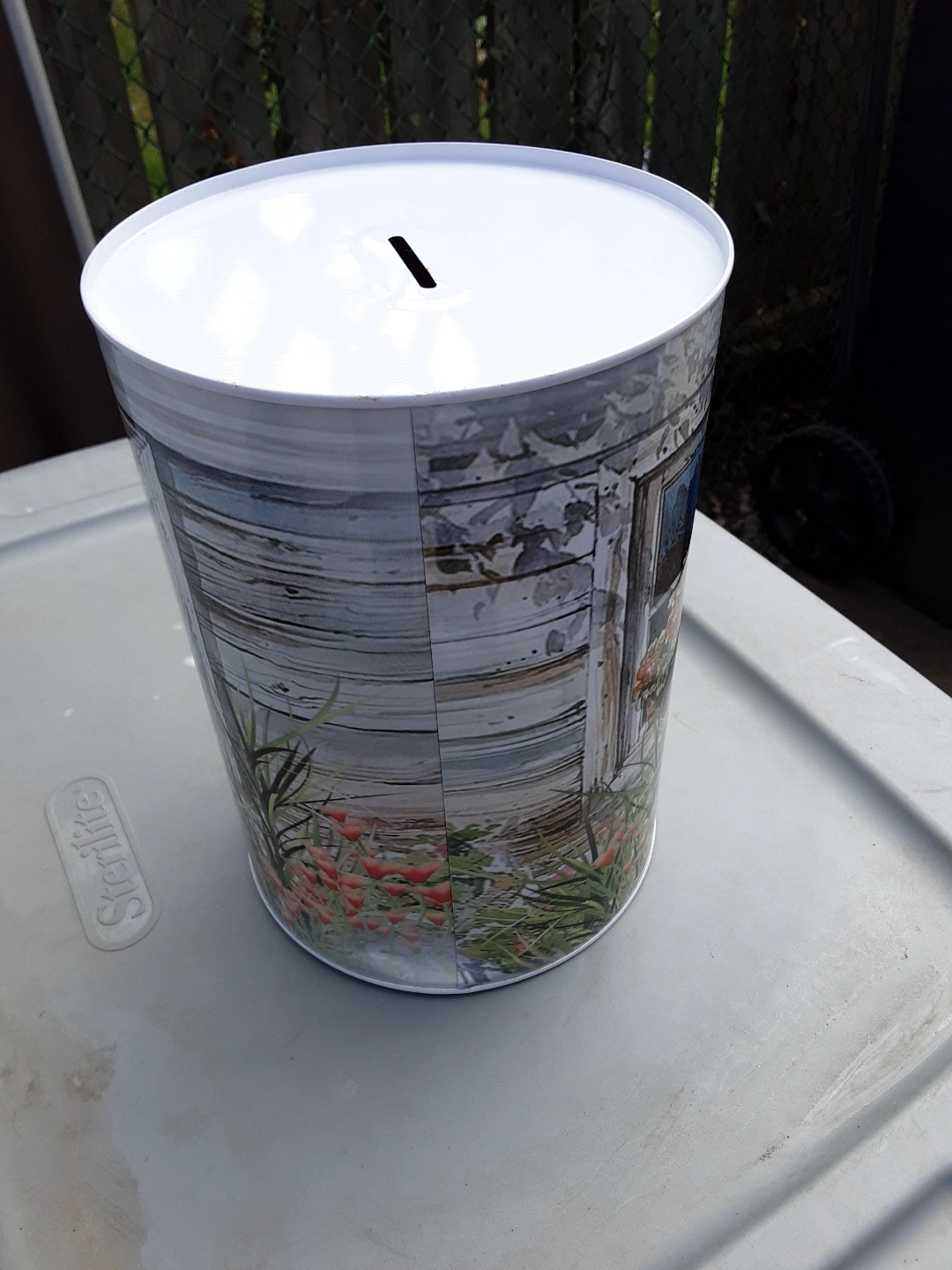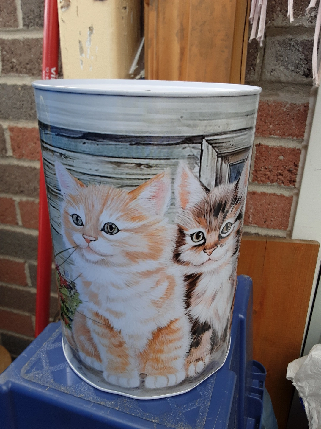 Metal coin bank featuring two kittens. White lid with slot. Perfect for saving money or as a decorative piece.