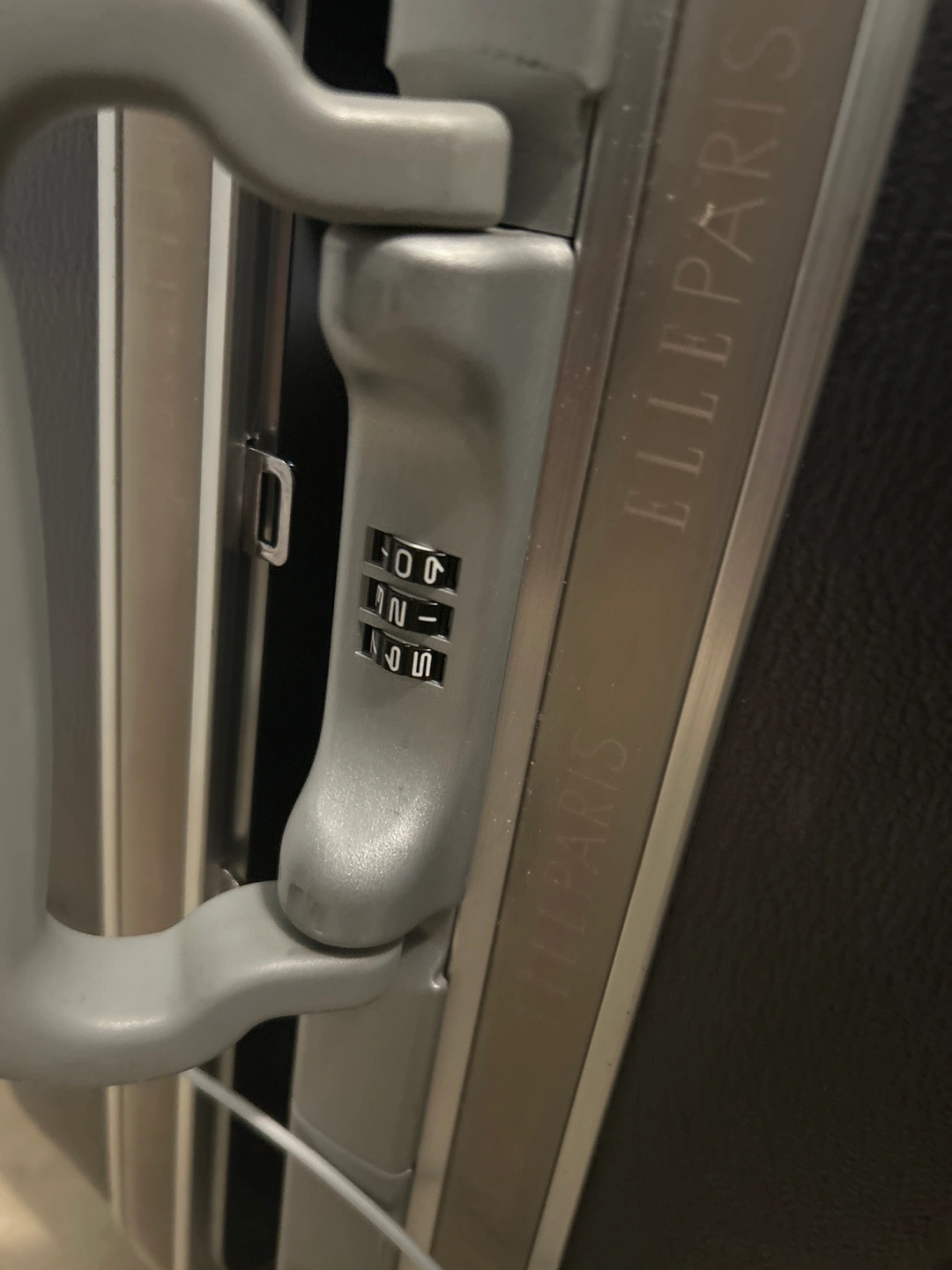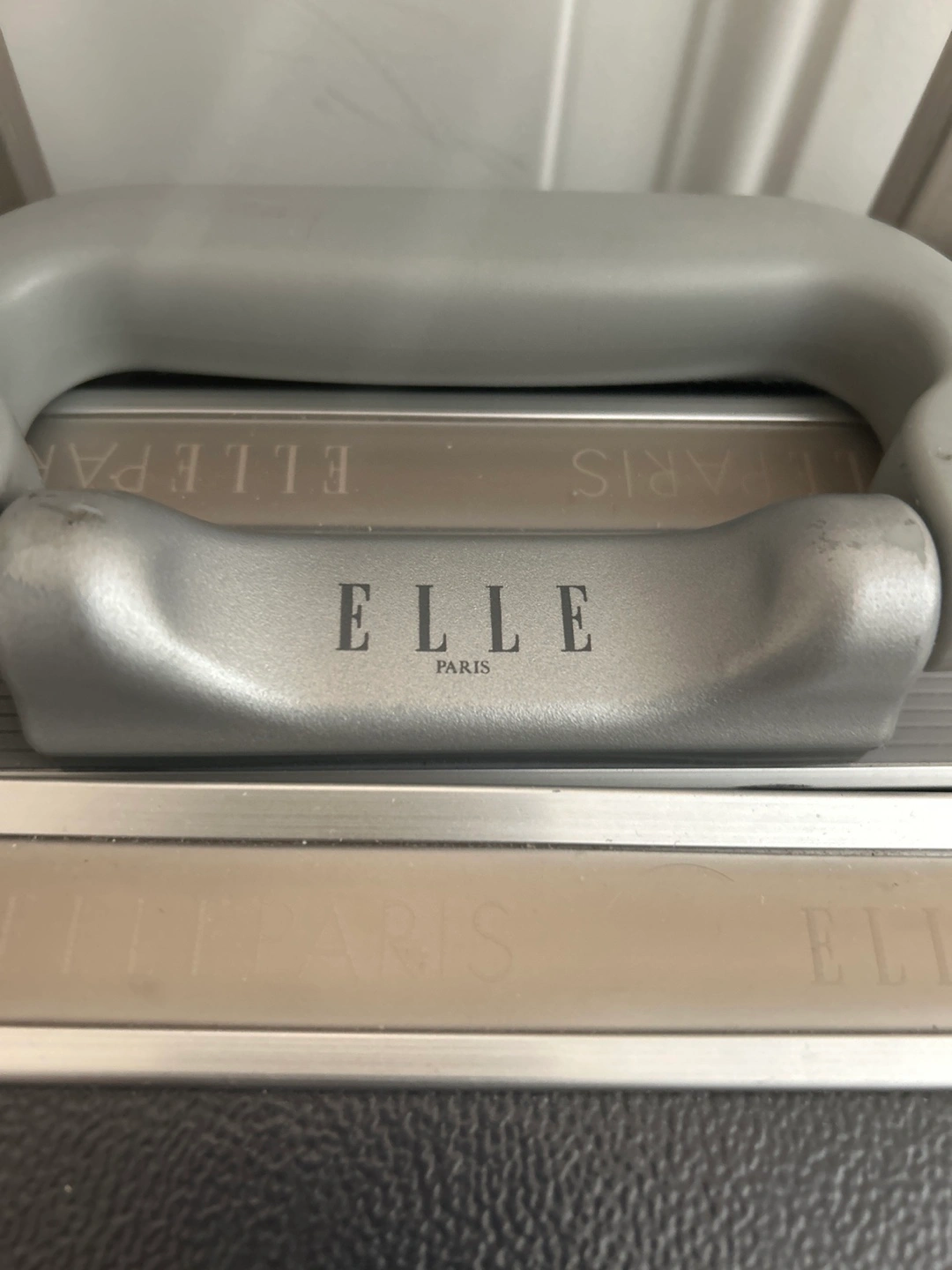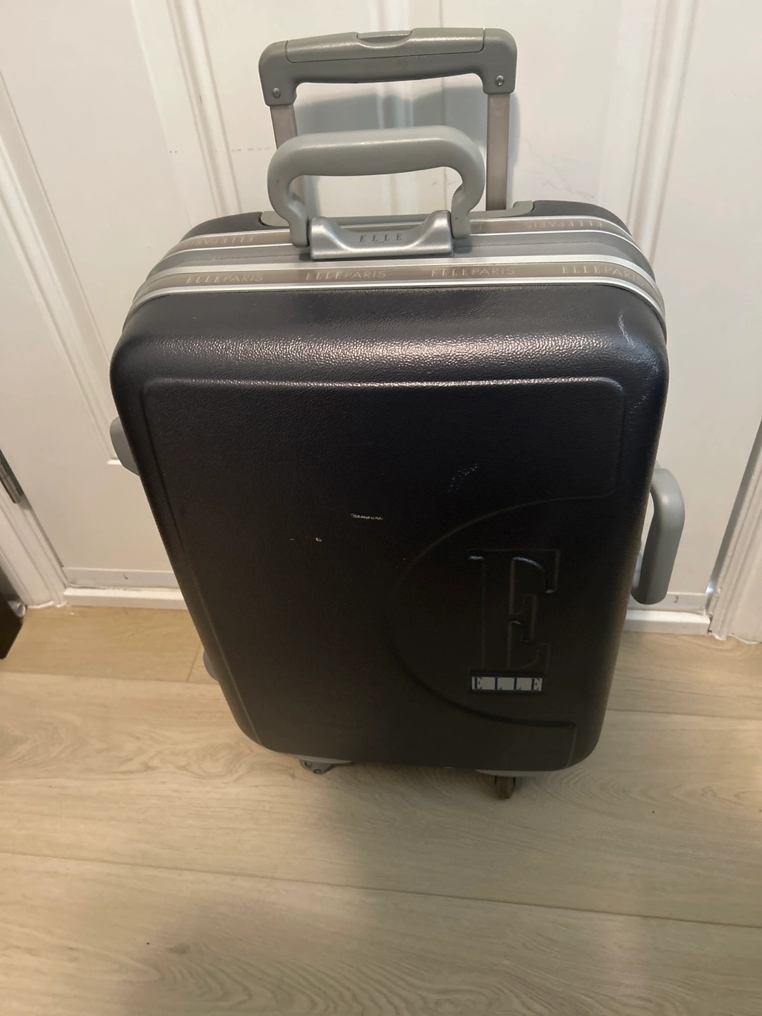 Dark grey hard shell carry-on luggage. Features four wheels, a retractable handle, and interior compartments. ELLE Paris branding visible. Small marks showing on the picture