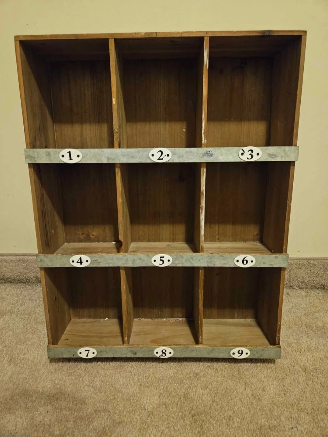Overall in good condition, no major damages. Mostly cosmetic dings and scrapes on the upper most top(pictured) - not visible while hung up. Functional and intact. Comes space for 9 spots.