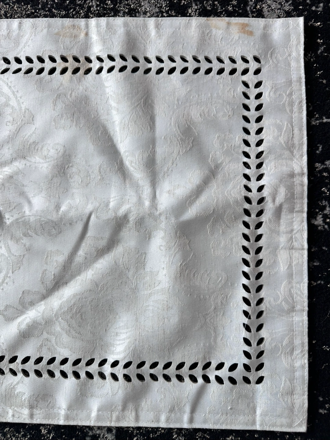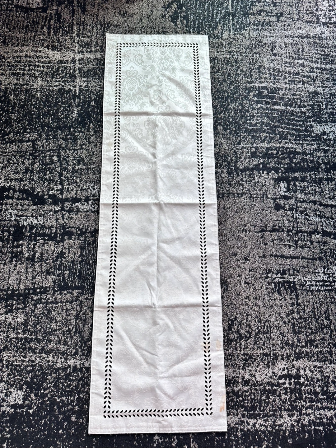 Off-white rectangular table runner. Features a subtle embossed floral pattern and a decorative cutout border. Looks great on a table.