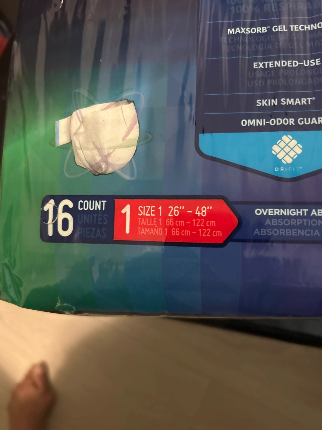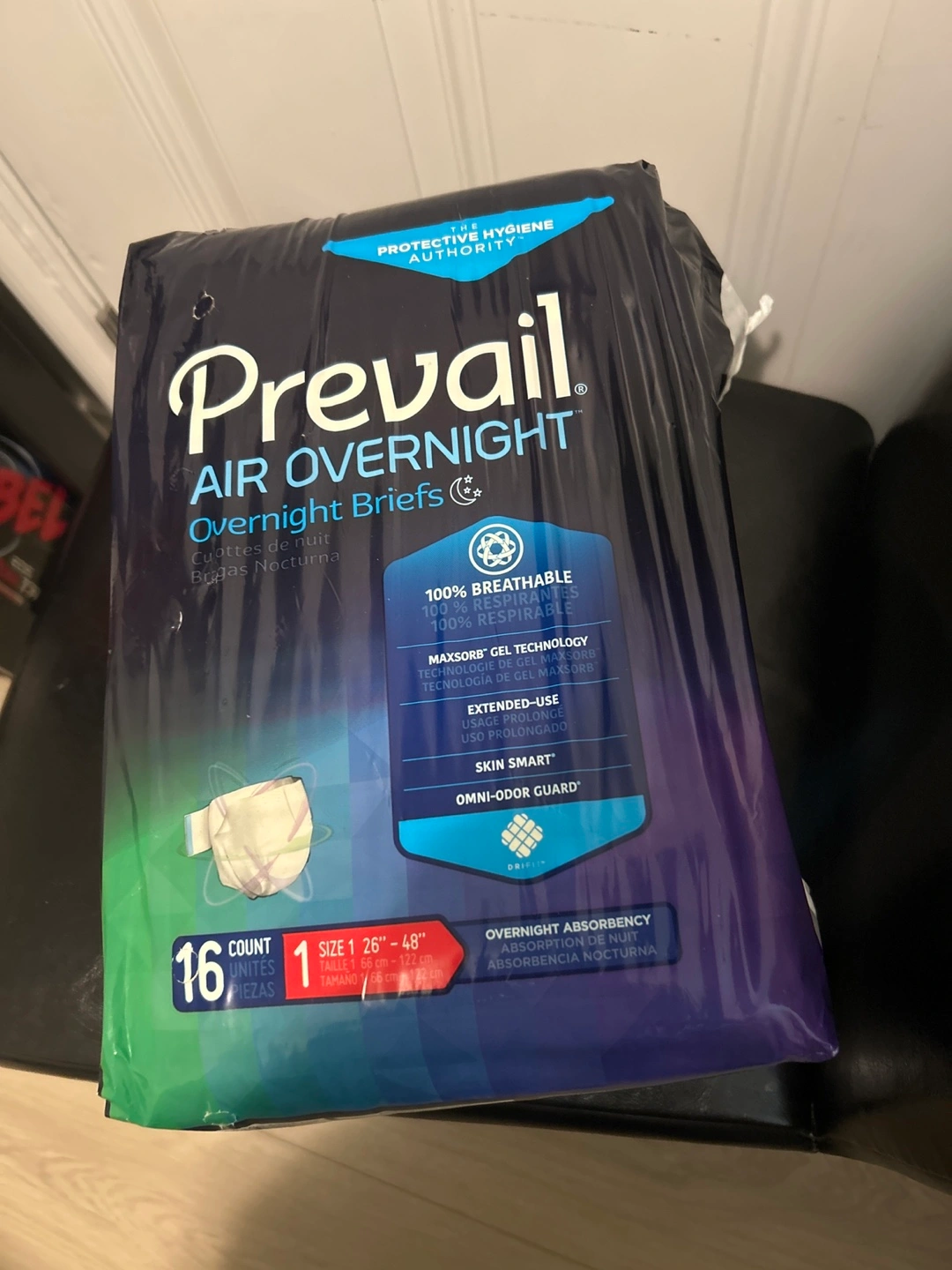 16 count package of size 1 Prevail Air Overnight adult briefs. Waist size 26"-48". Overnight absorbency. New, unopened package.