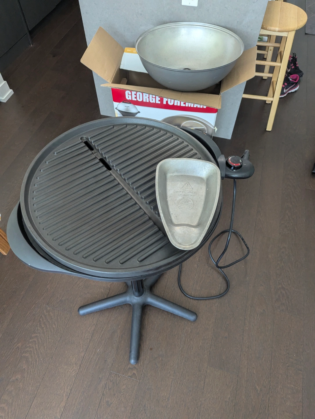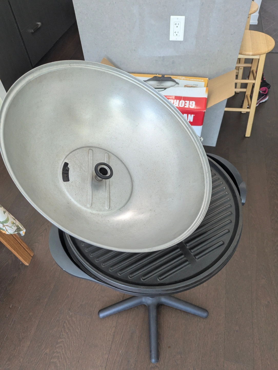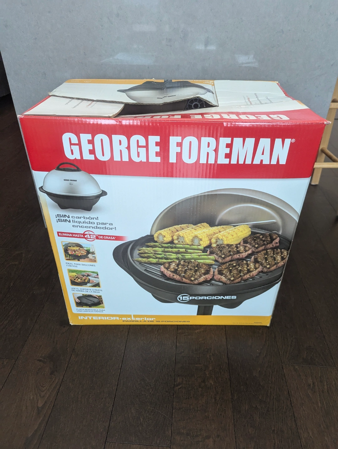 Lightly used George Foreman 15-portion indoor/outdoor electric grill. Includes grilling plate, drip tray, and dome lid. All in original packaging. Great for smaller spaces or patios. Good condition and thoroughly cleaned.