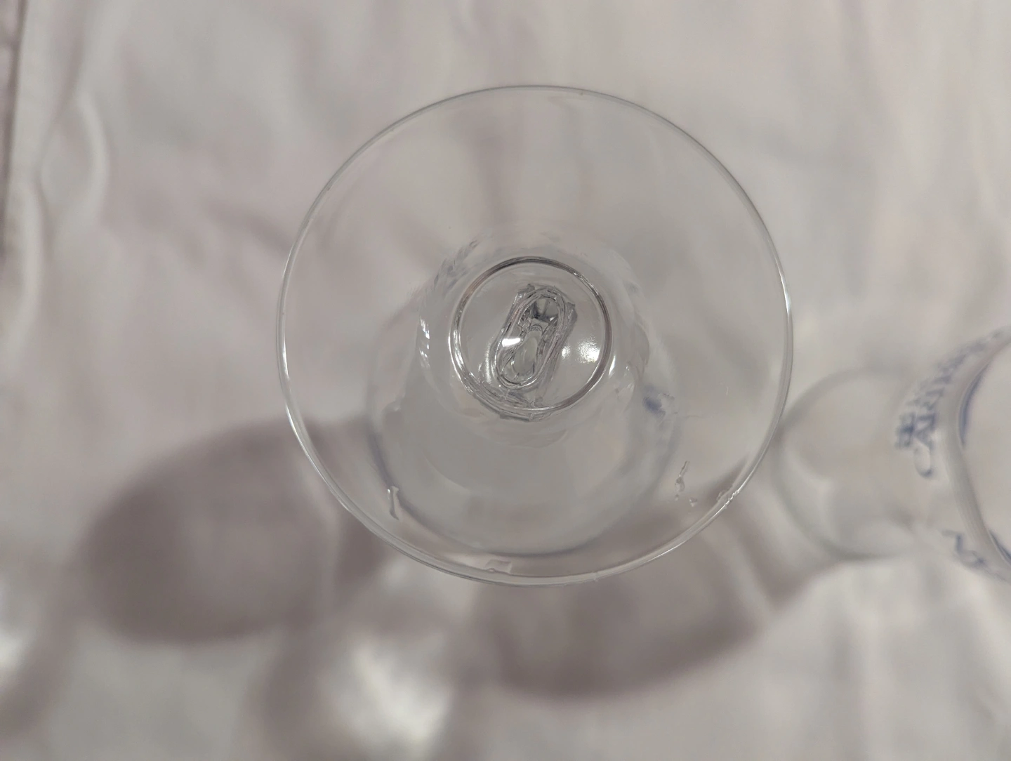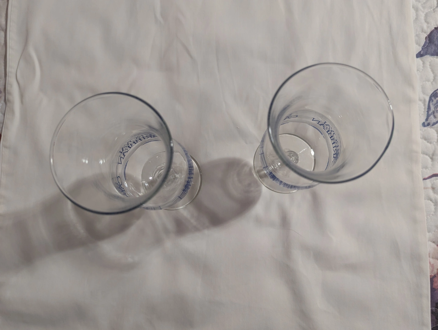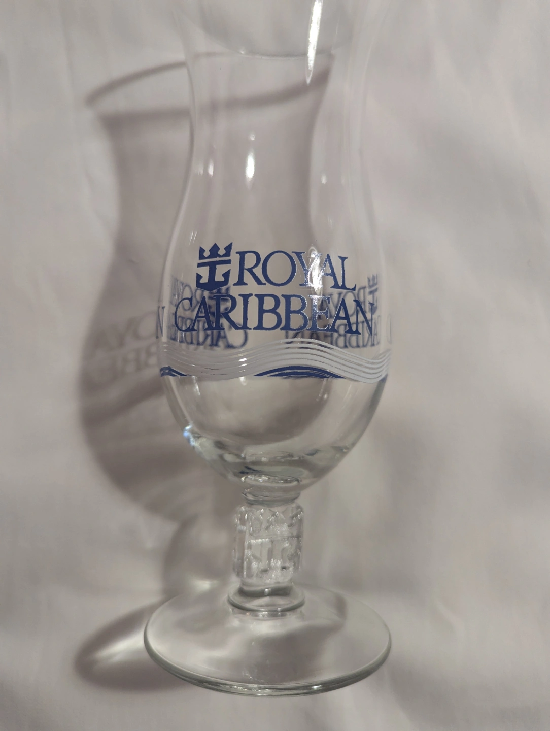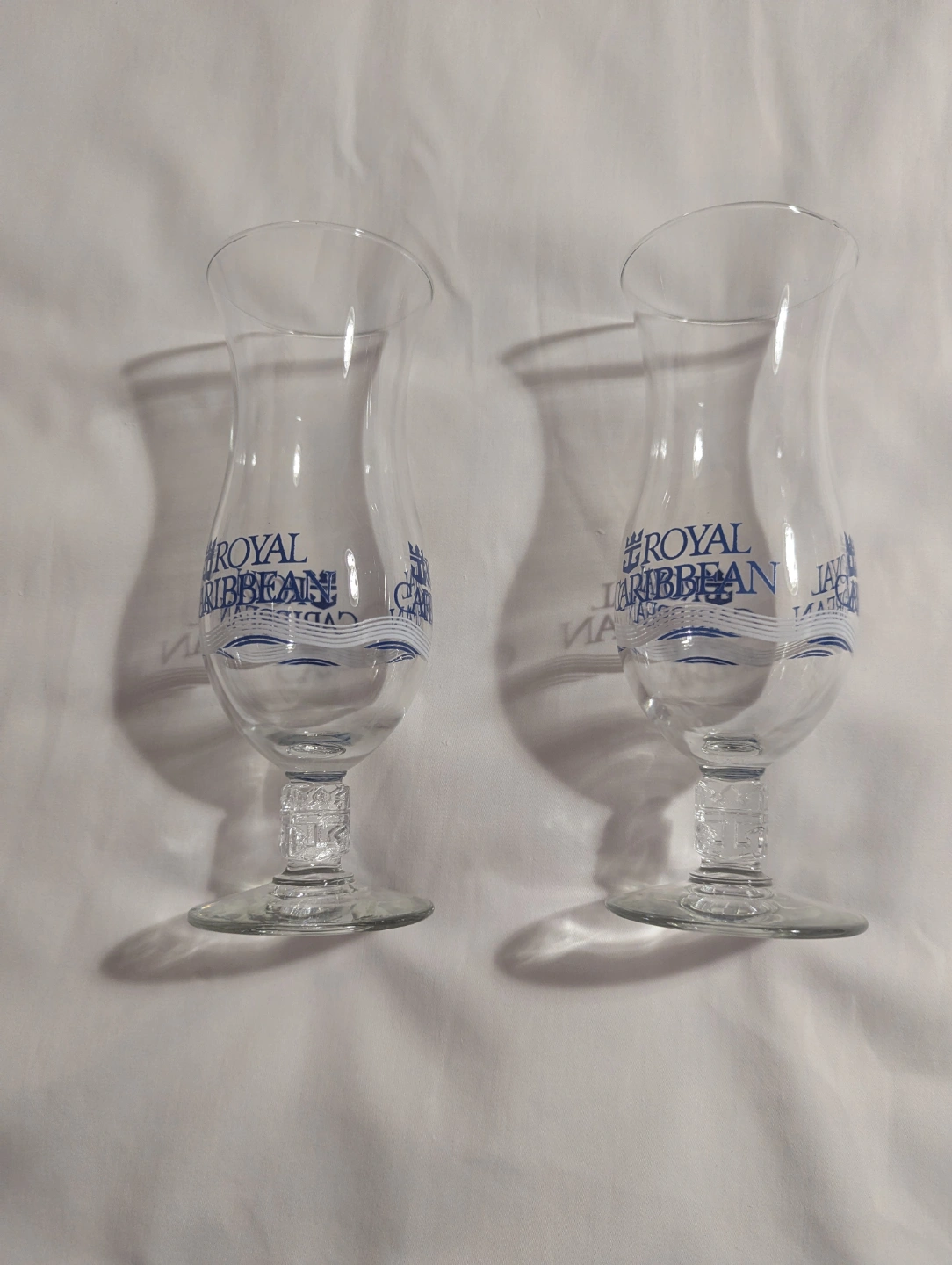 Two hurricane glasses. Royal Caribbean logo. Clear glass. Stemmed base. No cracks or chips.