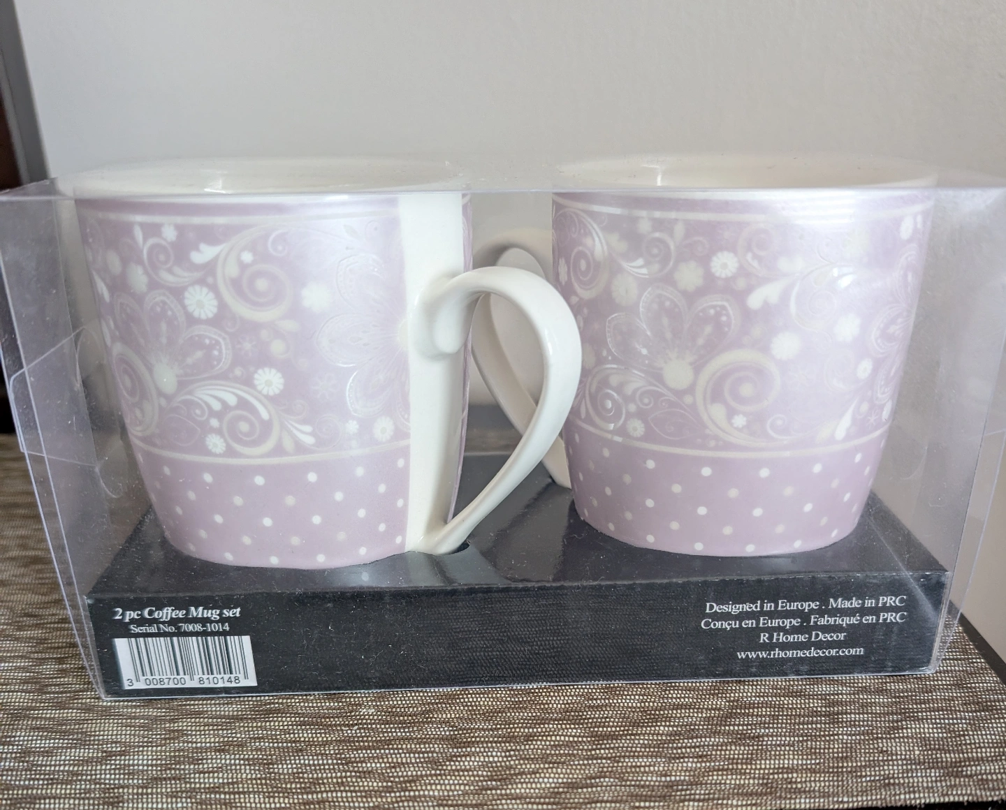 New in box. Set of two mugs. Lavender colour. Polka dot and floral design. 360ml each.