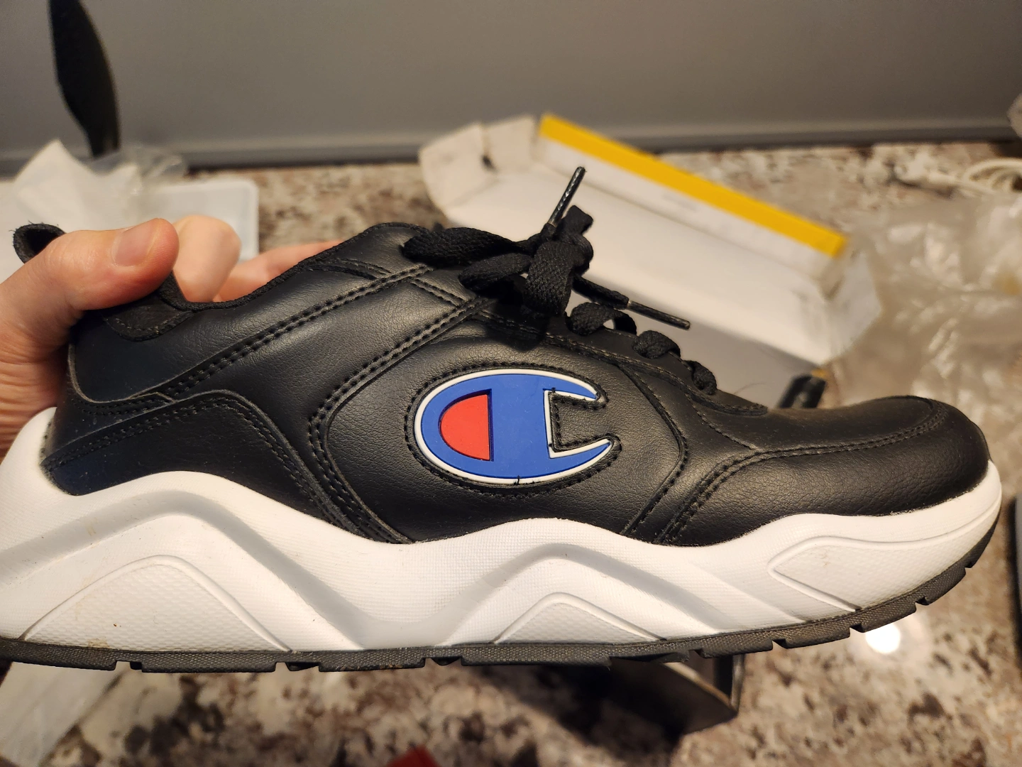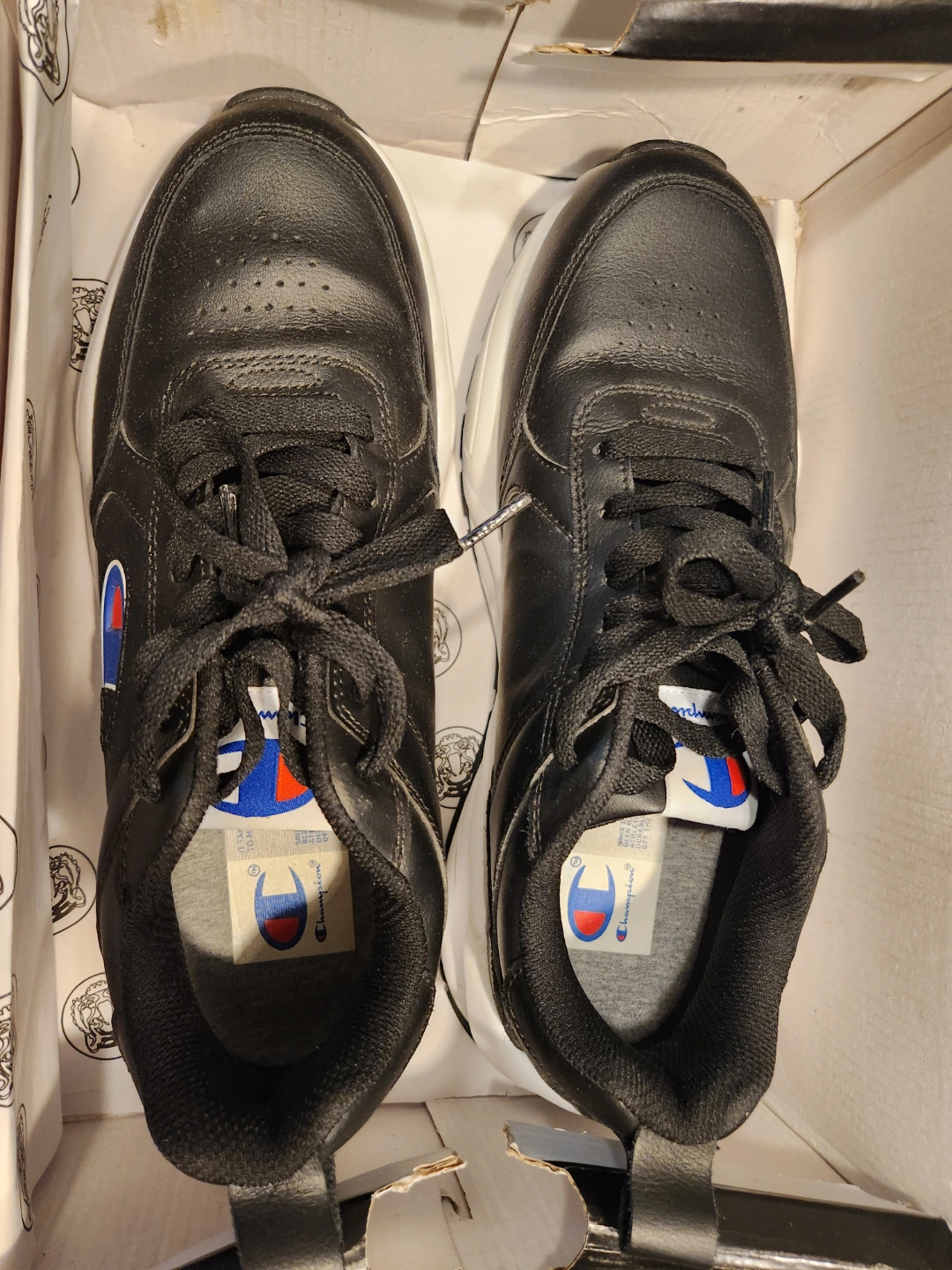 Brand new Champion men's sneakers. Size 10. Black leather-look upper, white sole. Classic Champion logo. Never worn.
