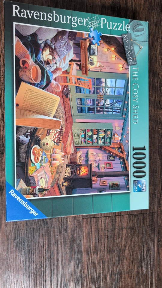 1000-piece jigsaw puzzle. Cozy shed scene. Features a cat, book, and wood burning stove.