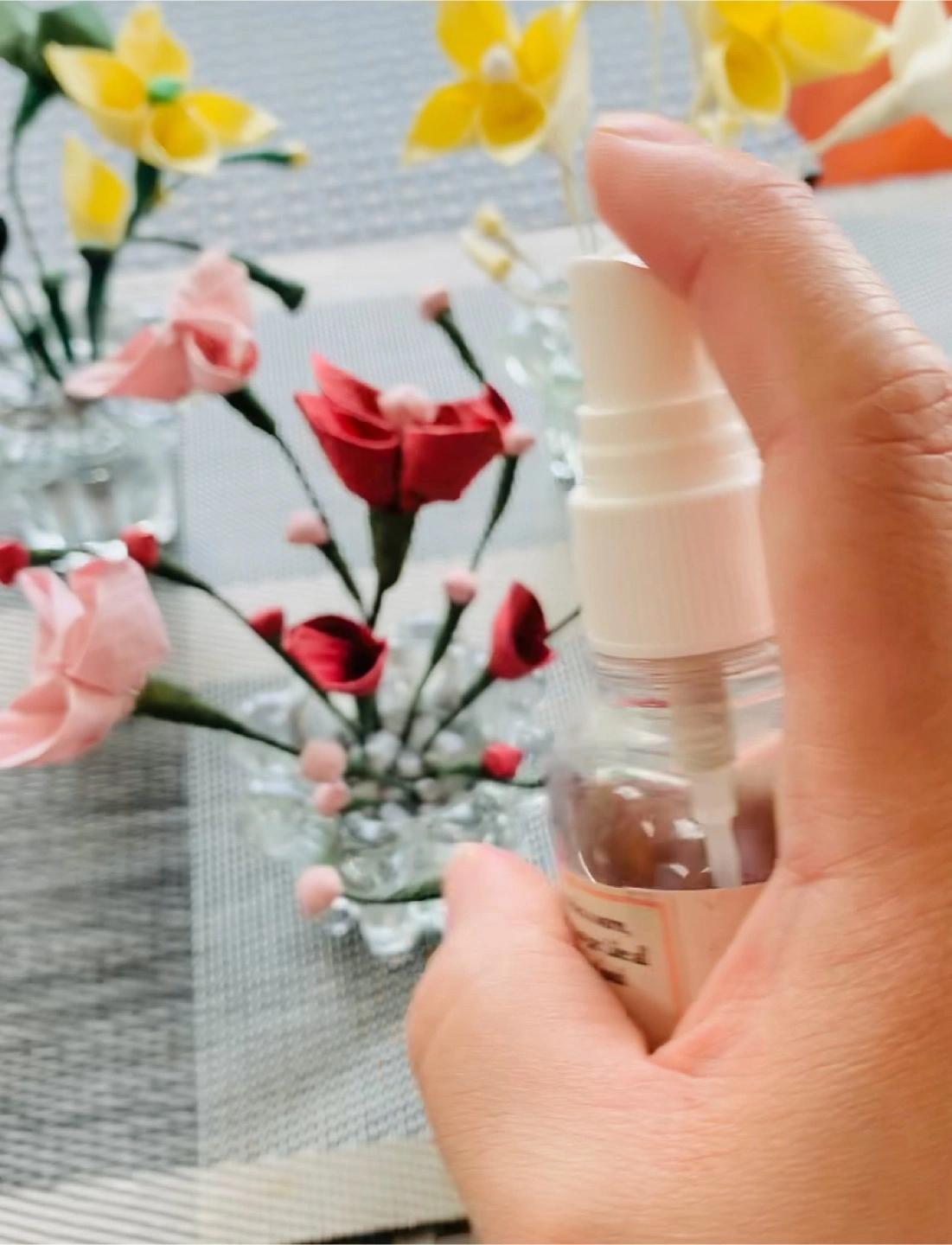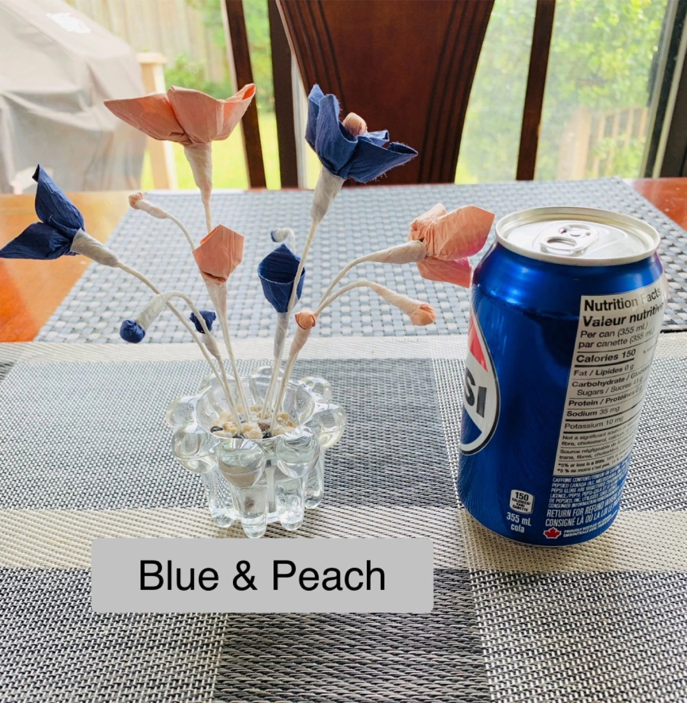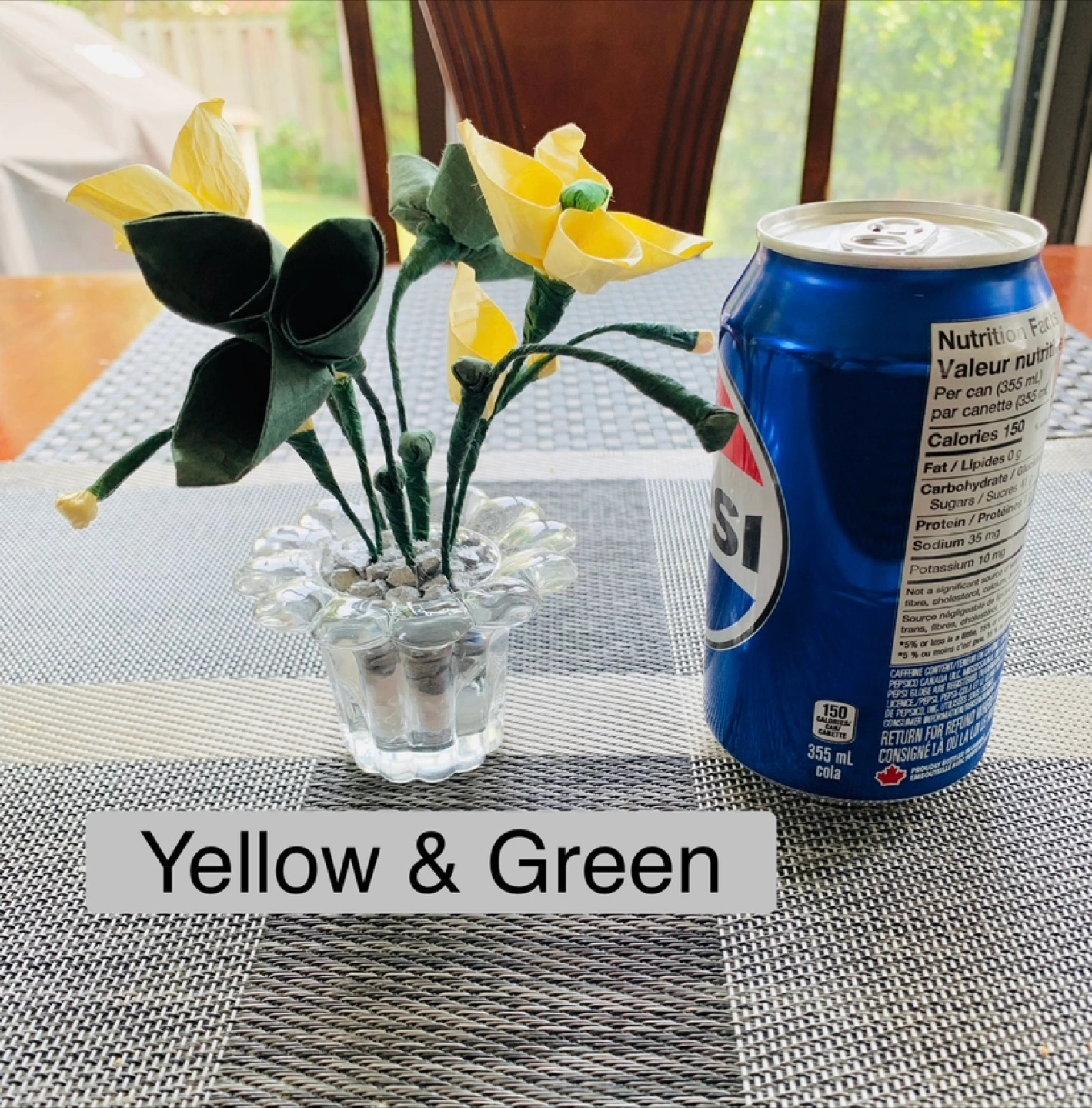 NEW ONE-OF-A-KIND Handcrafted flower petals and buds using craft paper. Placed in 2”x3” glass pot. Twistable stems allowing you to shape as desired. Makes a UNIQUE room decor. Spray with your favourite room freshener or drop a couple of squirts of essential oil. Flowers and pebble base are glued on (refer to demonstrated picture of decor upside down).