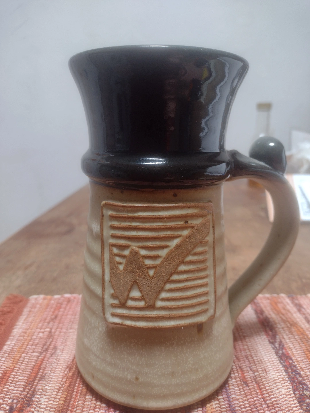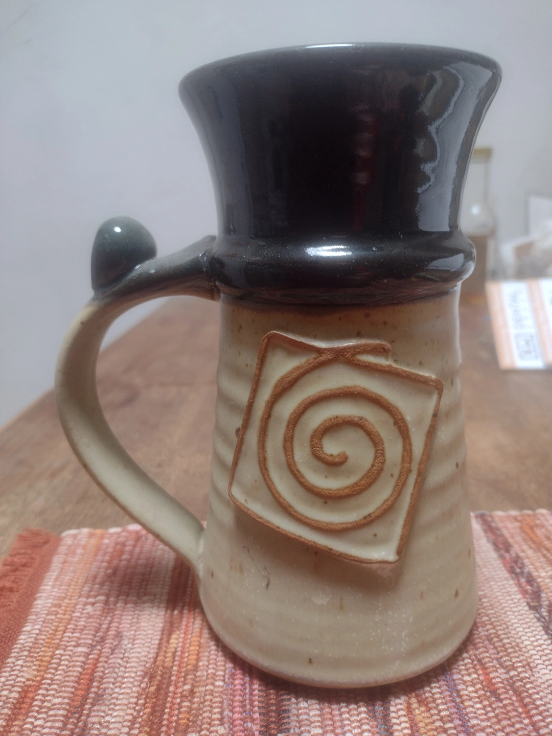 Unique handmade mug. Features a beige body, dark brown rim, and a sculpted handle. Decorative square carved design. Excellent for beer or a 'grande' beverage of your choice.