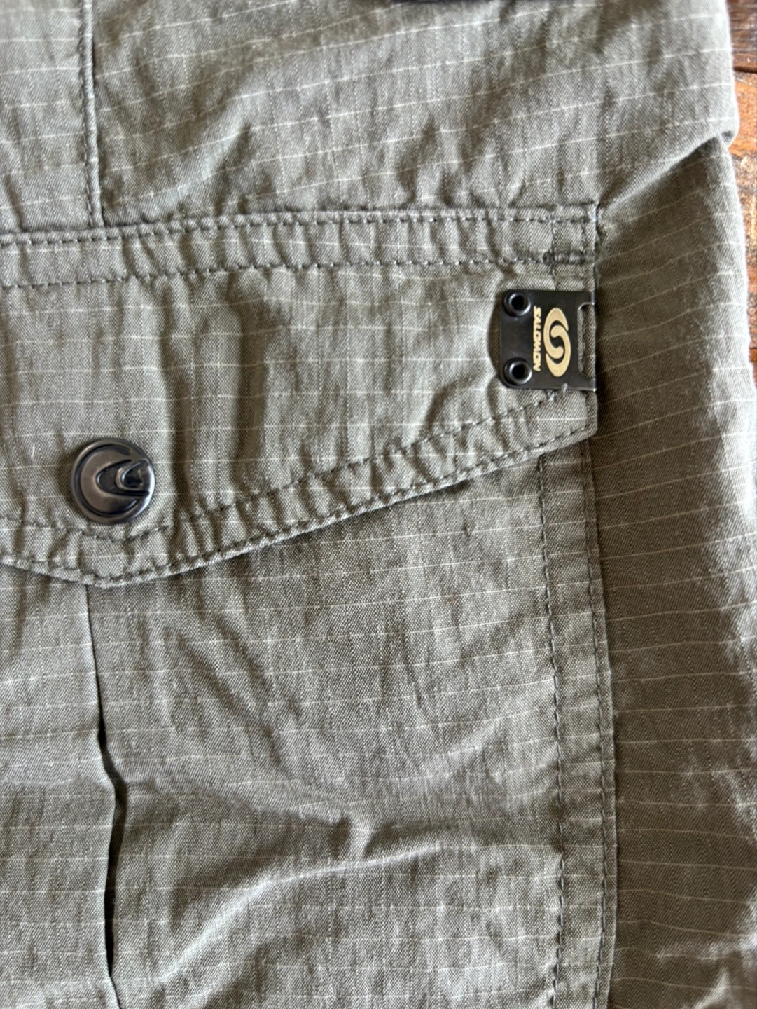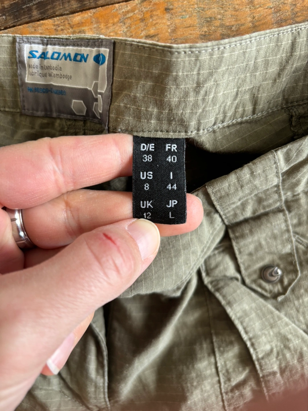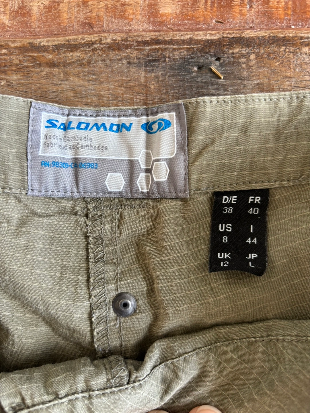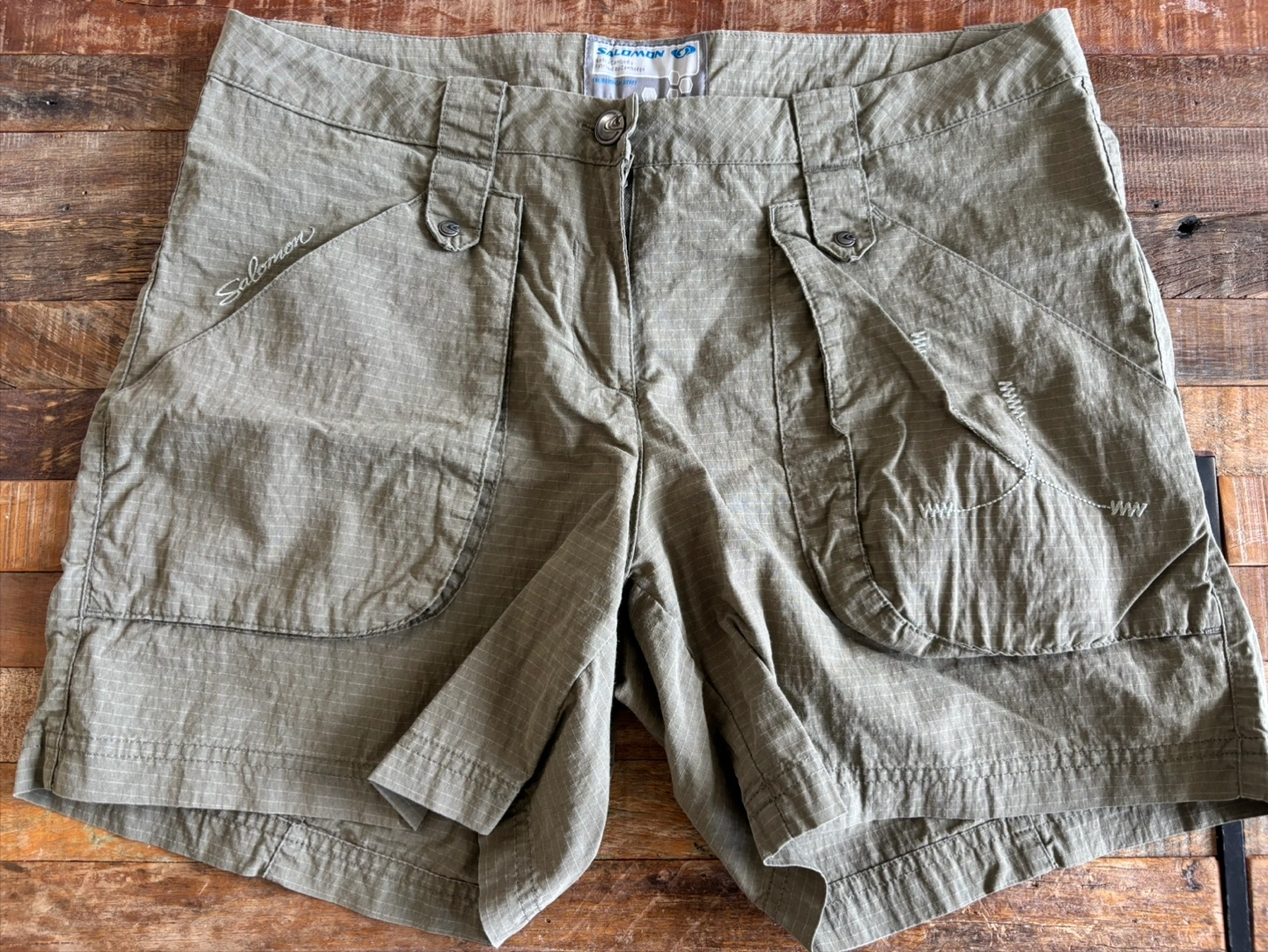 Women's Salomon hiking shorts. Size 8 US. Olive green colour. Multiple pockets. Lightweight fabric. Good for outdoor activities.