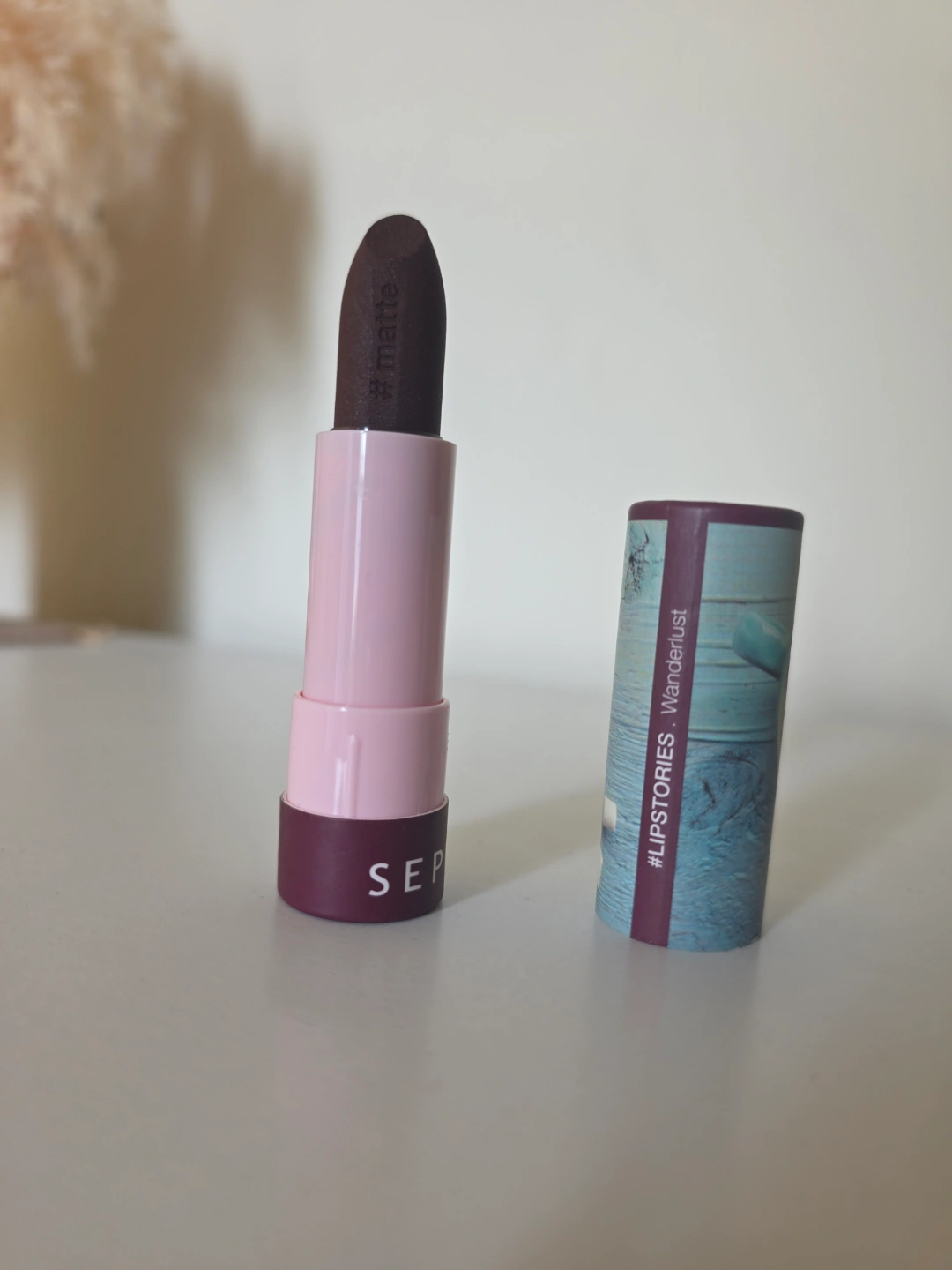 Sephora Collection Lipstories Wanderlust matte lipstick. Dark brownish purple shade.
