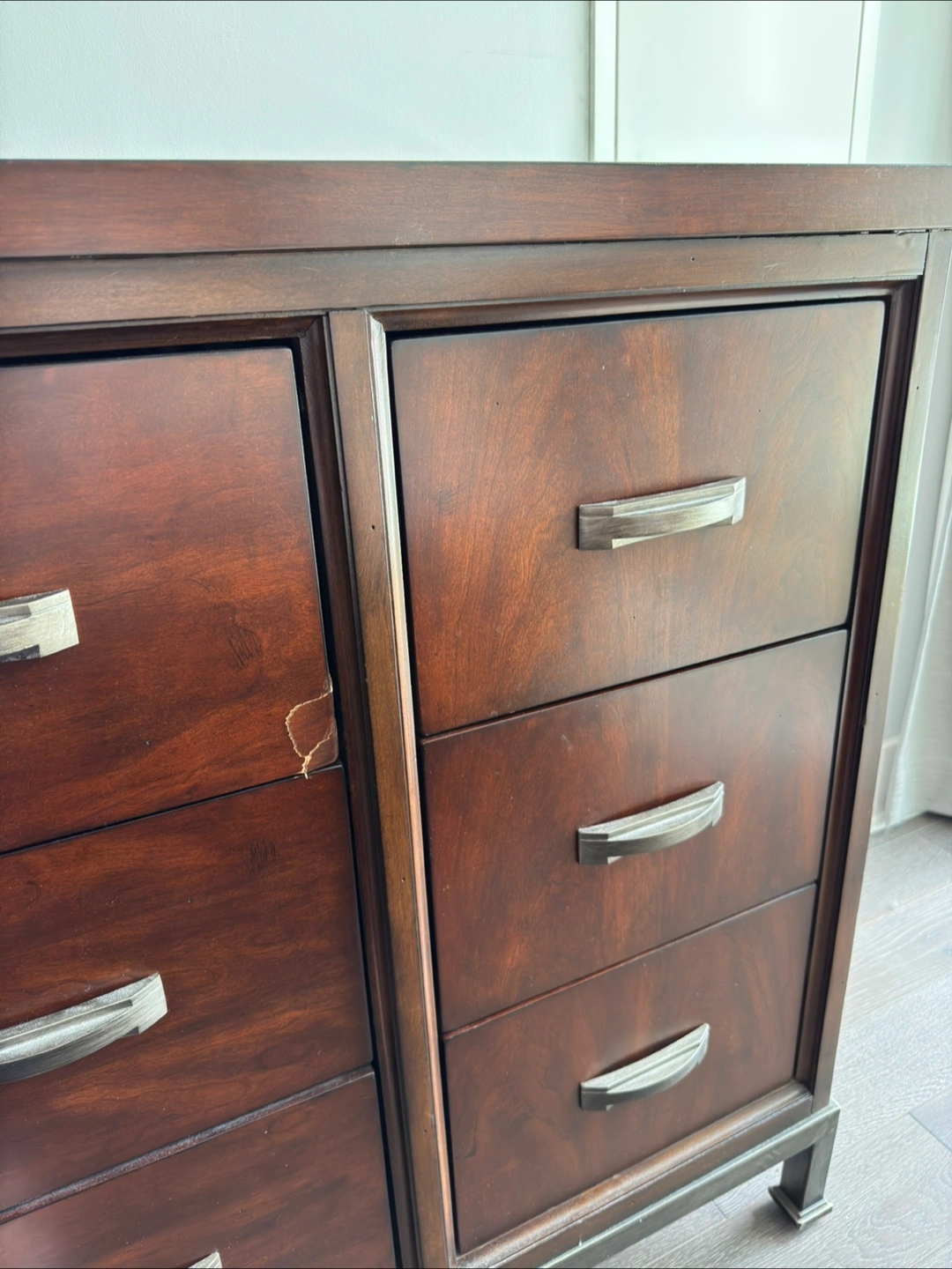 This used dresser features a dark wood finish and offers ample storage with its multiple drawers; there are some cosmetic imperfections, including scratches on the top surface and veneer damage.
