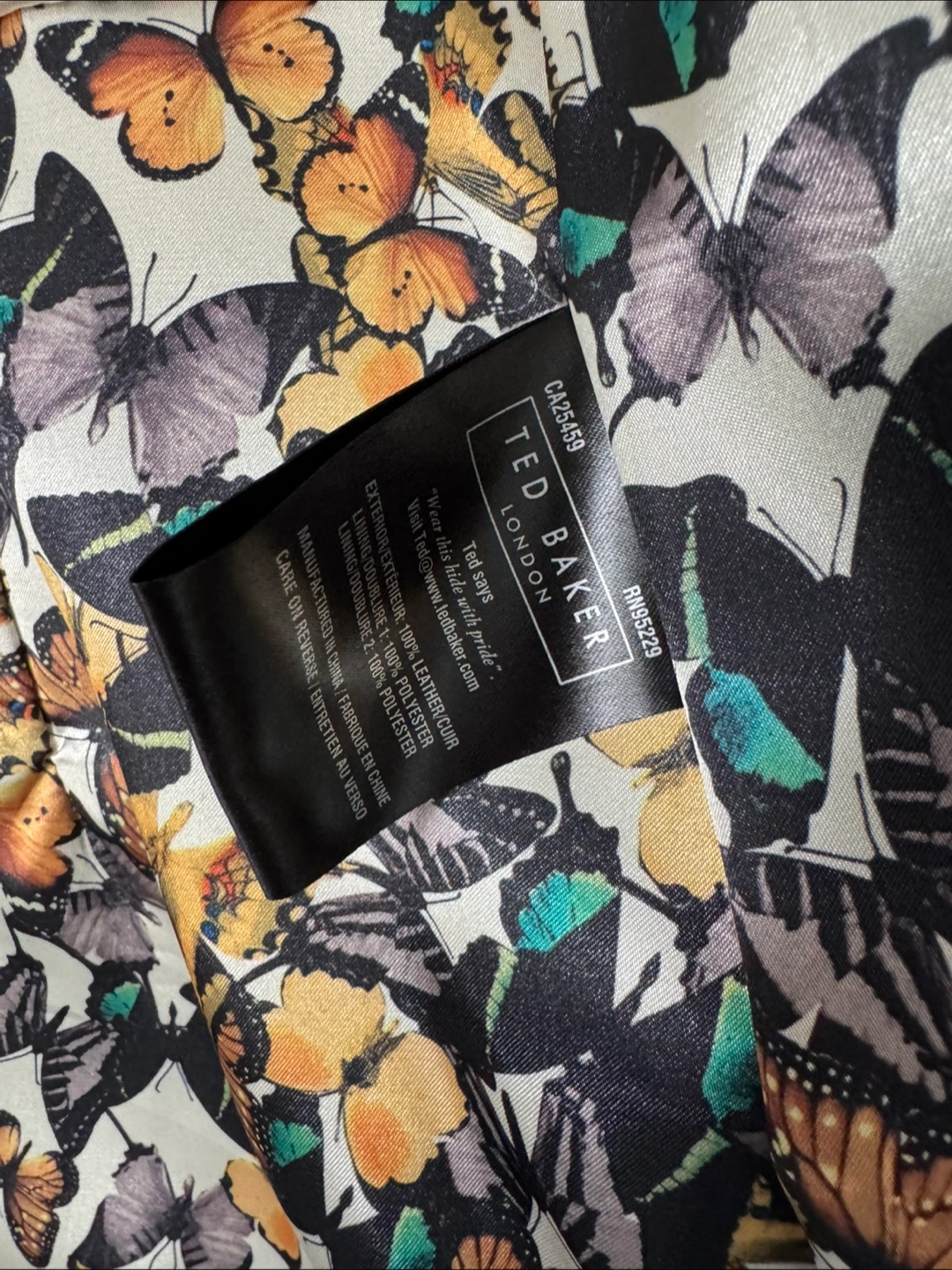 * Features: Front zipper, butterfly-print lining