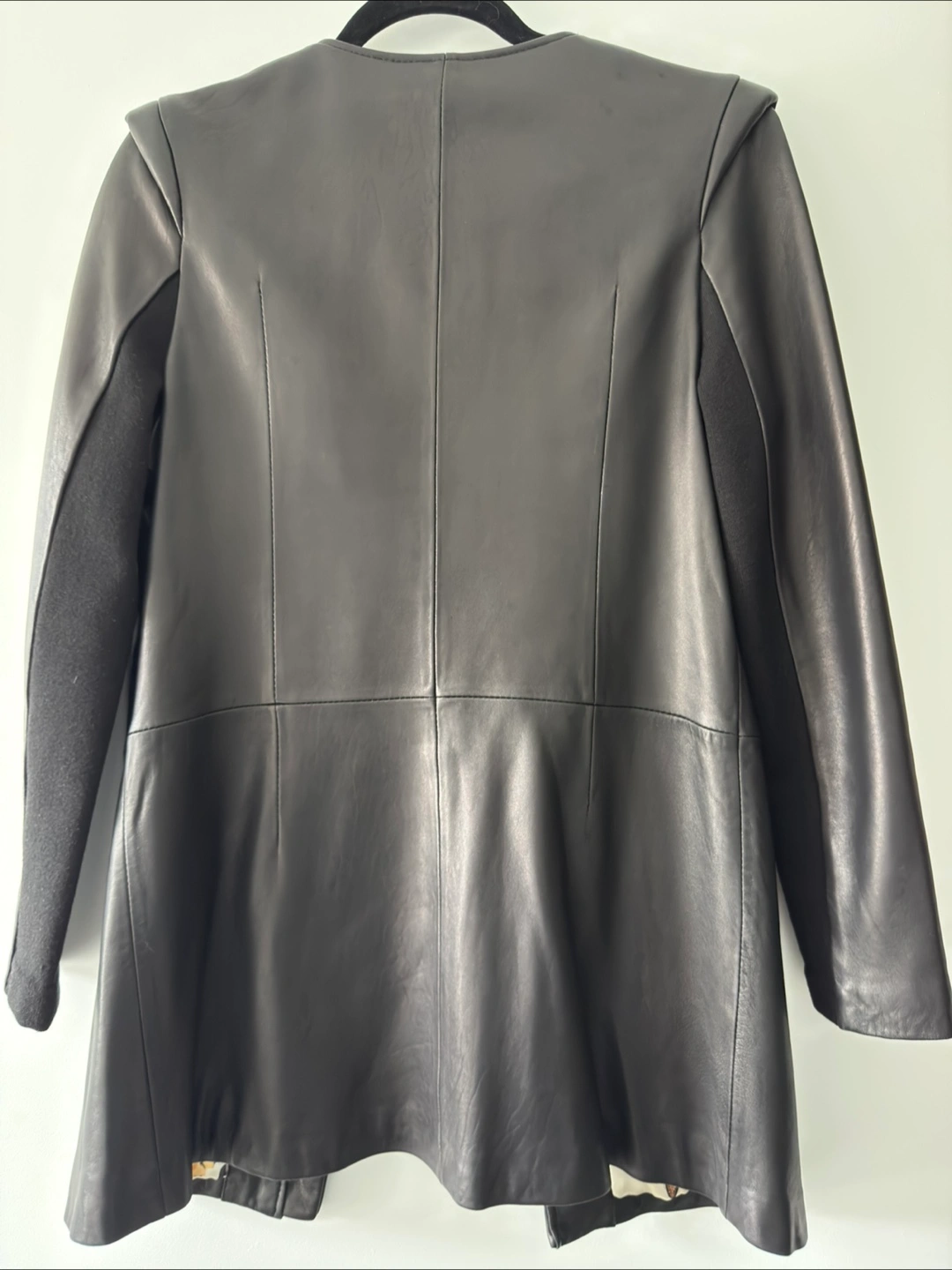 This is a used Ted Baker black leather jacket in size 4, which is equivalent to a US size small. It has a front zipper and a butterfly-print lining.