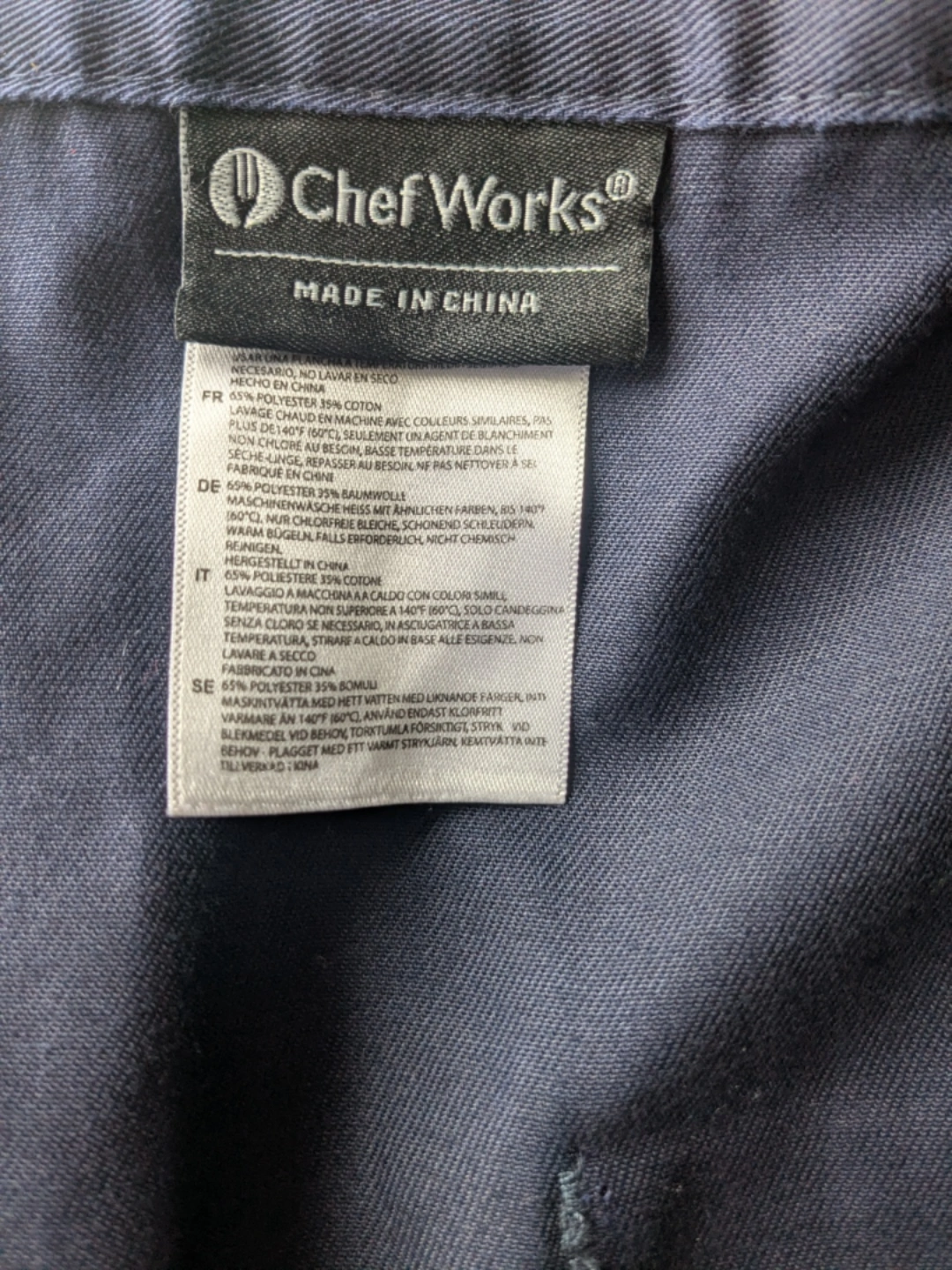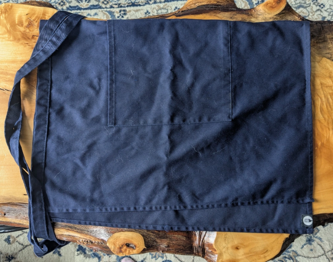 Dark blue half apron with no stains, adjustable and should fit all sizes. Features two deep pockets, stain resistant material, and absolutely no stains!