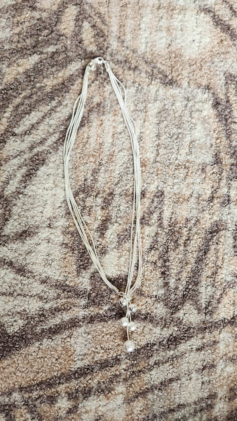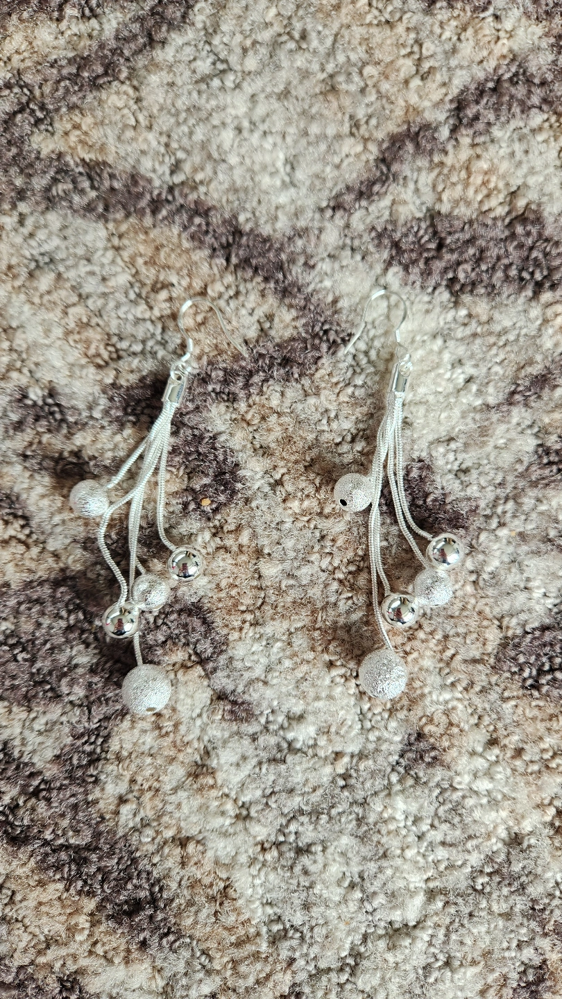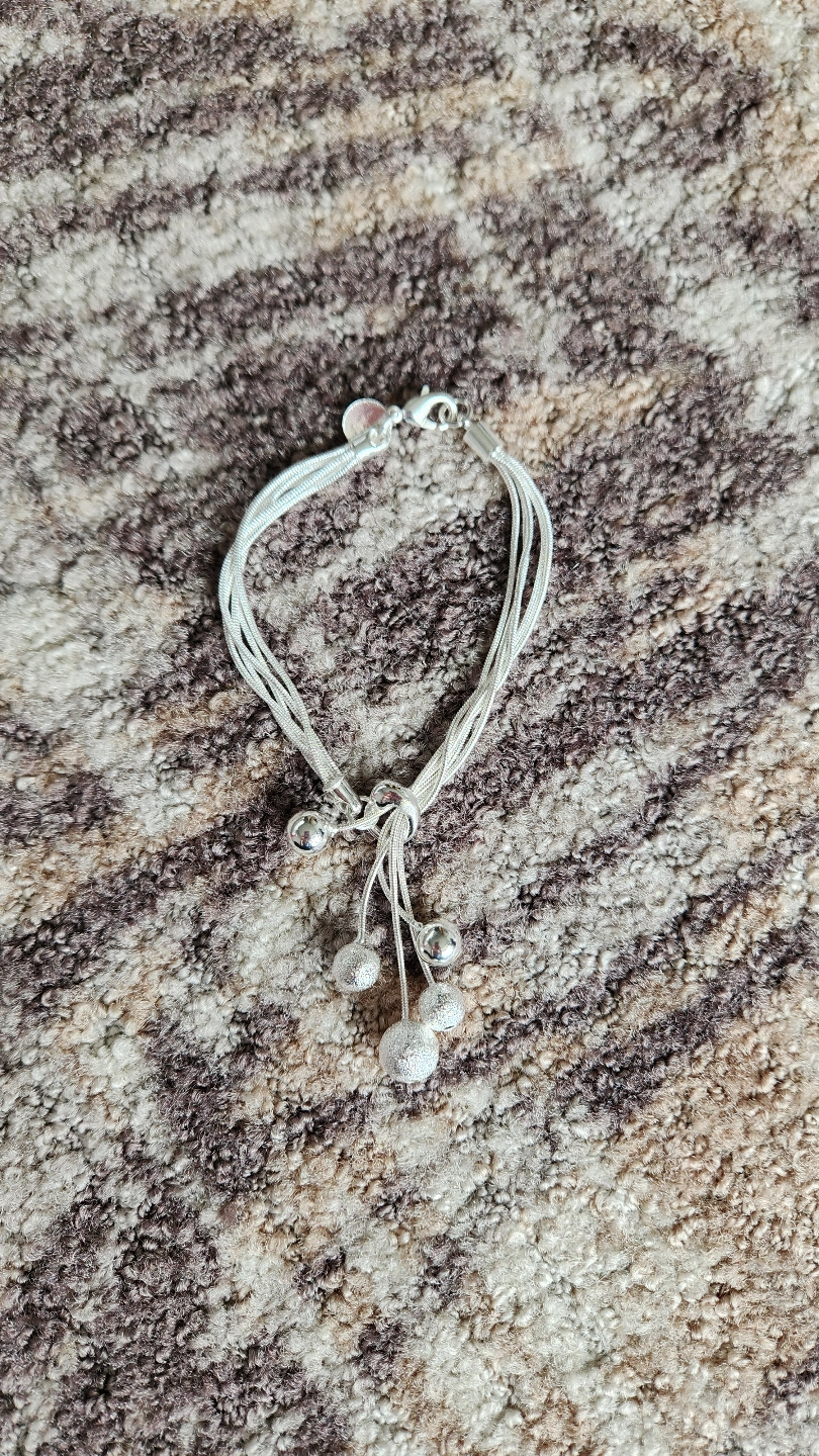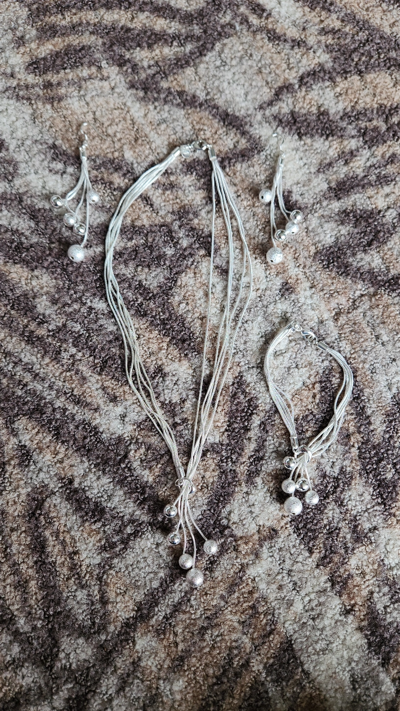 Beautiful silver tone jewellery set. Includes necklace, bracelet, and earrings. Matching design features delicate chains and textured ball accents. Elegant and stylish.