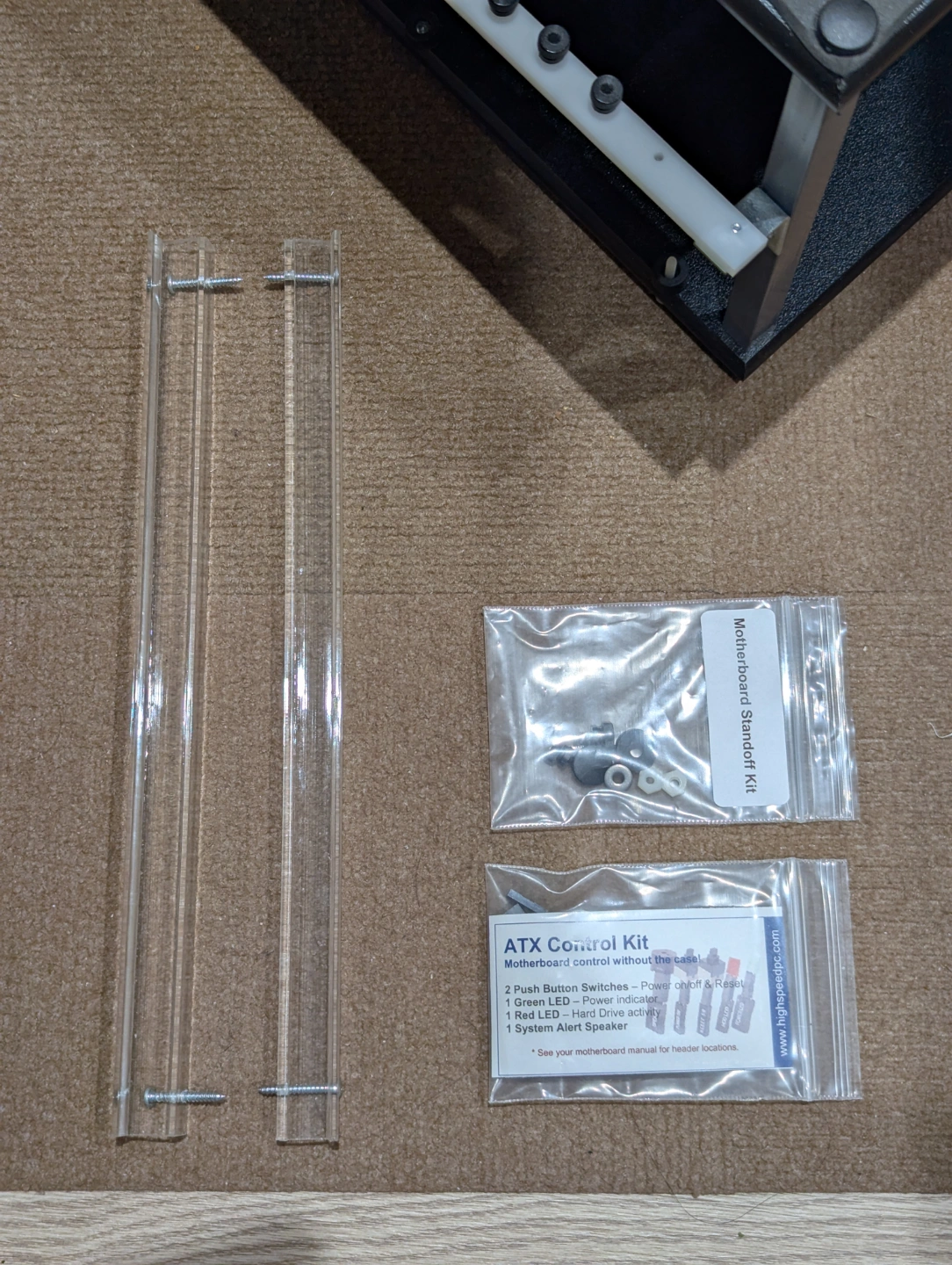 - ATX Control Kit: 2 push buttons, 1 green LED, 1 red LED, 1 system speaker