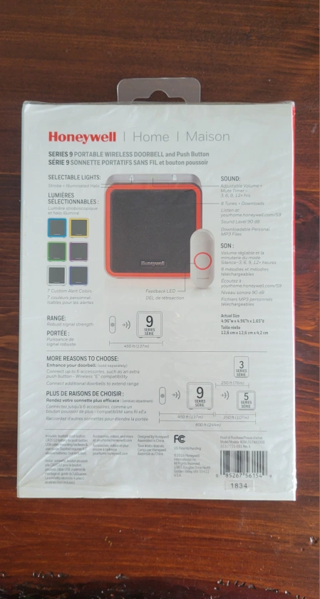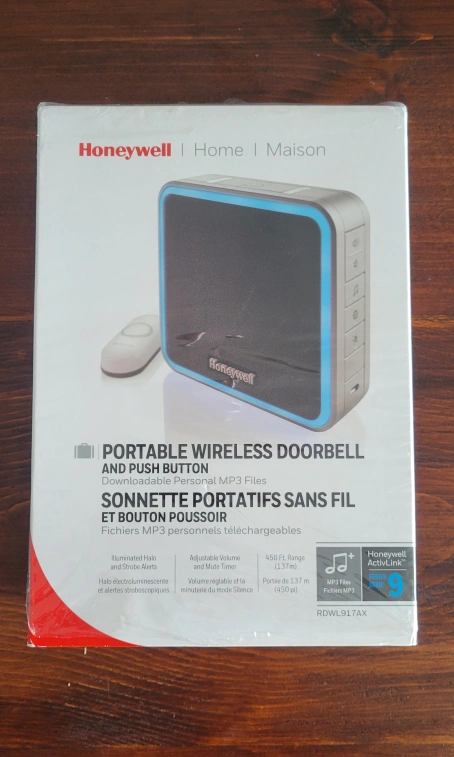 Used with box. Portable wireless doorbell with push button. Includes receiver, push button, mounting hardware, and instructions. Features adjustable volume and selectable lights. Downloadable MP3 files.