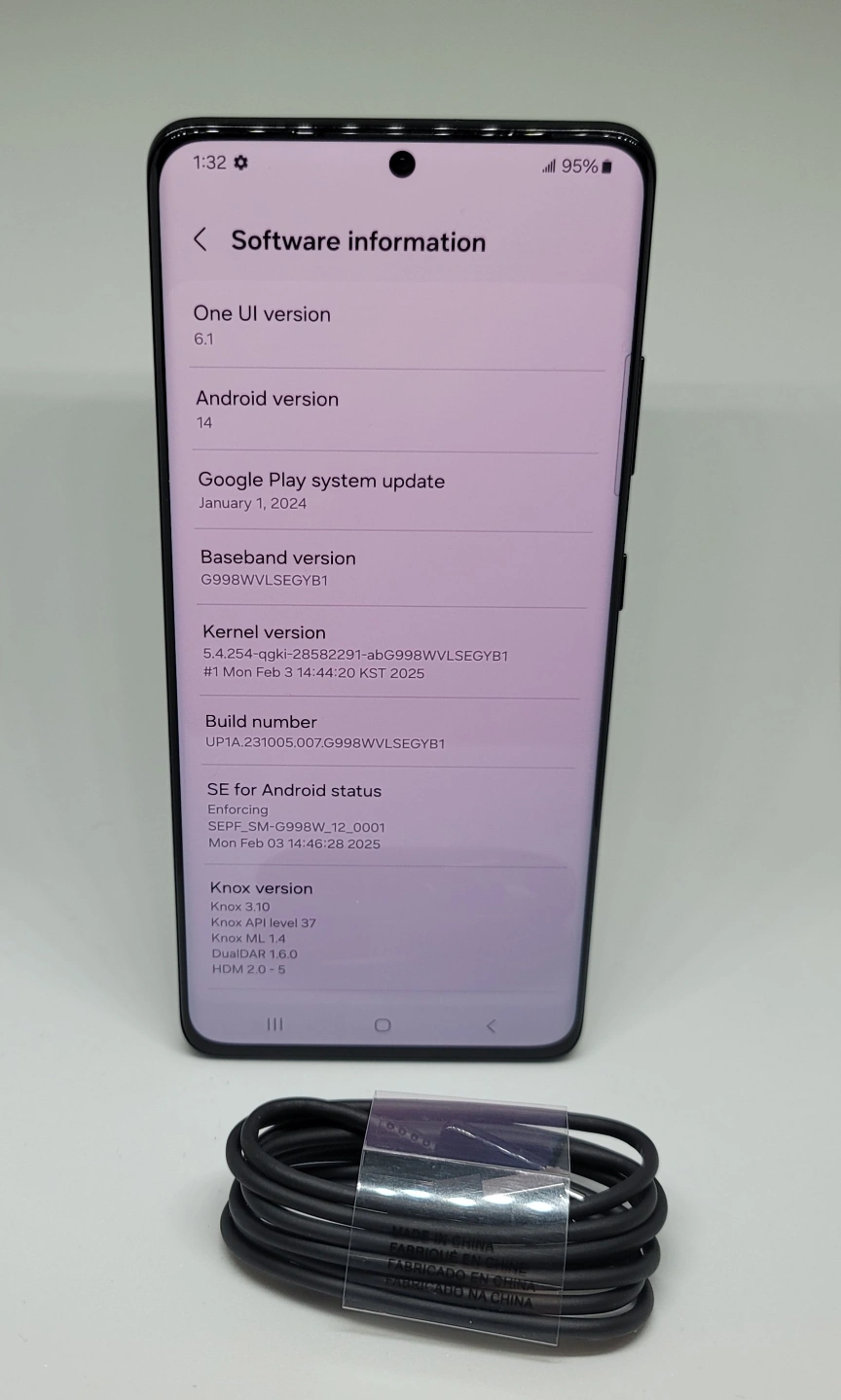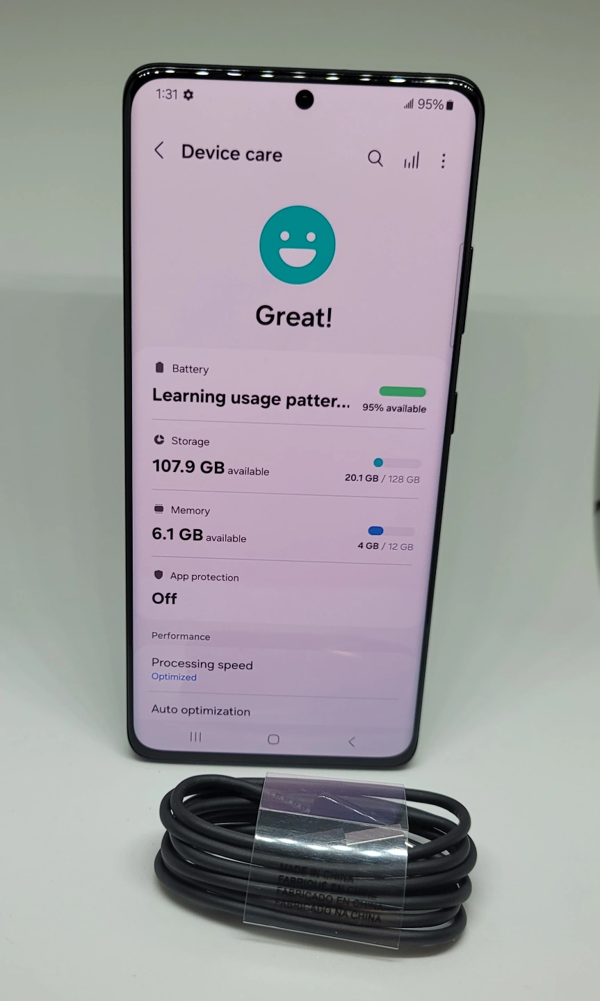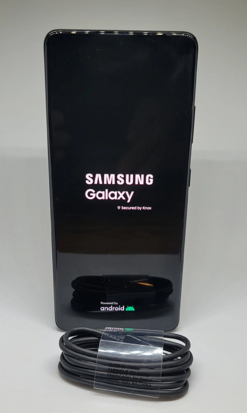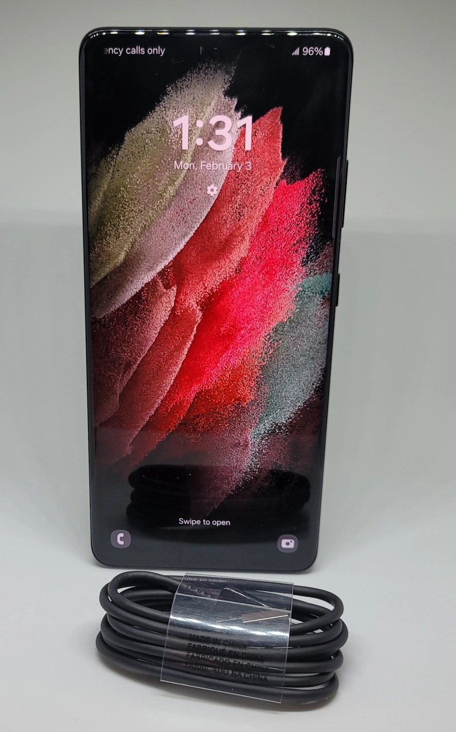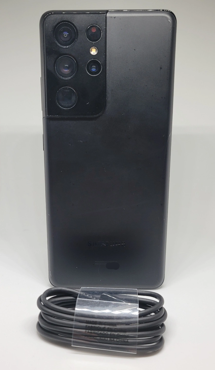 Used Samsung Galaxy S21 Ultra smartphone. 128 GB storage. Black colour. Includes charging cable.