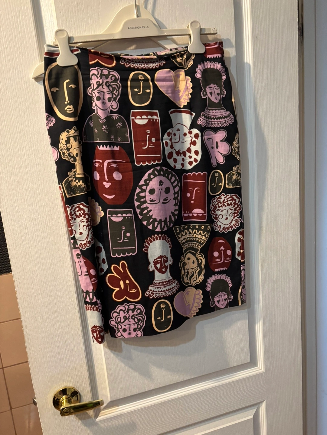 Fun, colourful pencil skirt. Features a unique print of stylized faces and figures. Zipper closure. Excellent condition. CASH ONLY