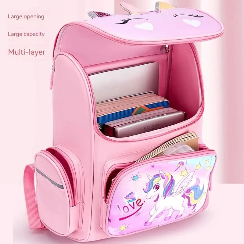 Cute pink backpack. Features a unicorn design. Multi-layer design. Large capacity. Perfect for school.
