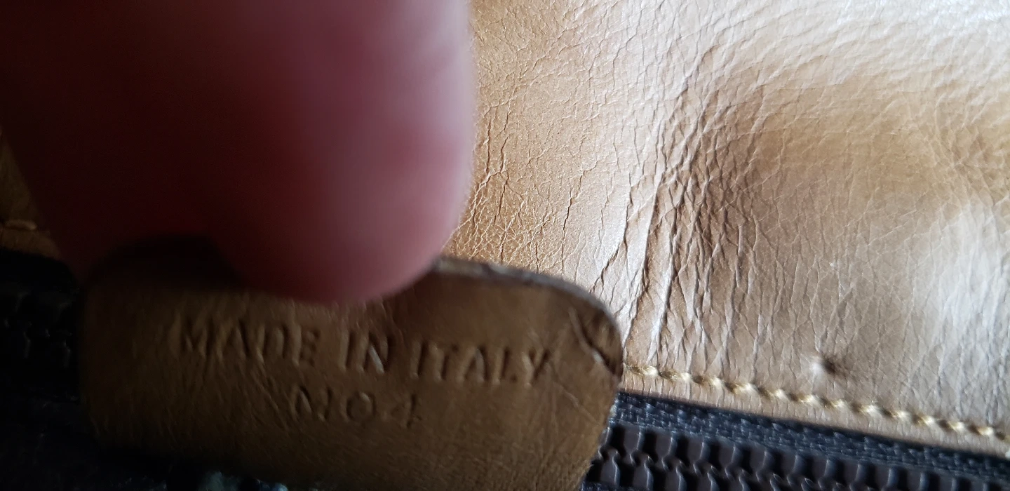 Exterior: pvc has some discolouration along perimeter, leather has been rubbed in spots along base, strap has significant wear (rubbed along u/s where worn against shoulder and there's minor cracking), some tarnishing on gold hardware;