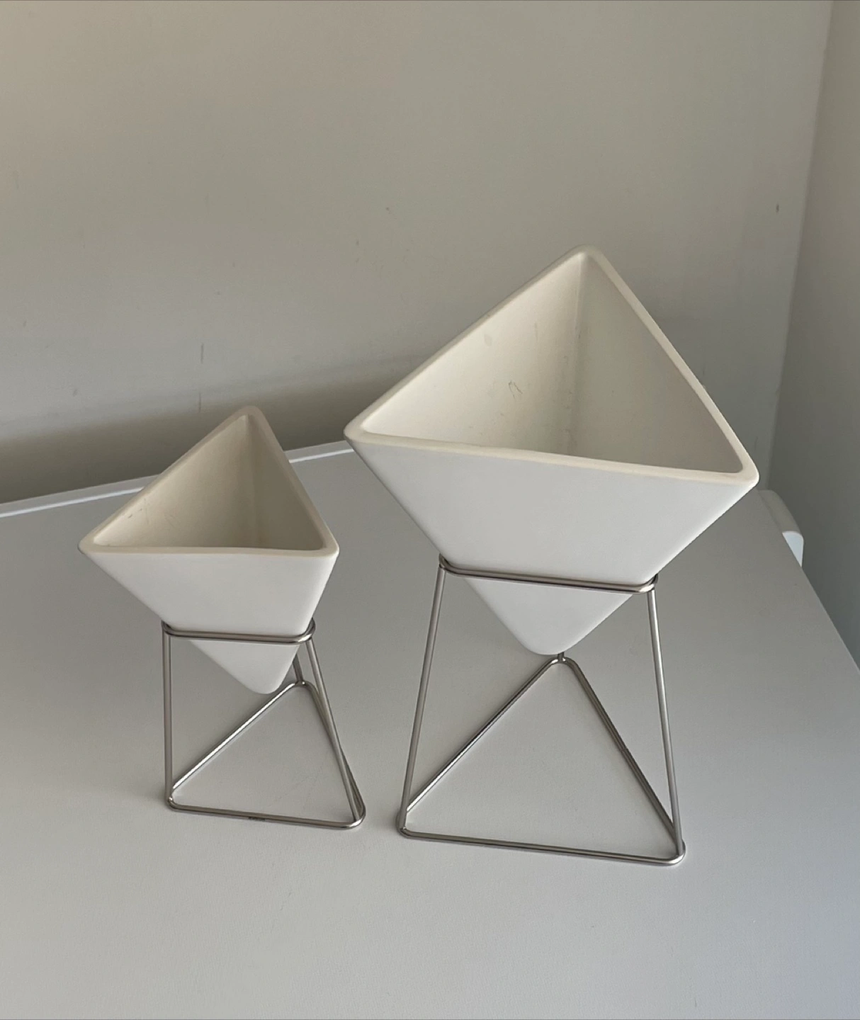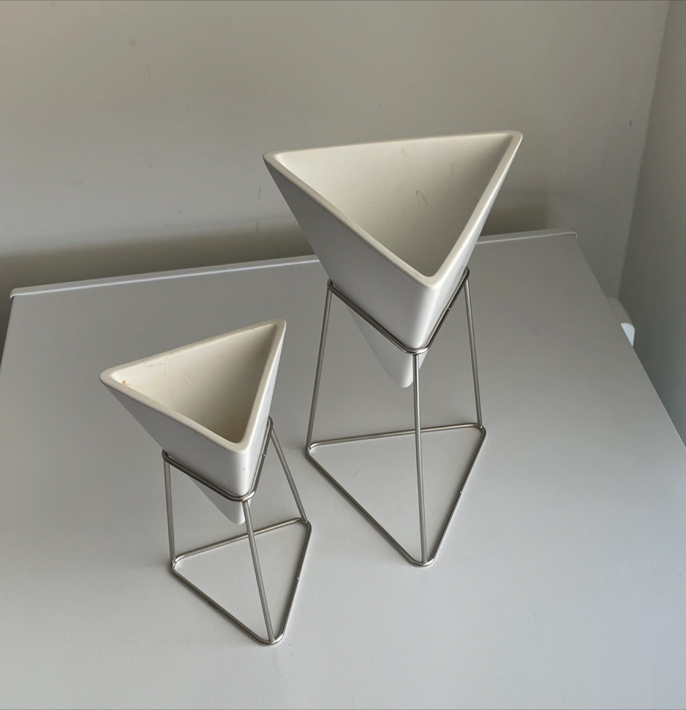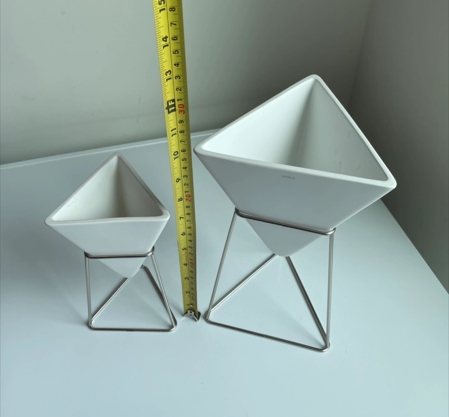 Add a touch of modern elegance to your home with this used set of two Umbra Trigg Desktop Planters with geometric metal stands. These stylish planters are perfect for small succulents, air plants, or cacti, bringing a minimalist yet eye-catching accent to any desk, shelf, or windowsill.