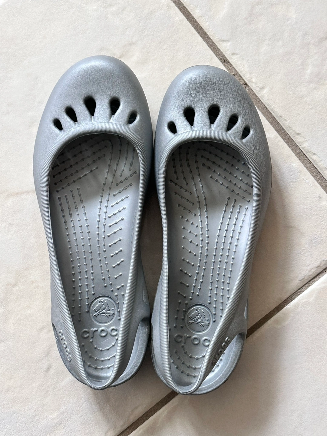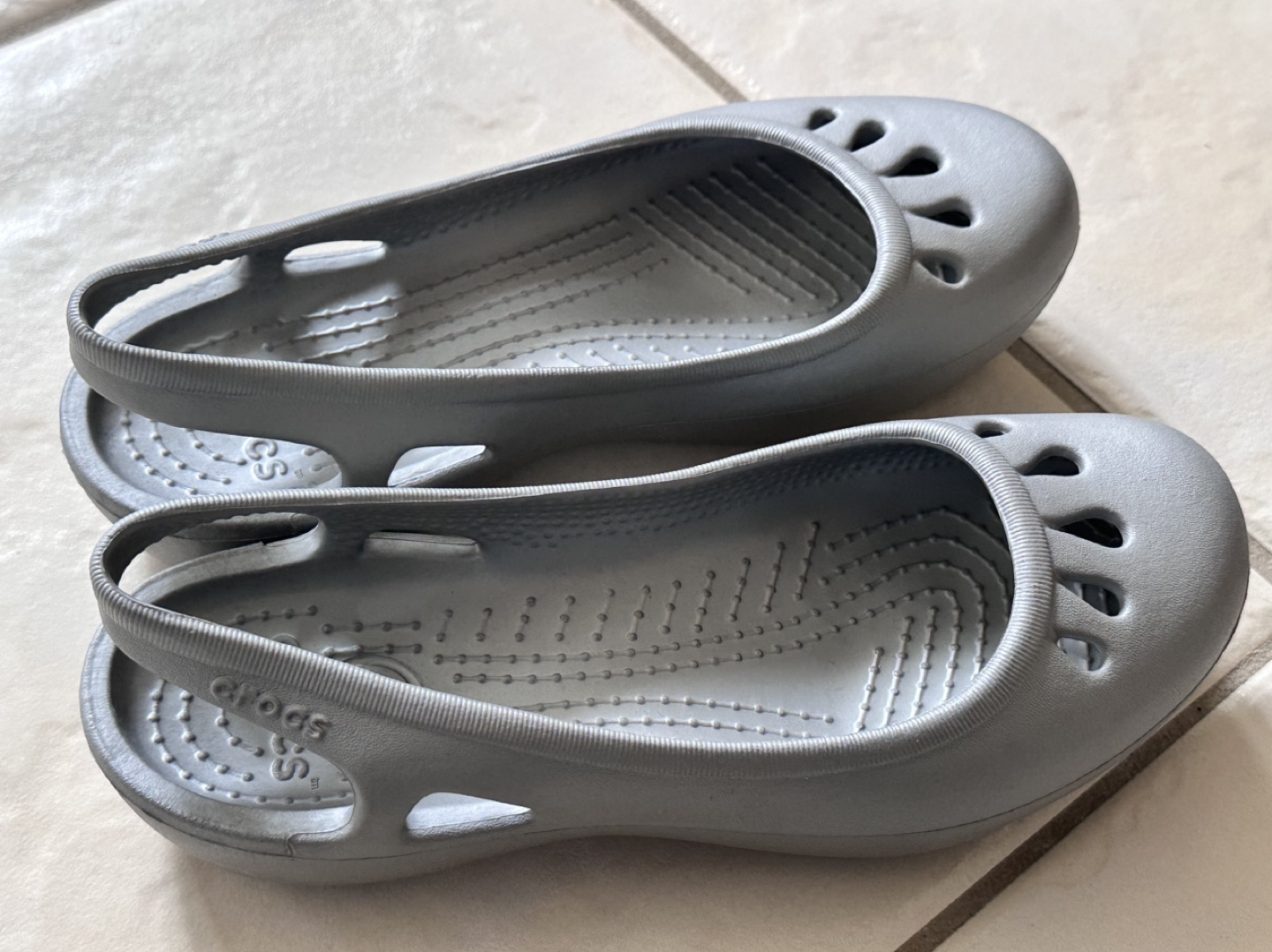 Silver Crocs slingback flats. Lightweight and comfortable. Size 7. Minimal wear.