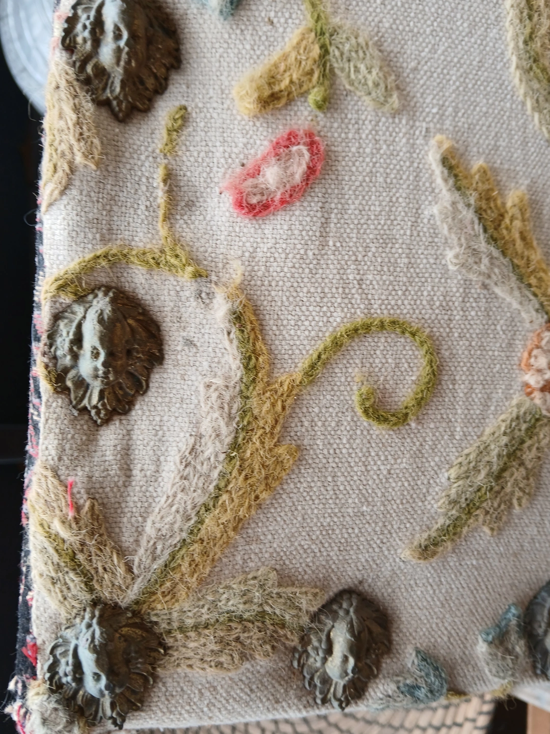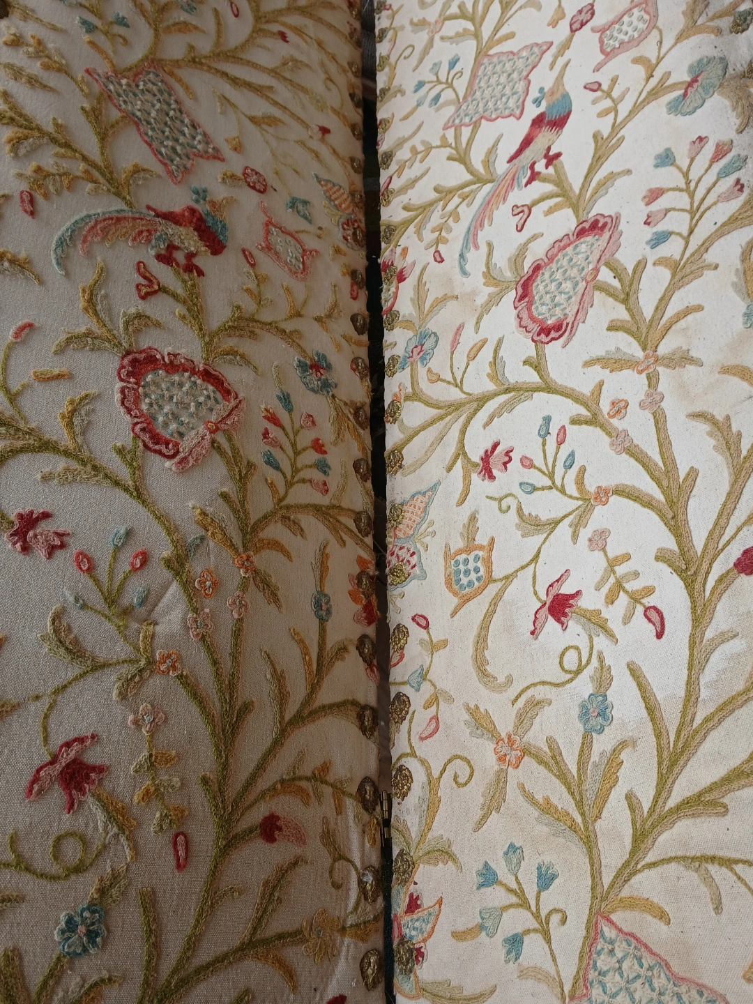 4 panels antique embroidered Crewel . Floral pattern. Features ornate detailing. Show some wear