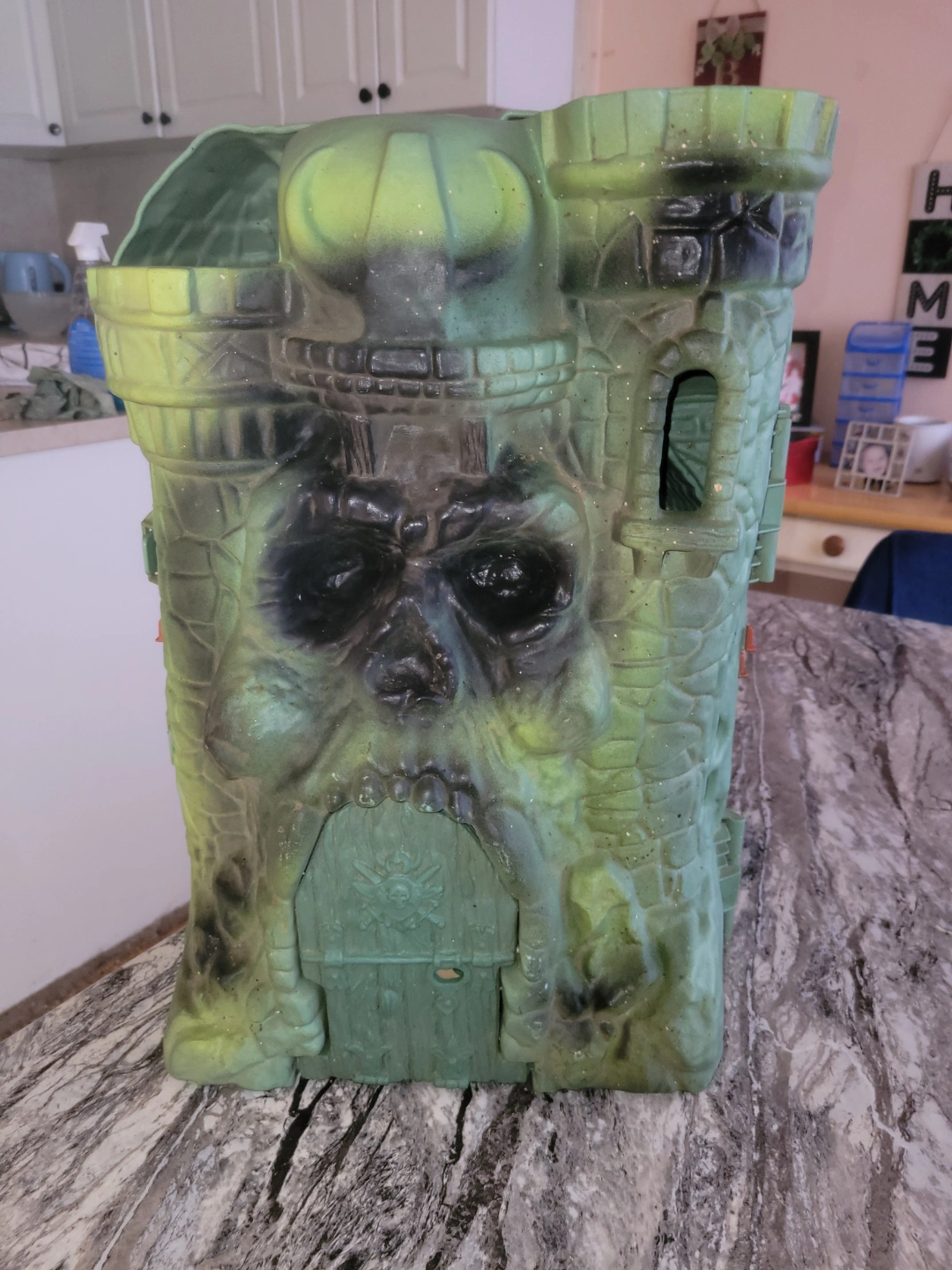 Vintage Masters of the Universe Terror Claws Castle playset. Green plastic construction. Features a skull face and small door. Some wear and tear.