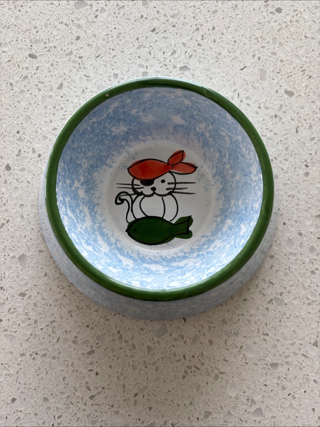 Adorable cat bowl. Features a cute illustration of a cat wearing a bandana and holding a fish. Made in Portugal, exclusively for Primark. Small size, ideal for pet food or treats.
