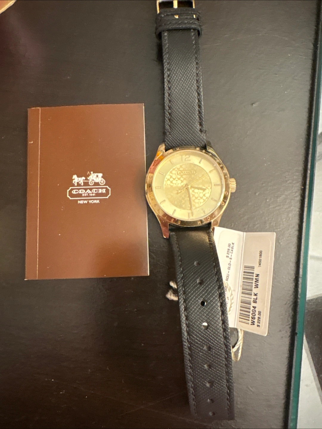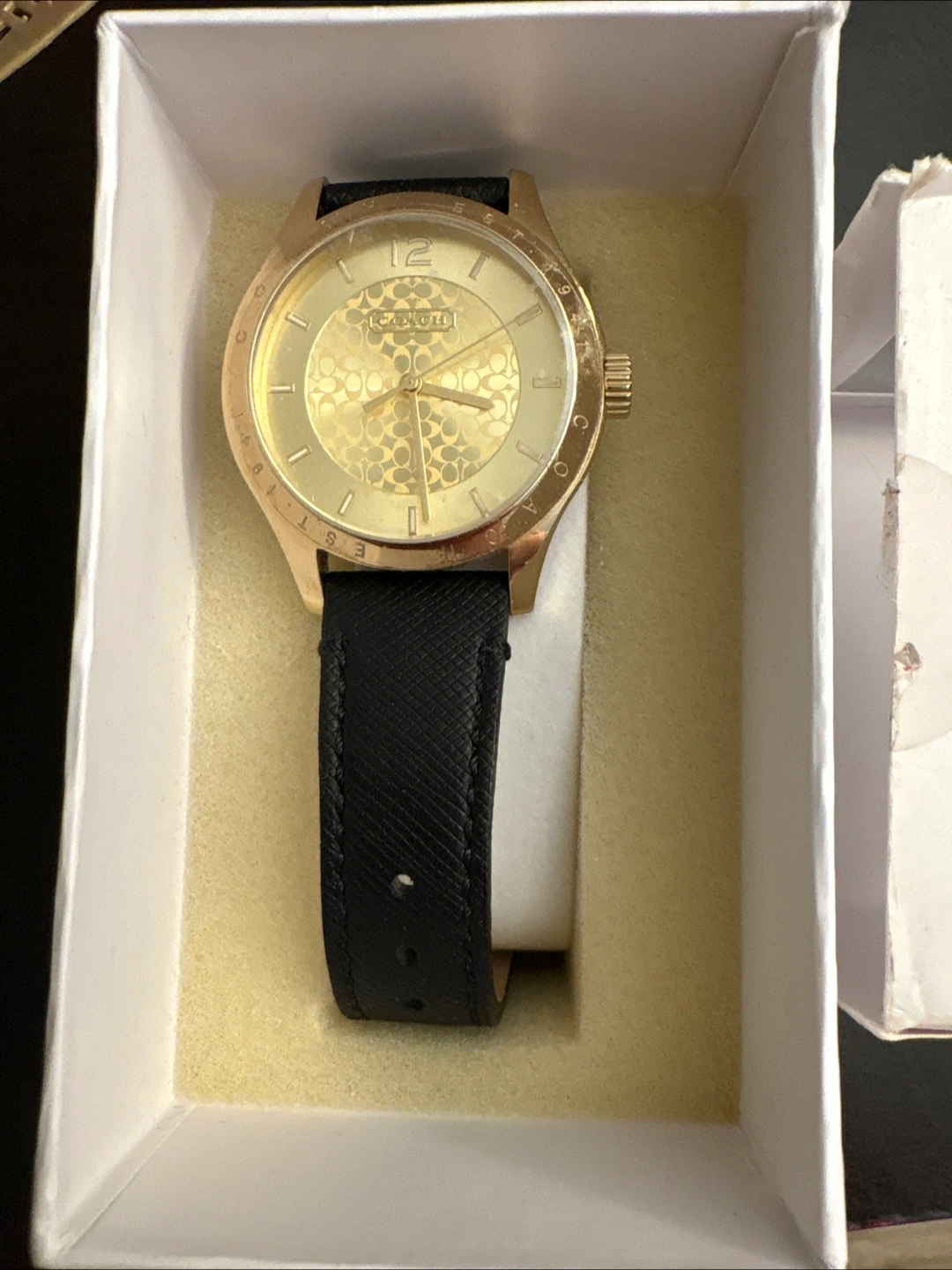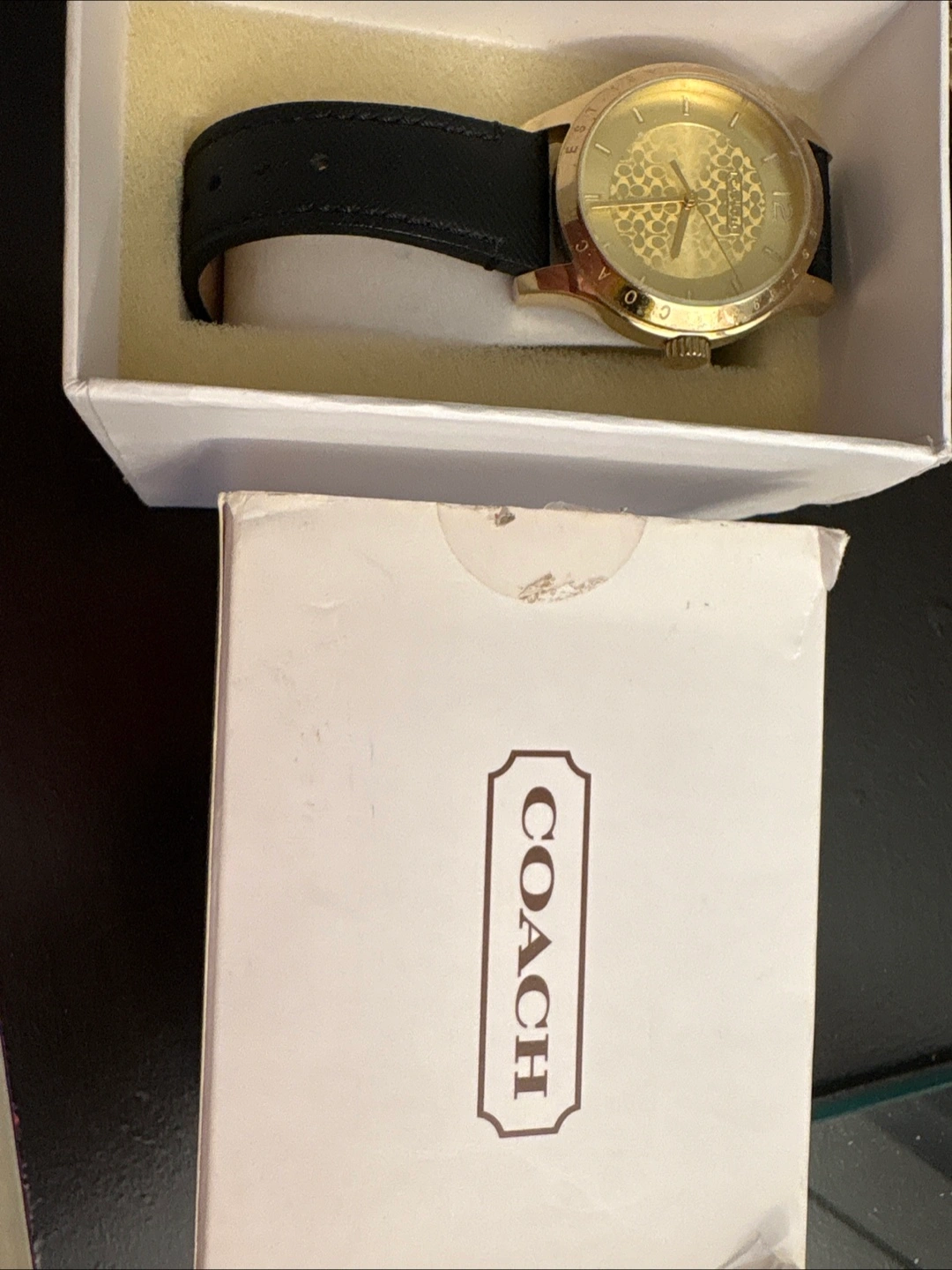 Coach Women's wristwatch. Gold tone case and hands. Black leather band. Comes in original box. Coach branding on face and box.