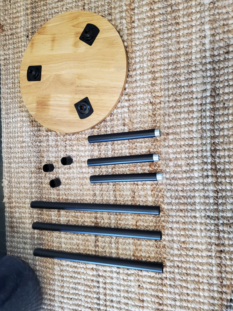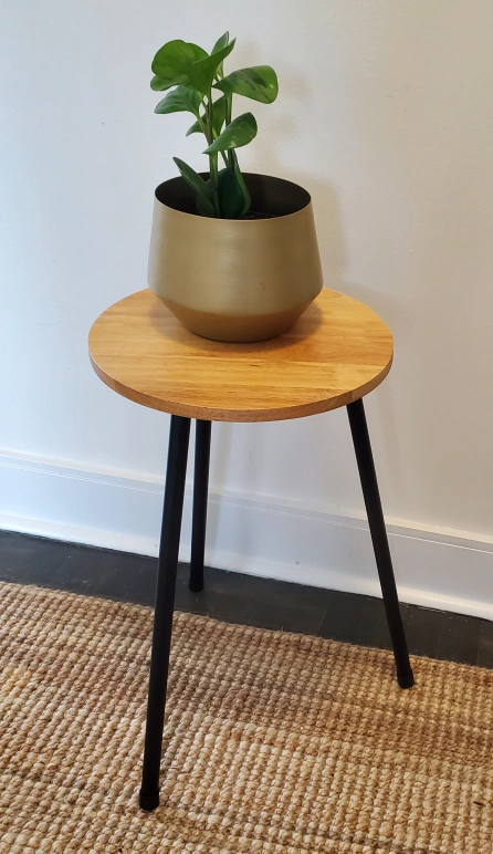 Small round plant stand. Wooden top and black metal legs. Easy assembly. Perfect for small plants or decorative items.