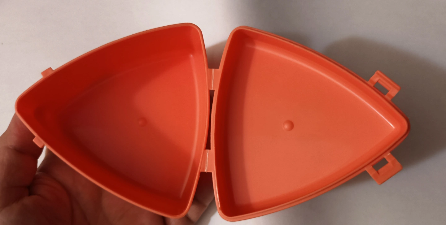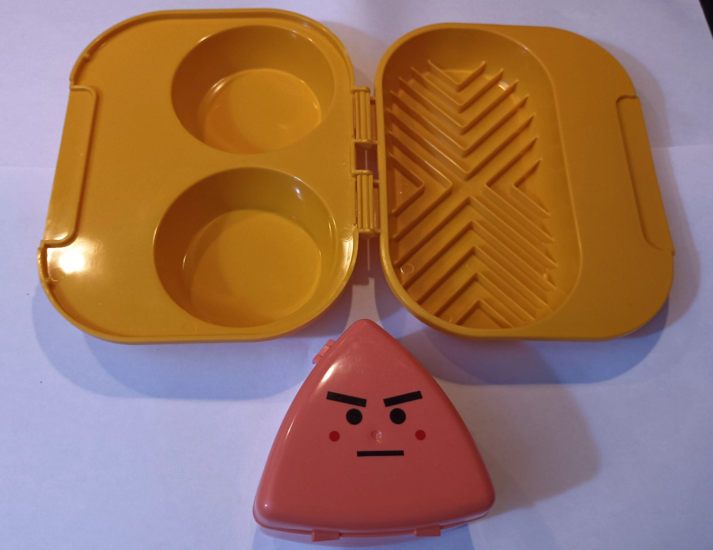Set of three vintage plastic food containers. Includes a yellow two-cup egg cooker and a pink triangular sandwich cutter.