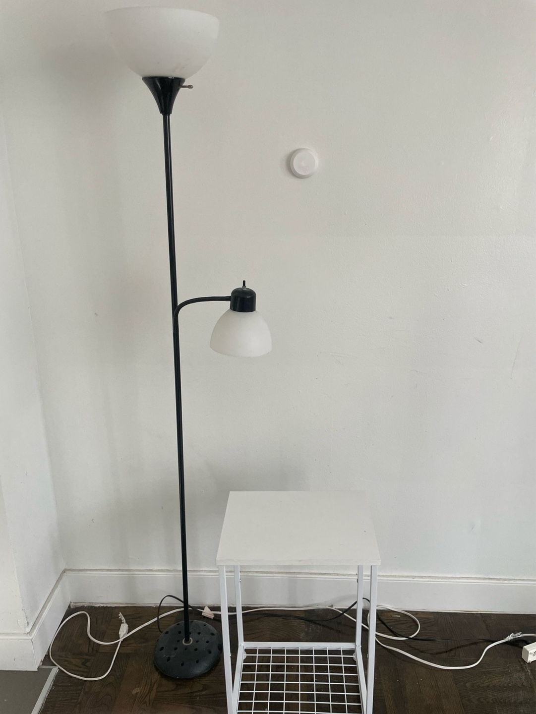 Modern floor lamp, two lights, black metal. Simple white side table, metal frame. Both in good condition.