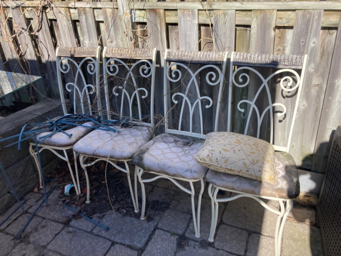 Four outdoor chairs. Ornate metal frame. Cream coloured cushions. Some wear and tear.