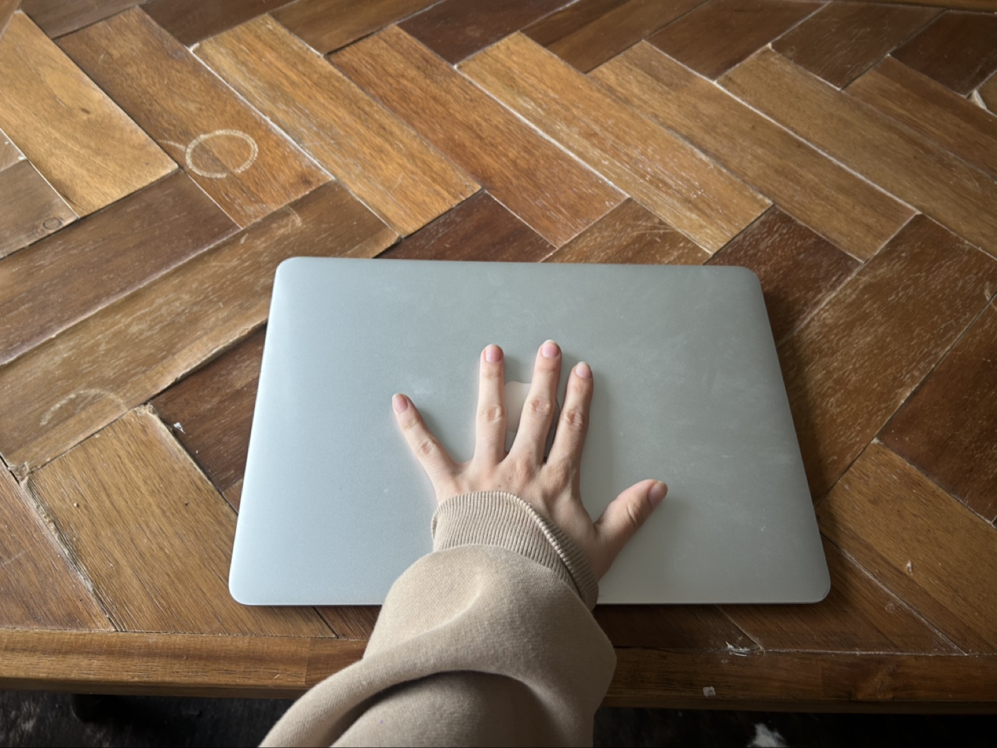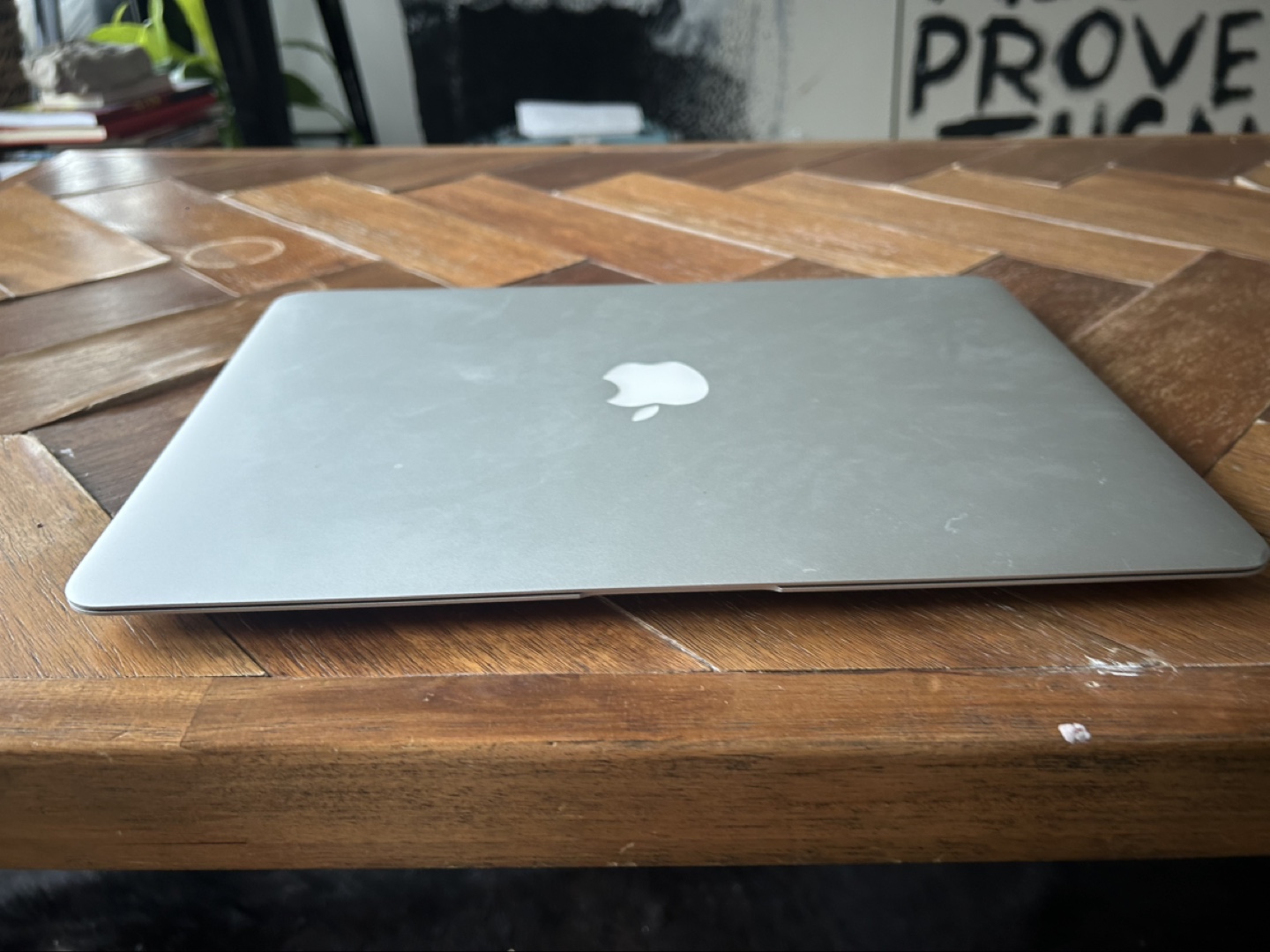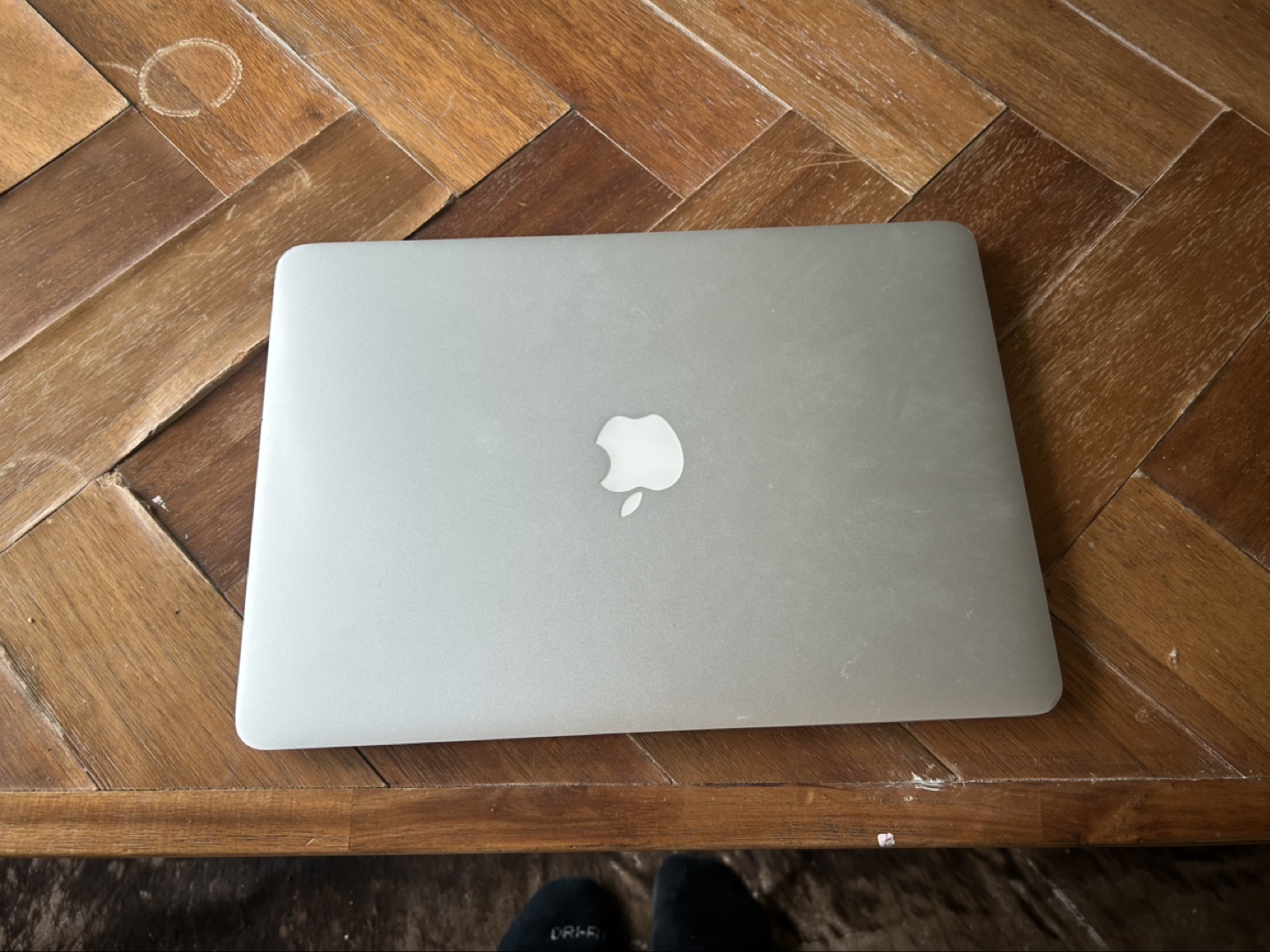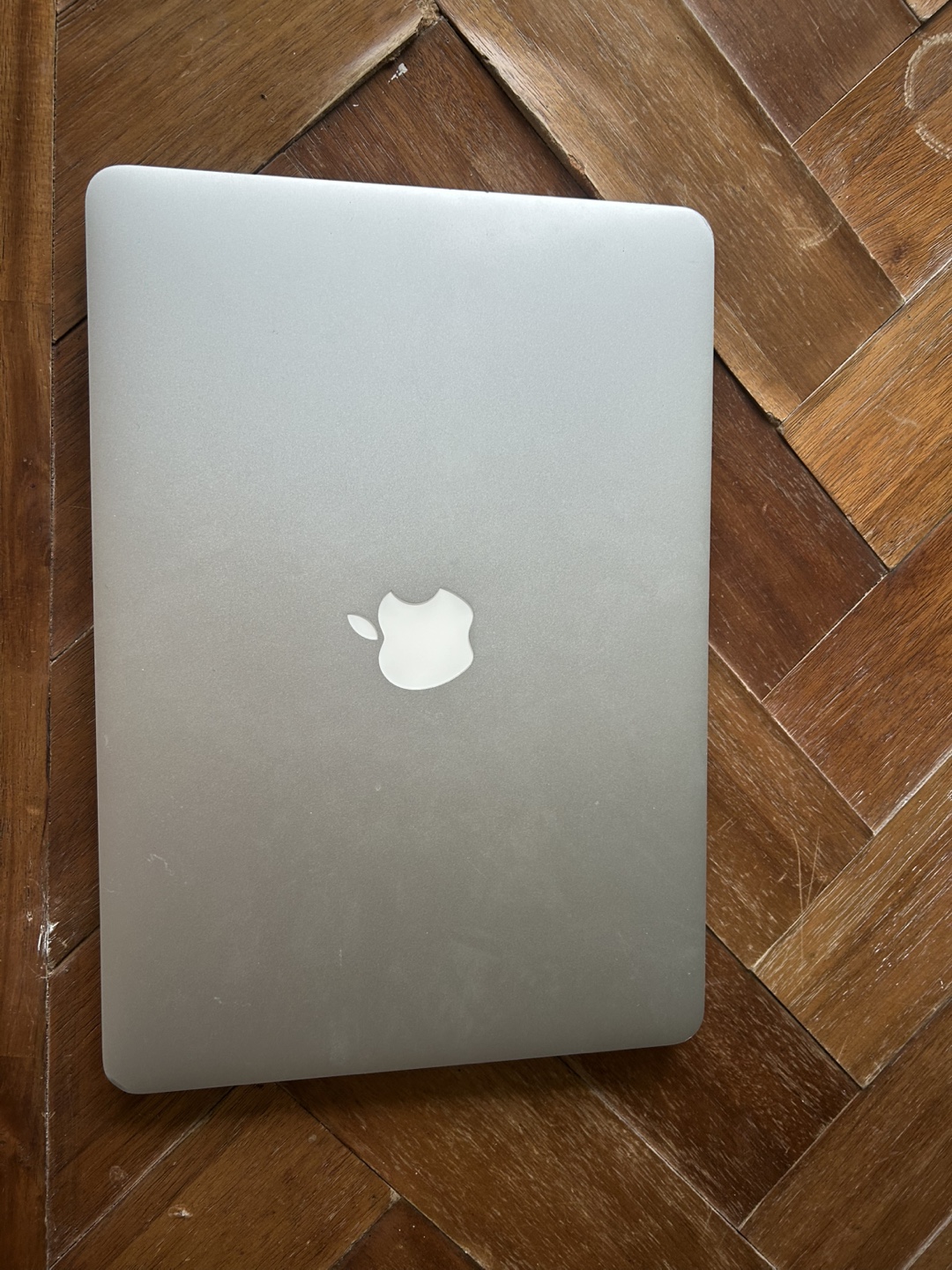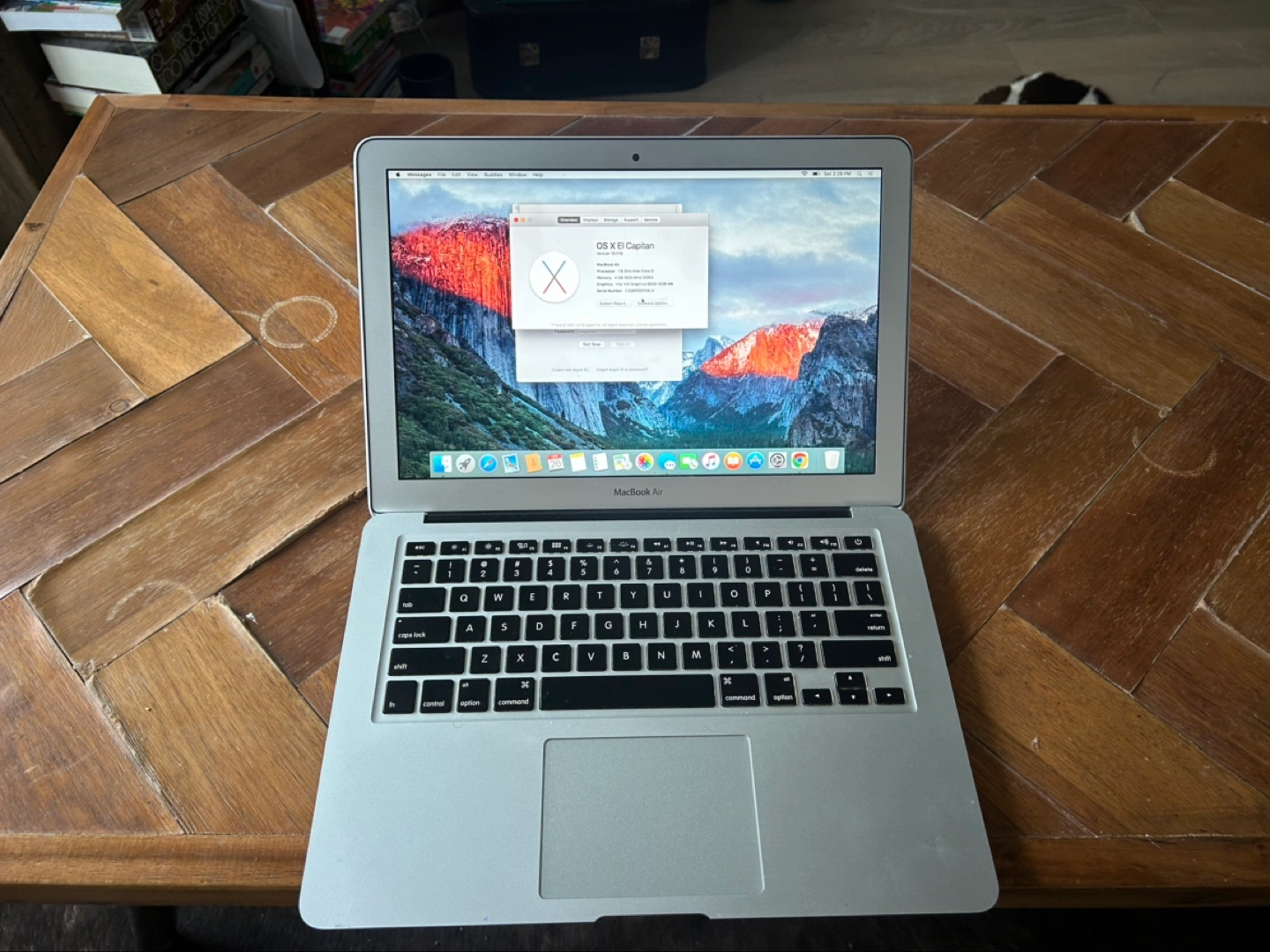 Older model MacBook Air. Silver aluminium body. 13-inch screen. Runs OS X El Capitan.