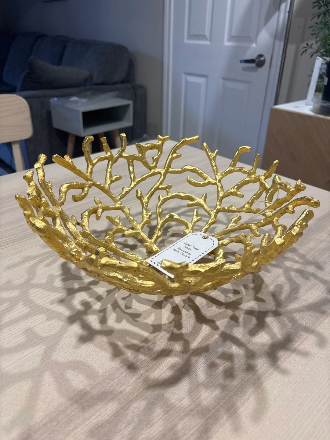 Gold-coloured metal bowl. Unique coral design. Perfect for keys, jewellery, or fruit. Decorative piece.
