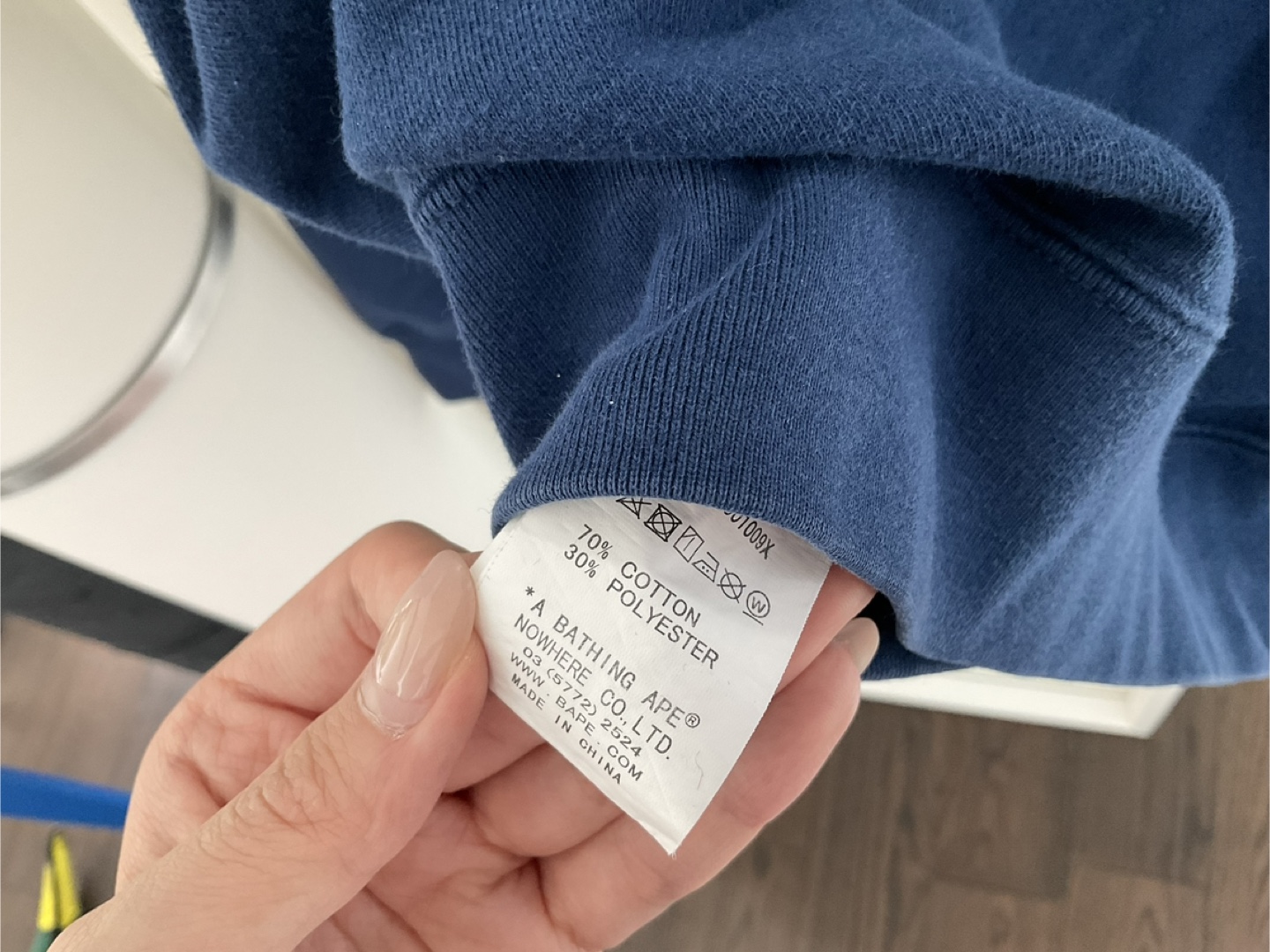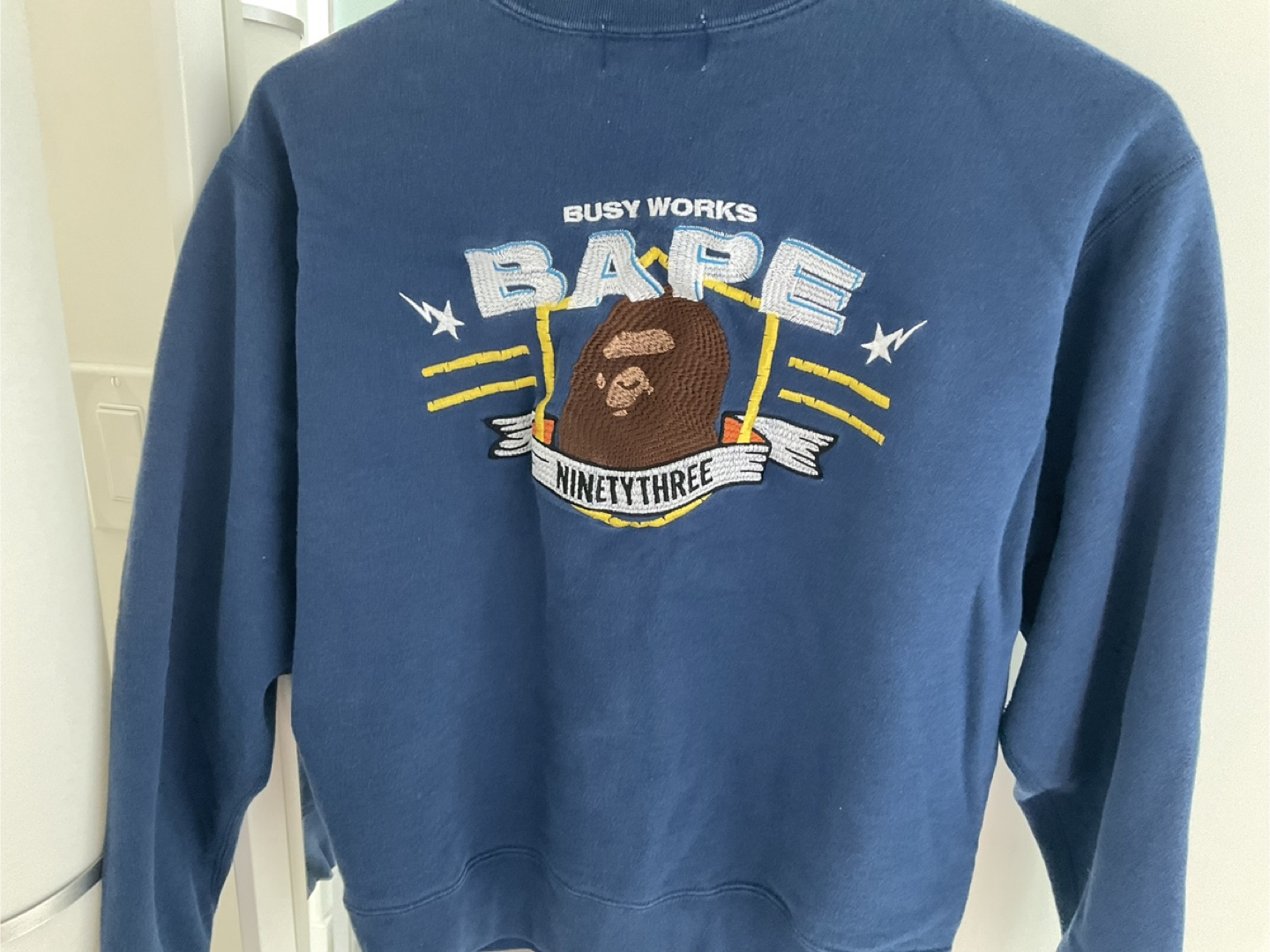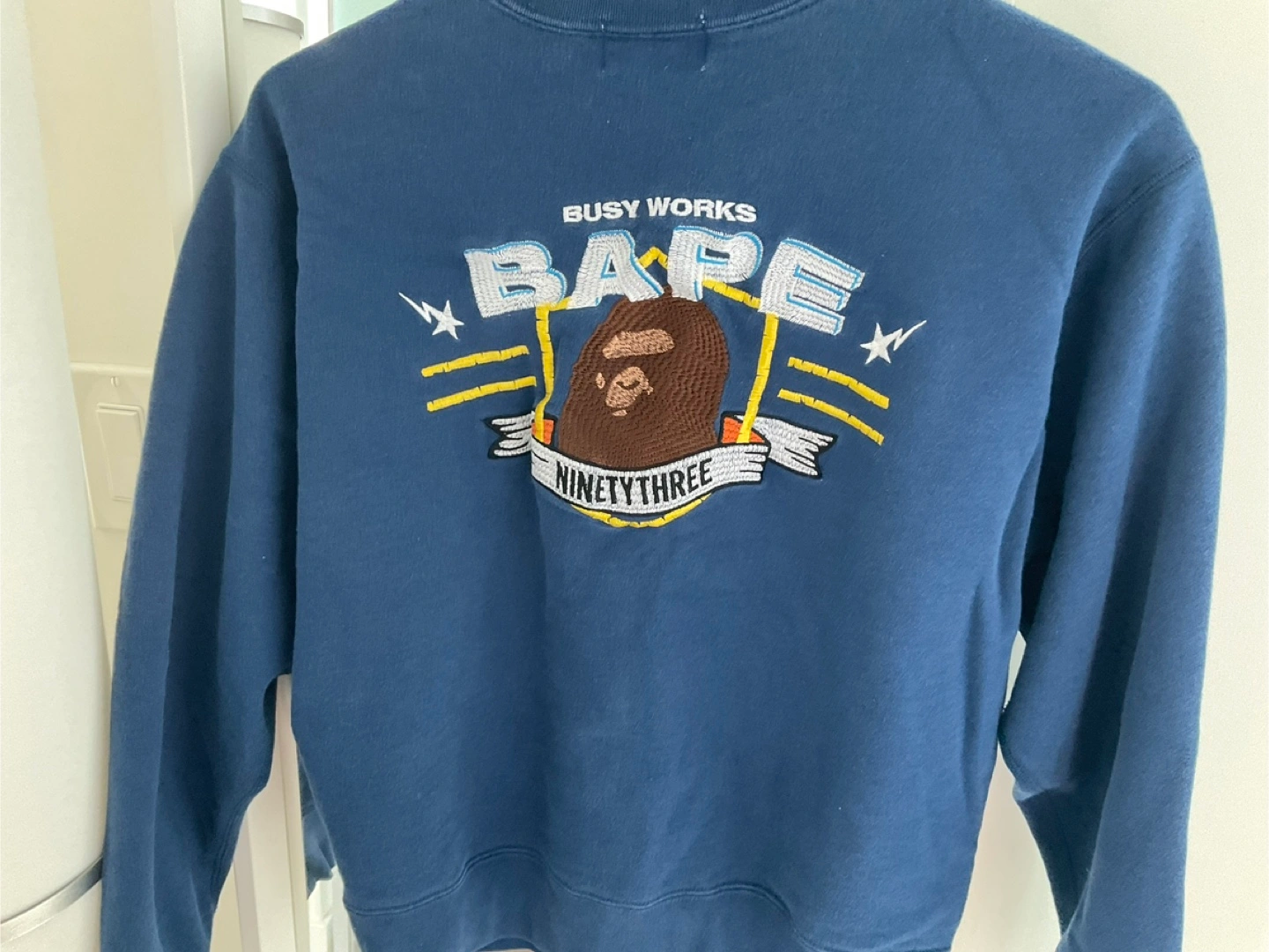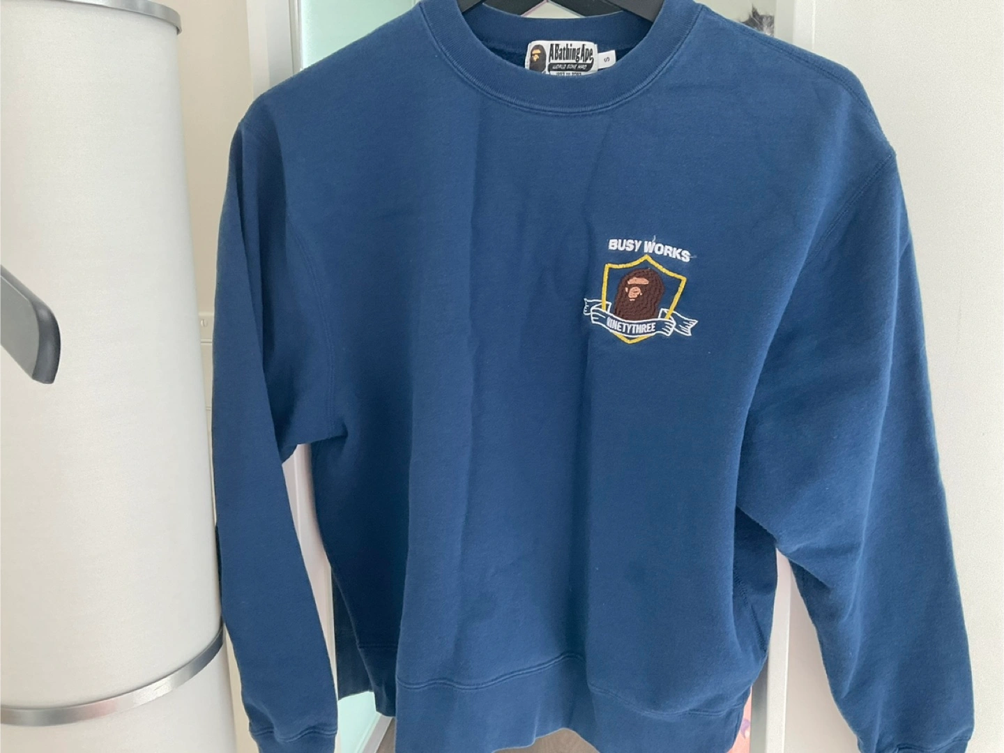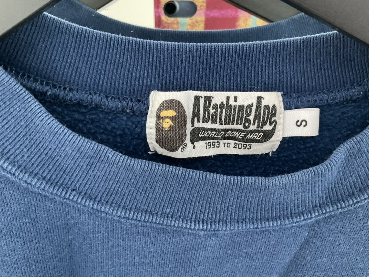 Navy blue A Bathing Ape crewneck sweatshirt. Size small. 70% cotton, 30% polyester.