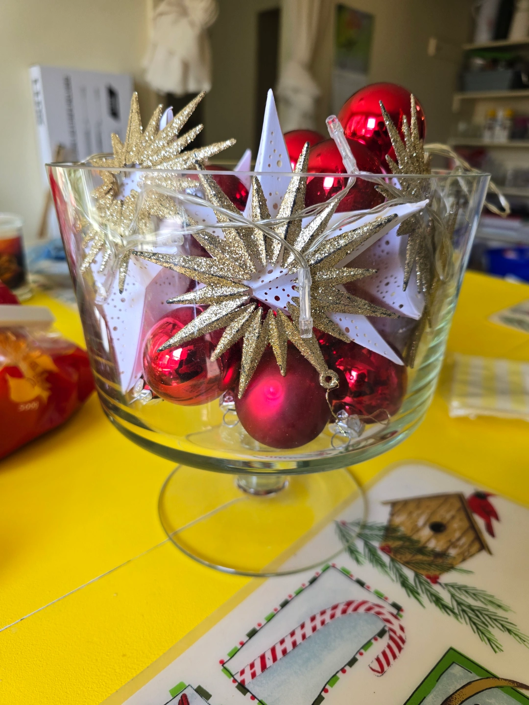 Set of red glass Christmas ornaments and sparkly gold and white star decorations. Includes battery-operated fairy lights. Festive centrepiece for your holiday decor.