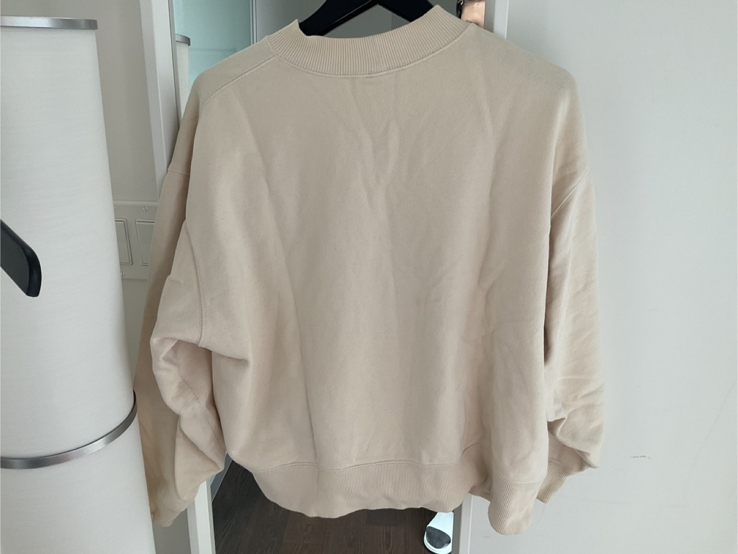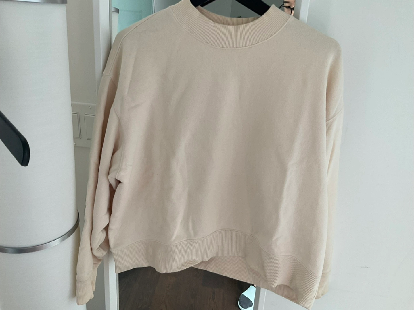 Relaxed-fit, cream-coloured crewneck sweatshirt. Size large. Soft fabric. Good for layering or wearing alone.